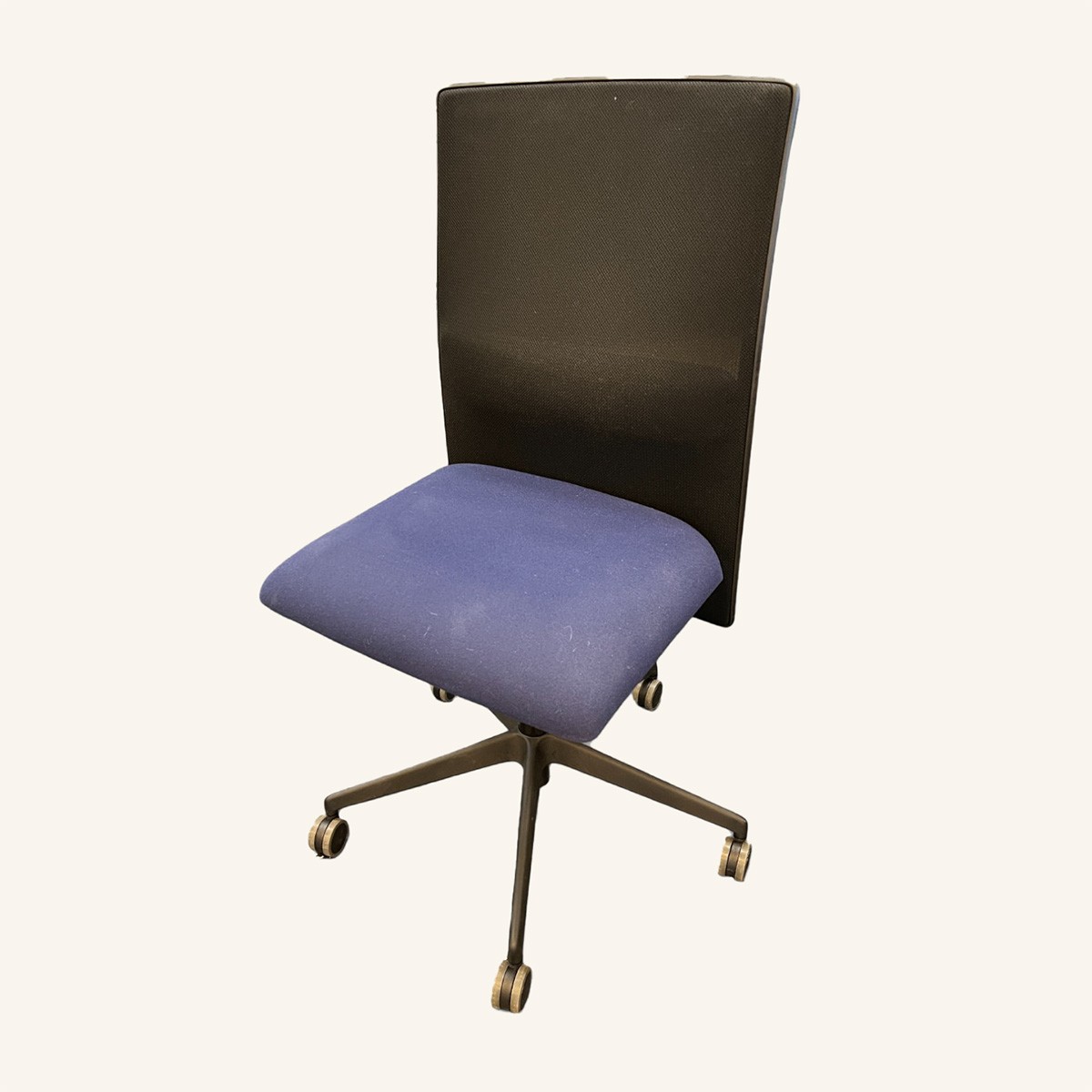 Sæde i stof (blå). Ryg i mesh (sort). Fodkryds i plast (sort). Højdejusterbar.