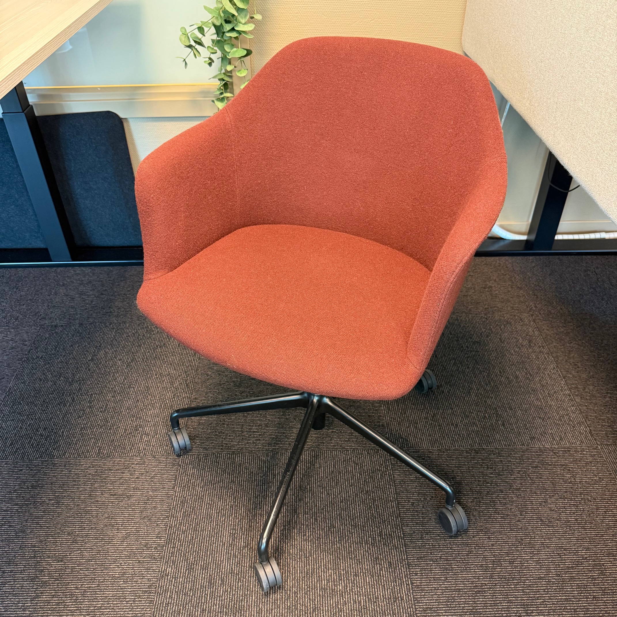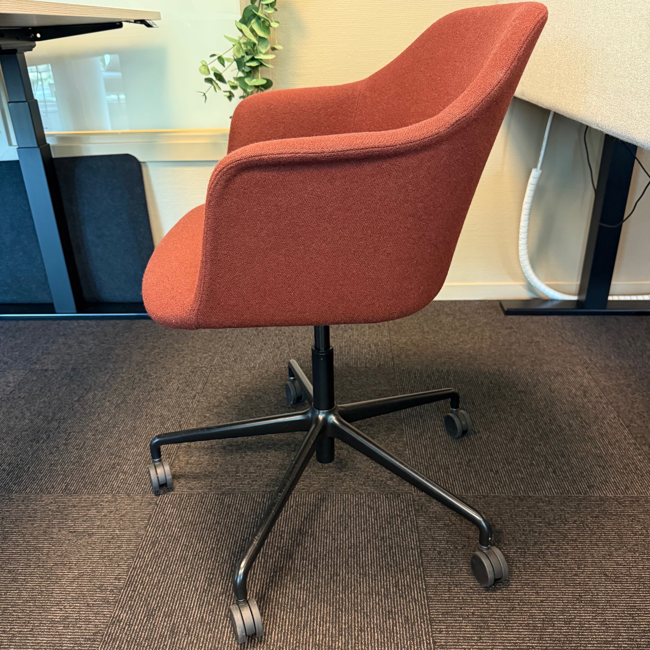 Sæde og ryg i stof (rød). Fodkryds i metal (sort). Højdejusterbar.