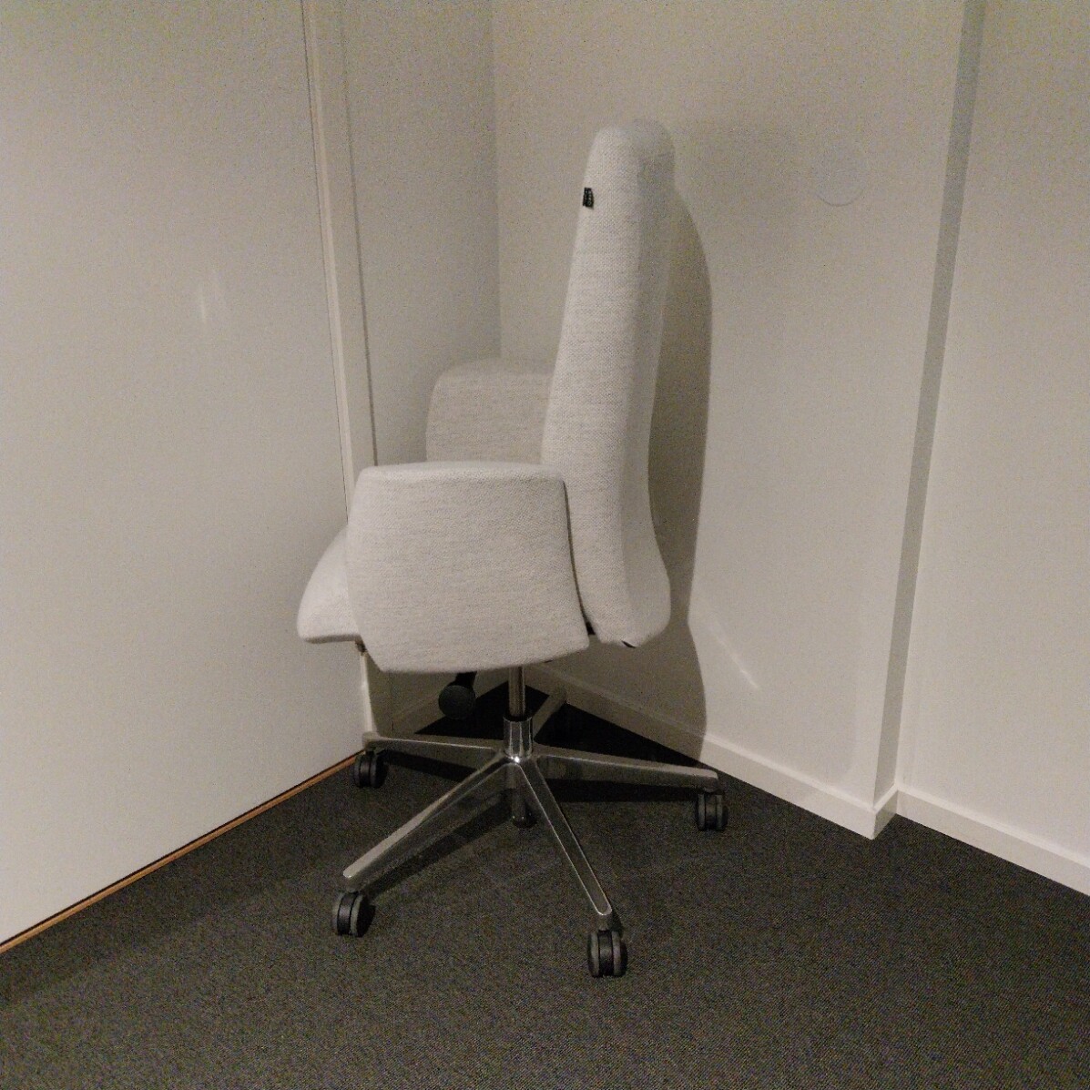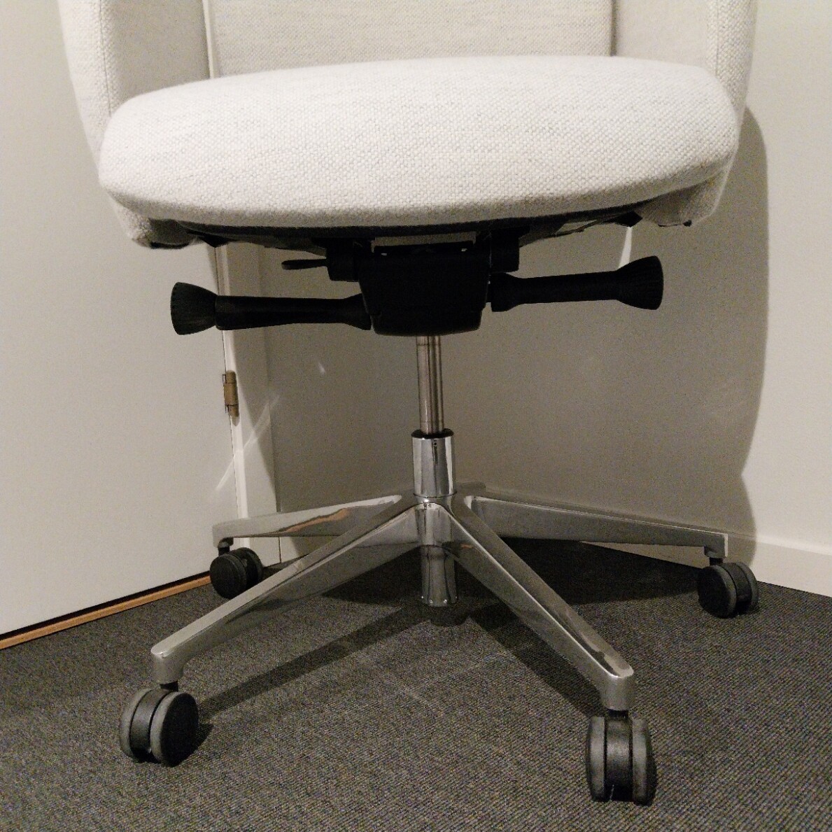 Sæde og ryg i stof (hvid). Fodkryds i metal (krom). Højdejusterbar.