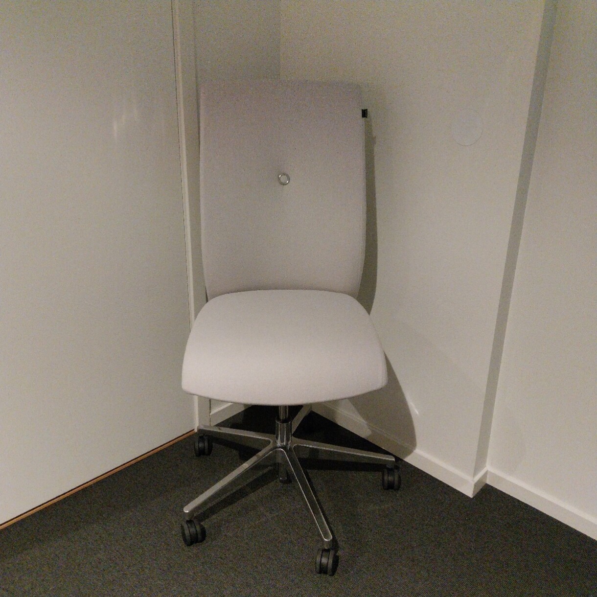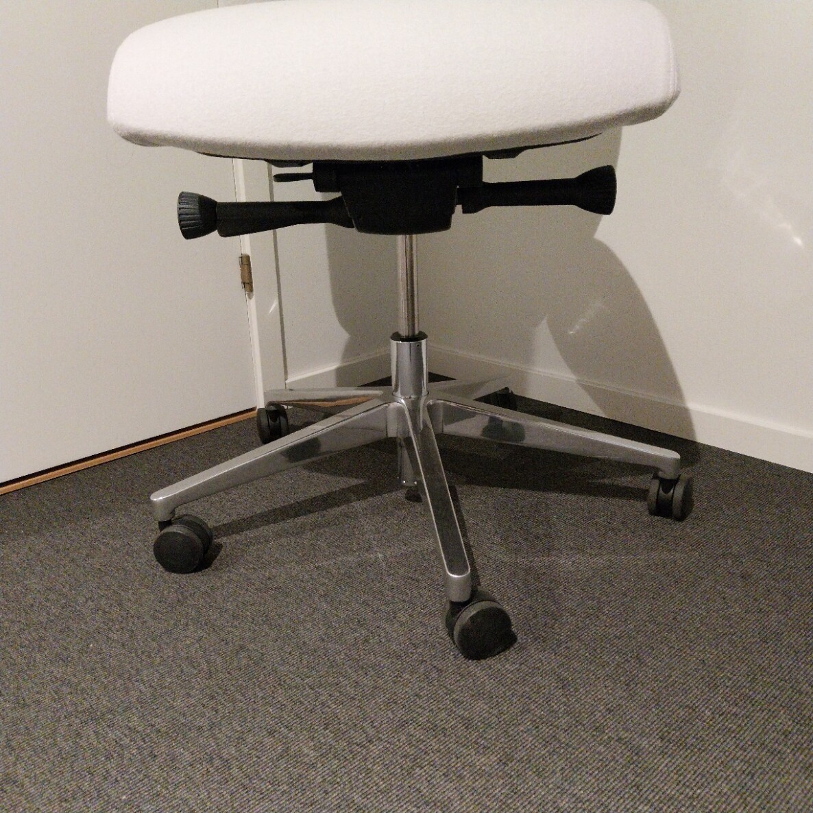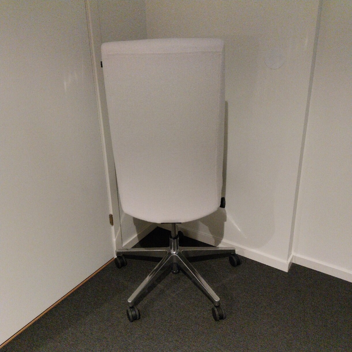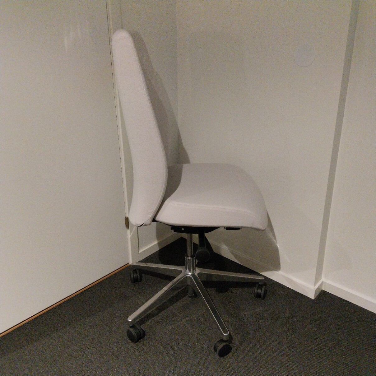 Sæde og ryg i stof (hvid). Fodkryds i metal (krom). Højdejusterbar.