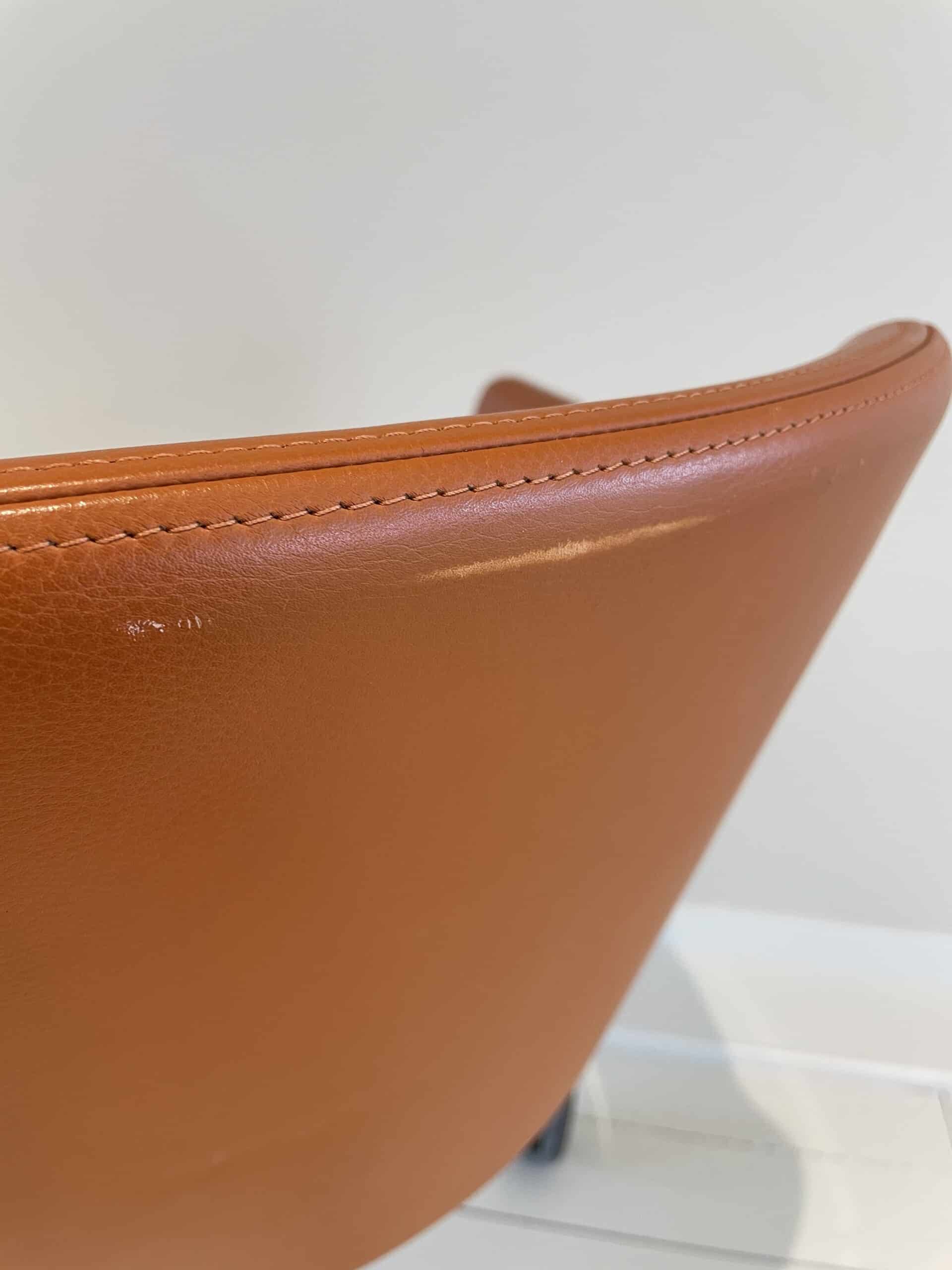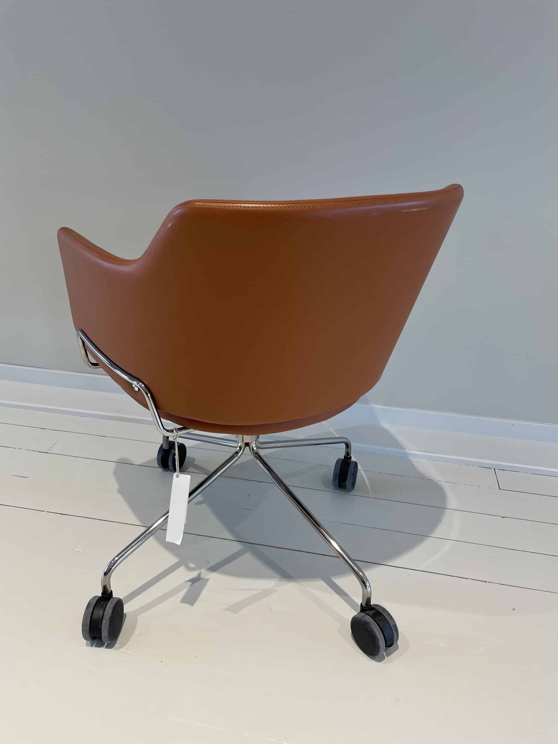 Sæde og ryg i læder (brun). Fodkryds i metal (krom).
