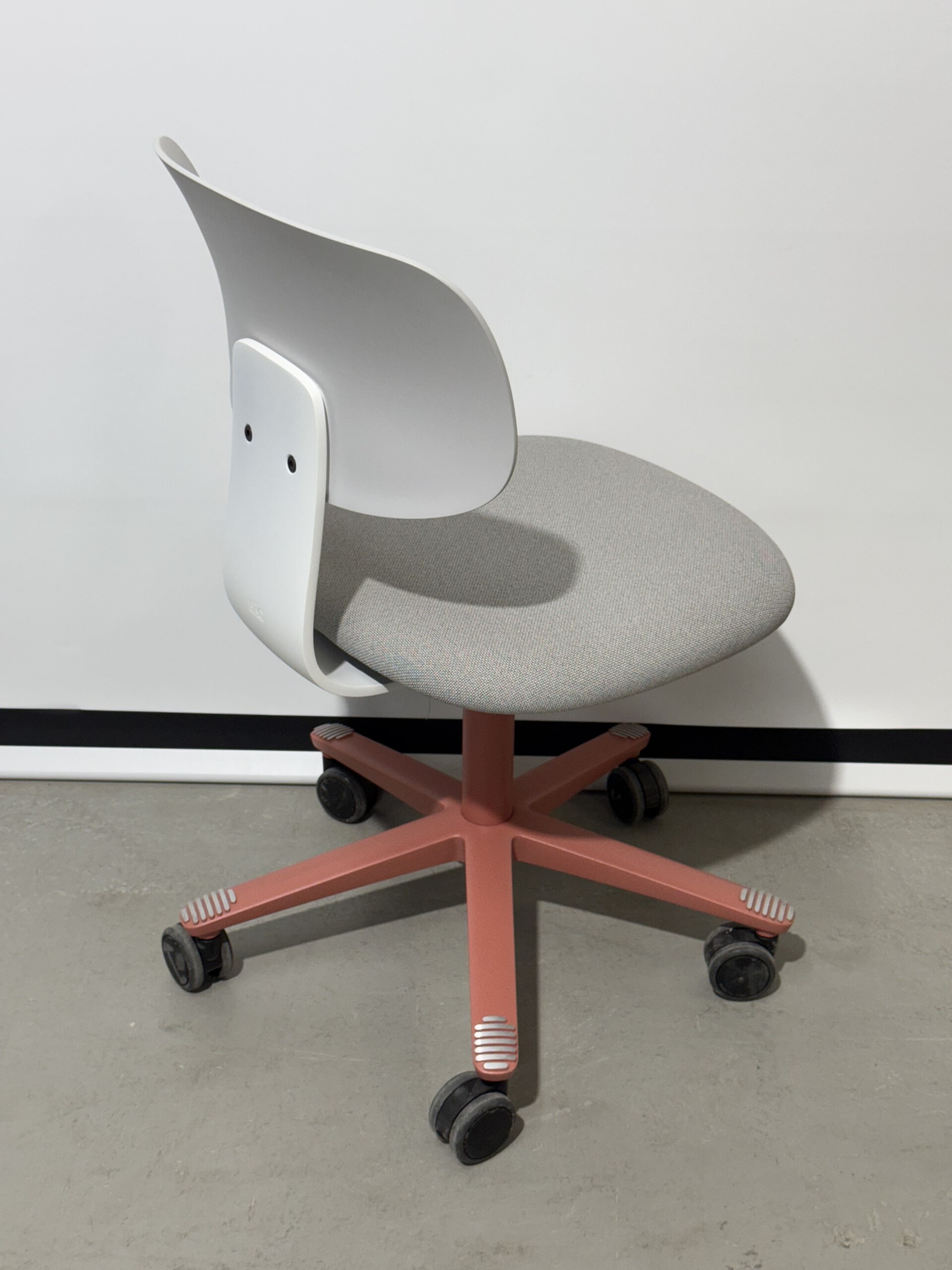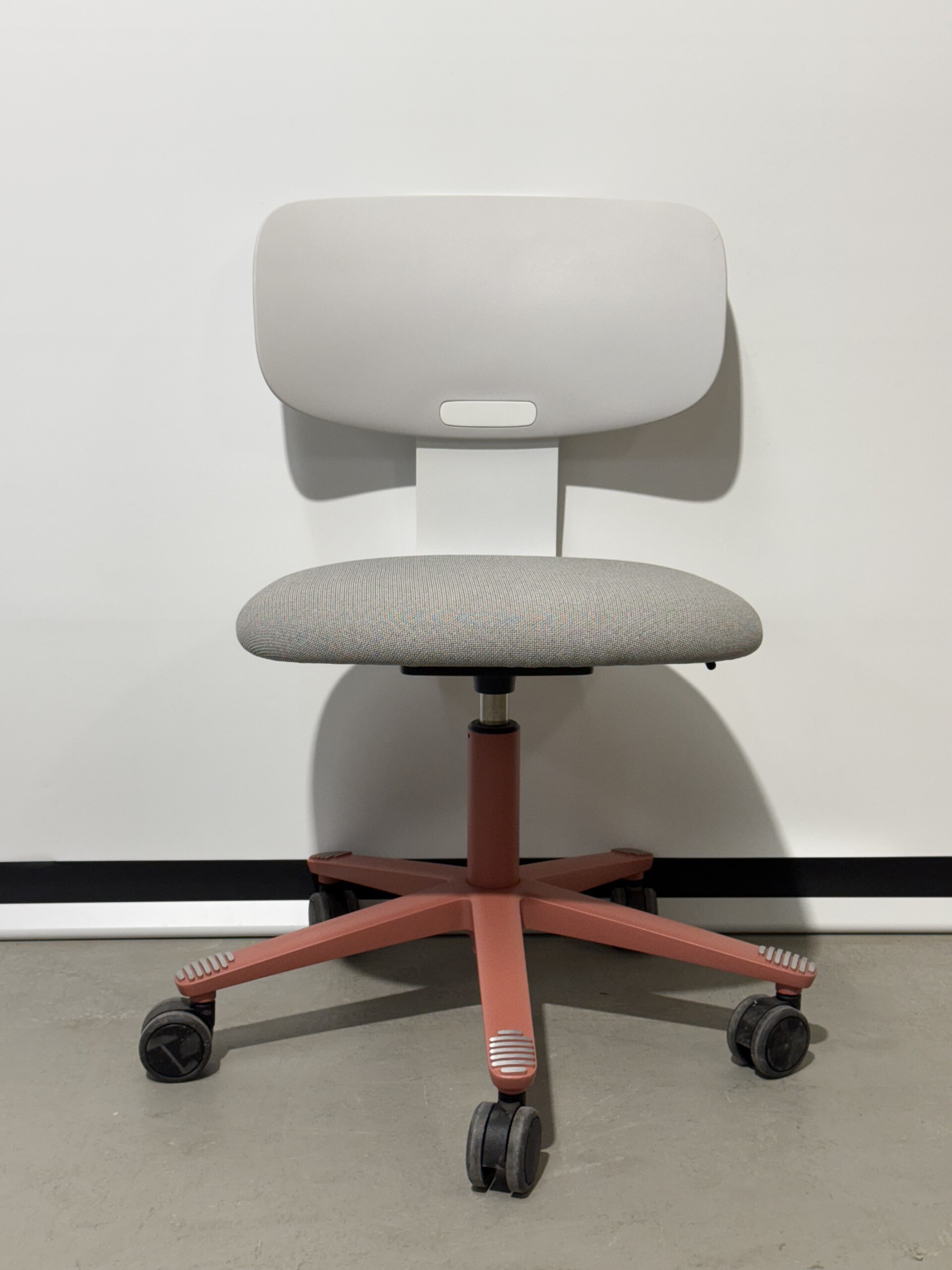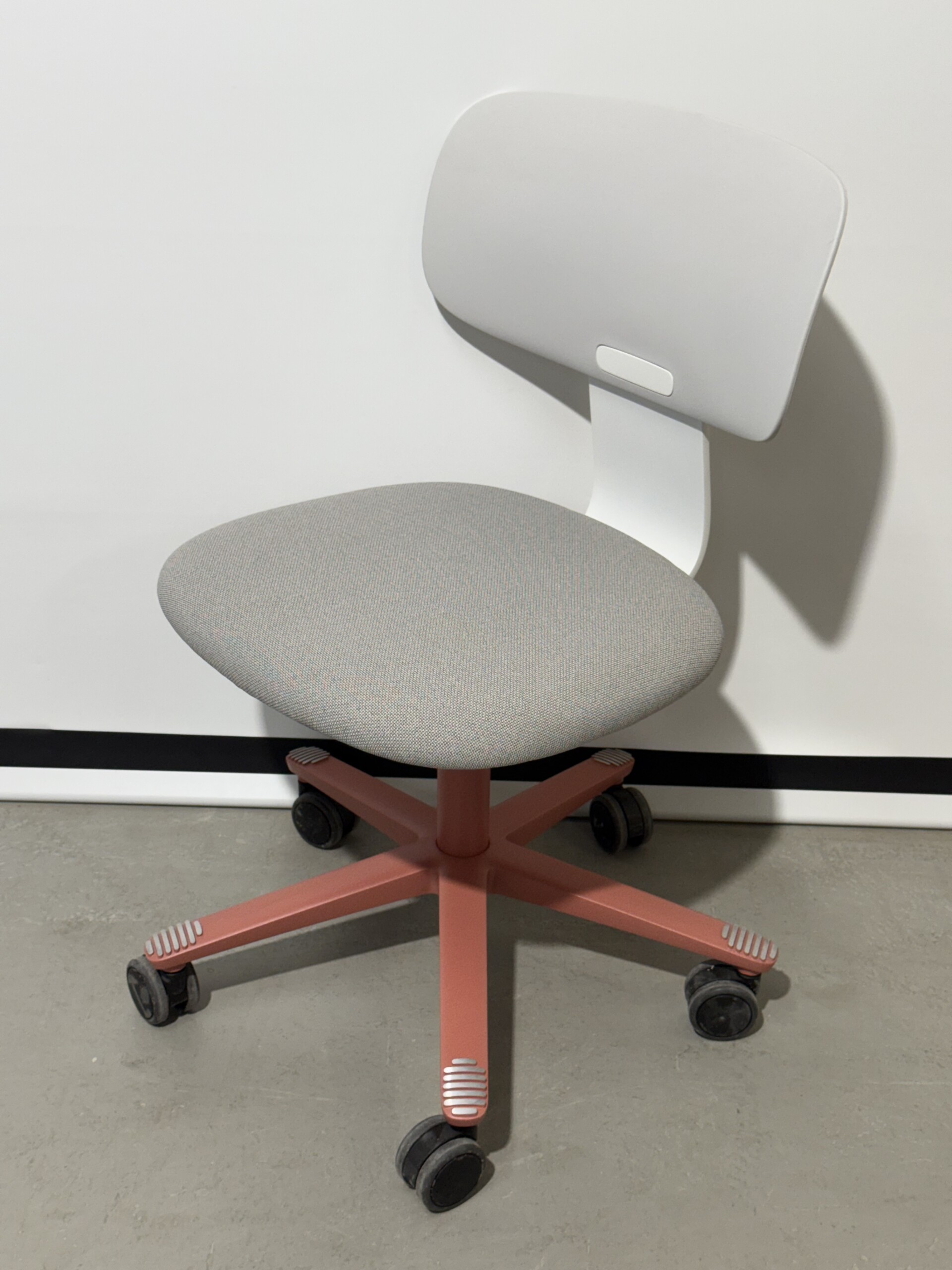 Sæde i stof (grå). Ryg i plast (grå). Fodkryds i metal (lyserød). Højdejusterbar.