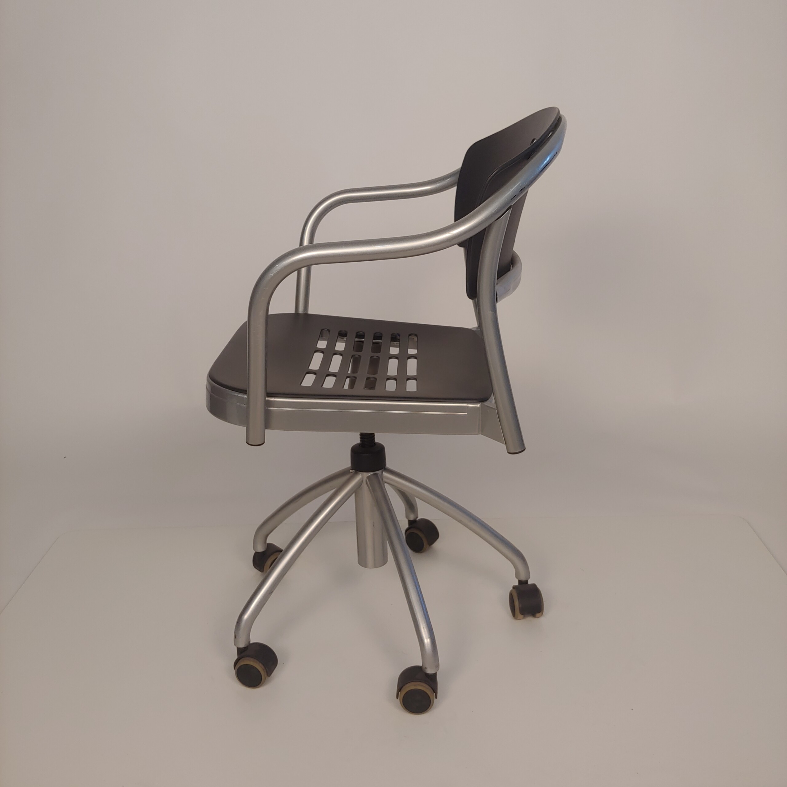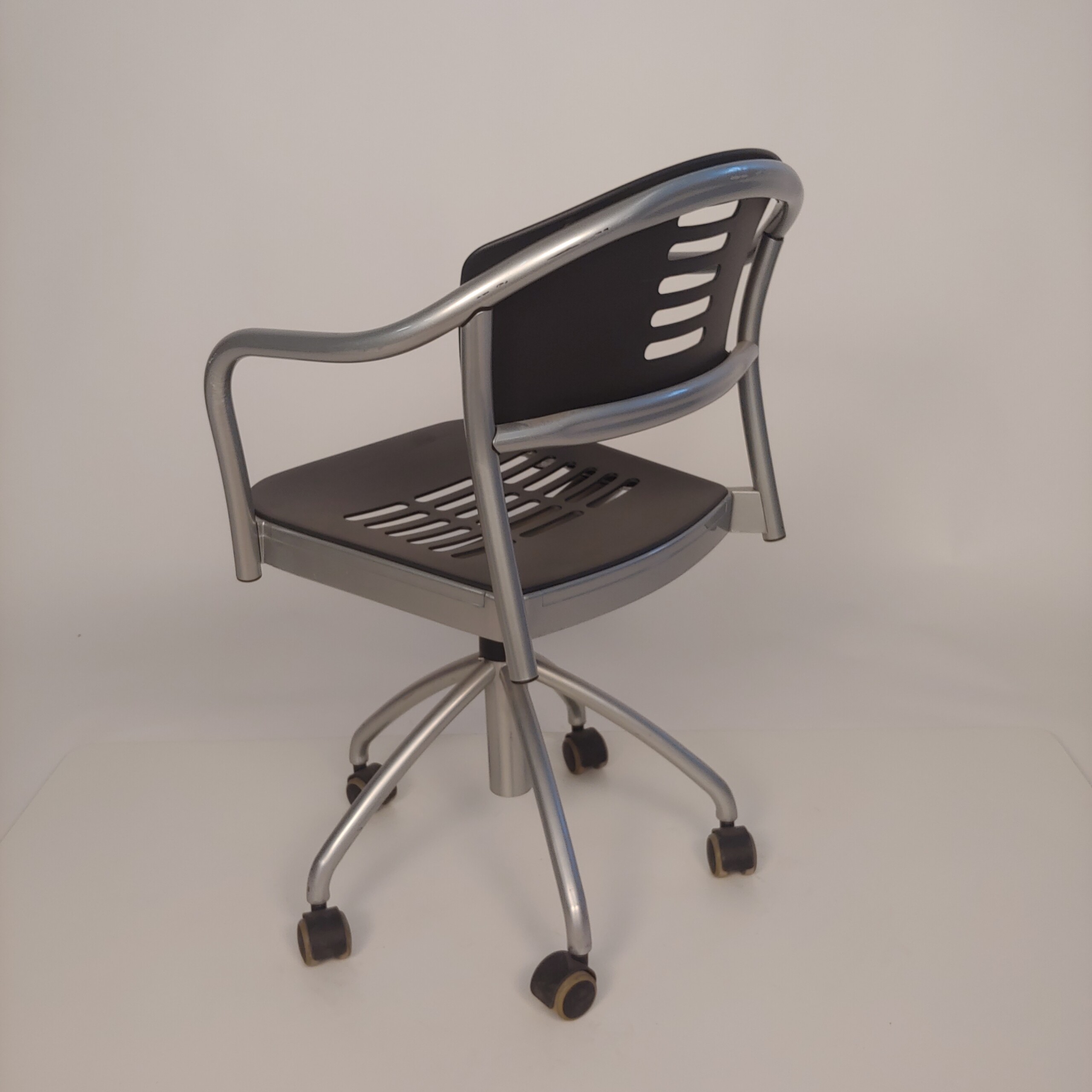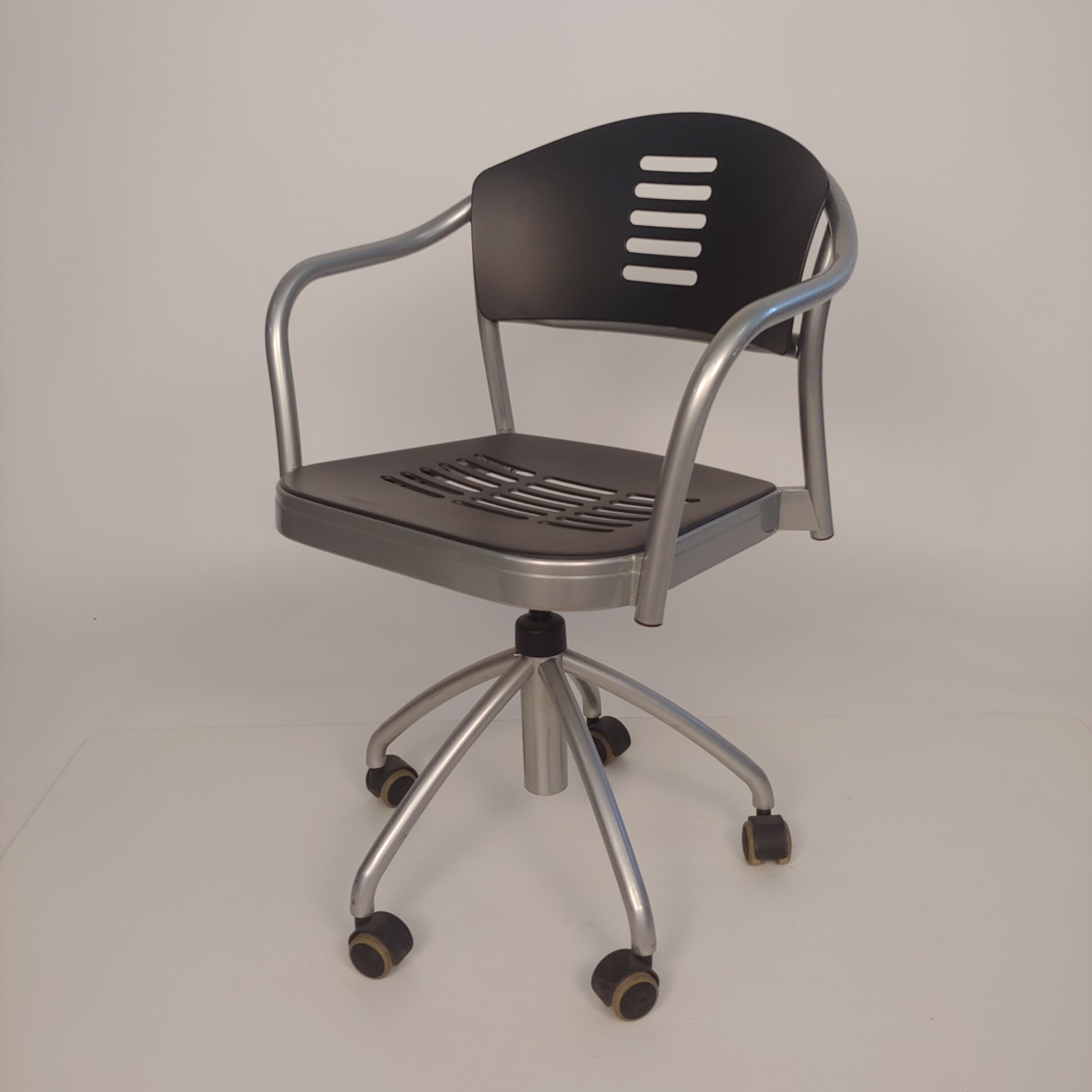 Sæde og ryg i plast (sort). Fodkryds i metal (sølv).