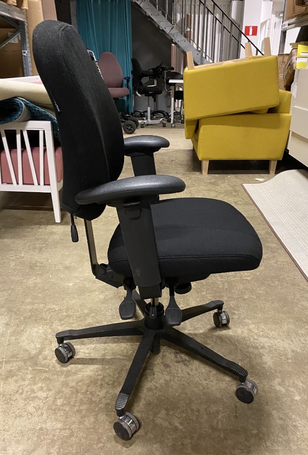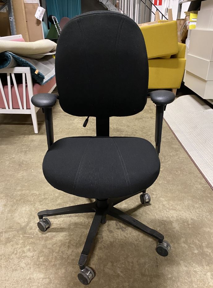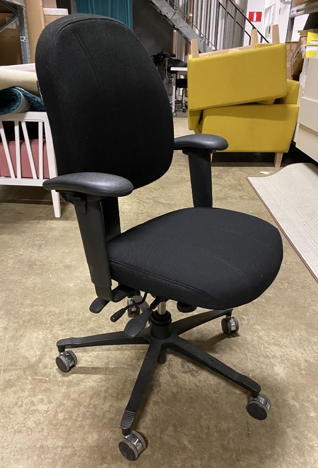 Sæde og ryg i stof (sort). Fodkryds i metal (sort). Højdejusterbar.