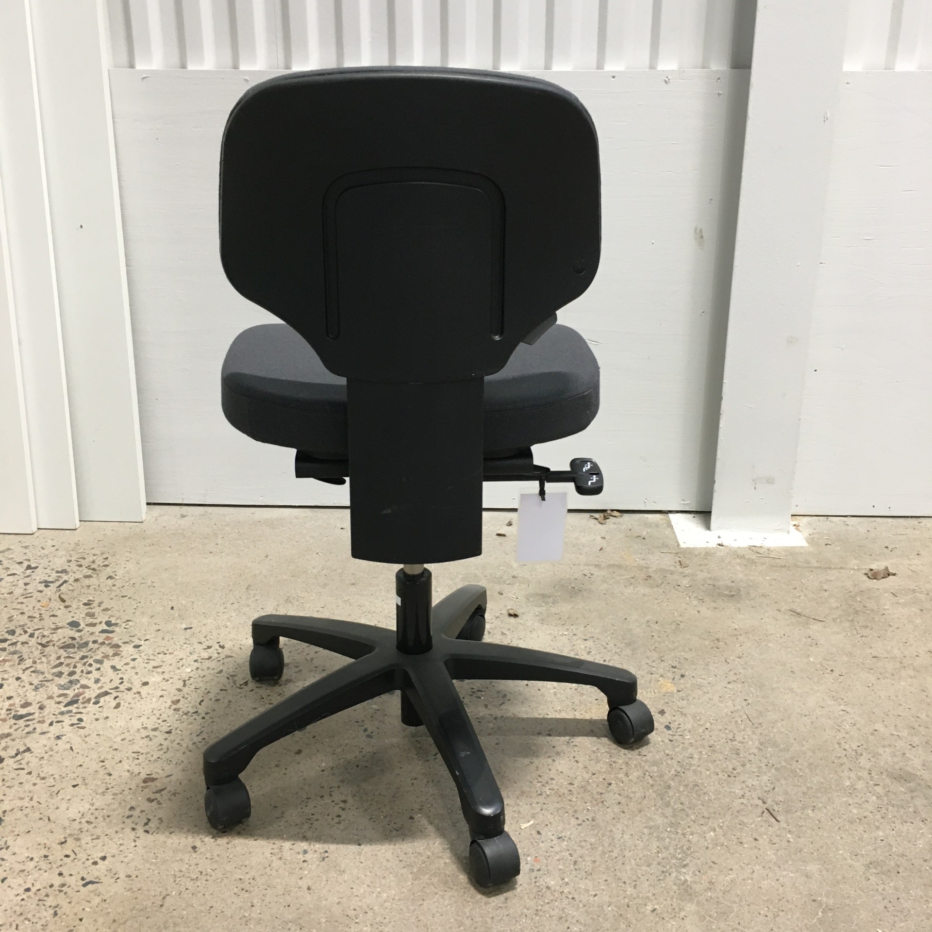Sæde og ryg i stof (grå). Fodkryds i plast (sort). Højdejusterbar.