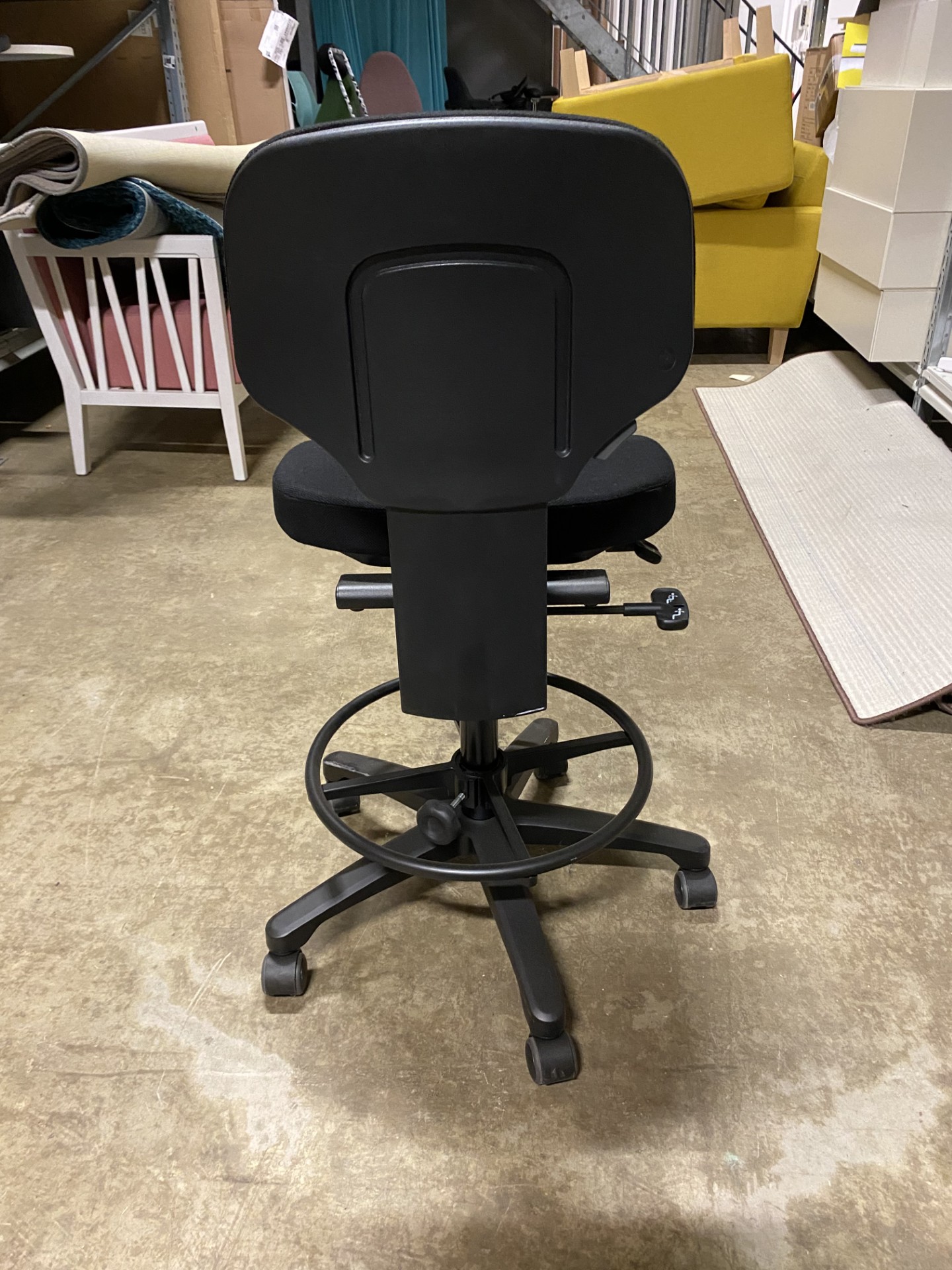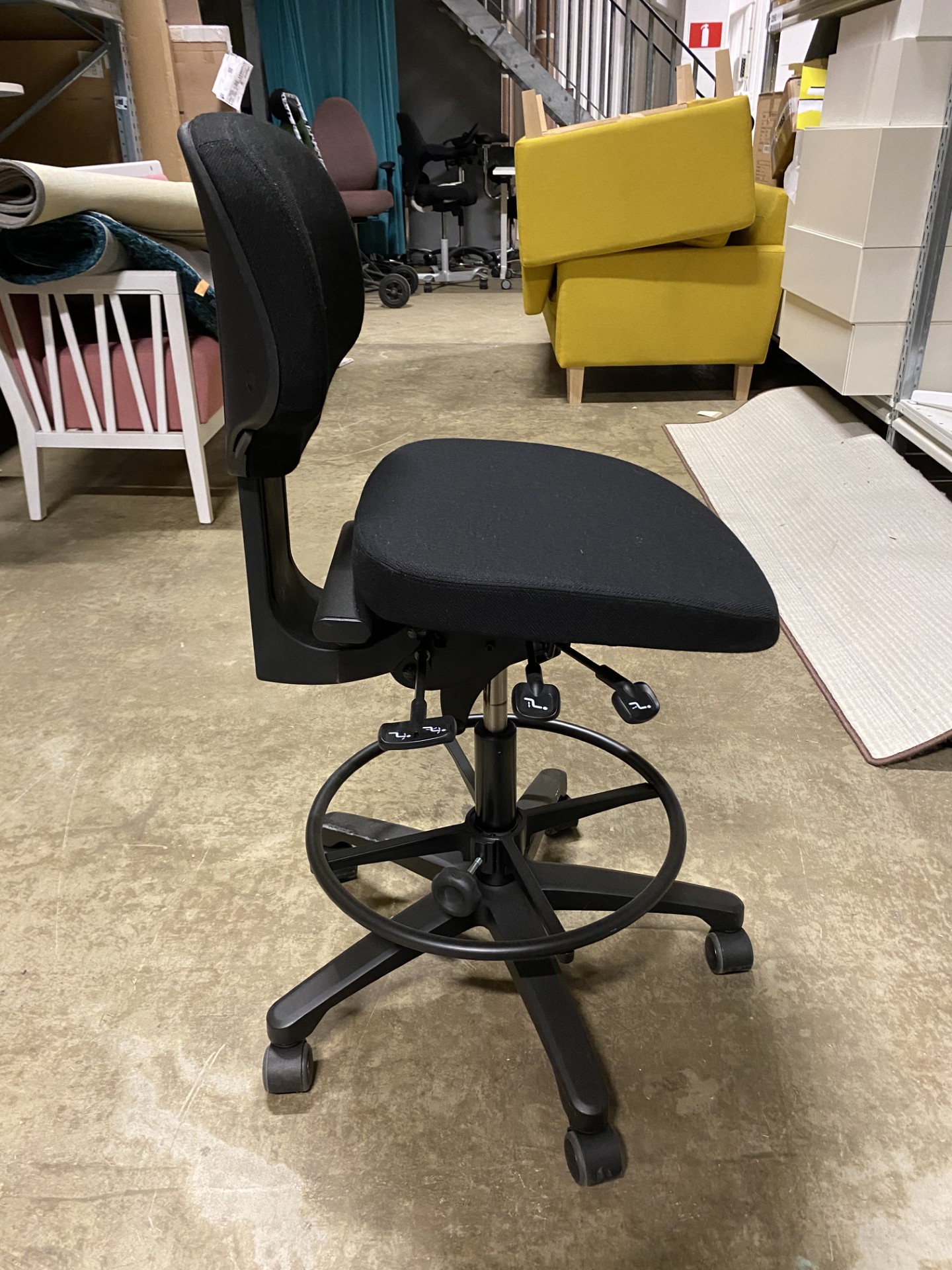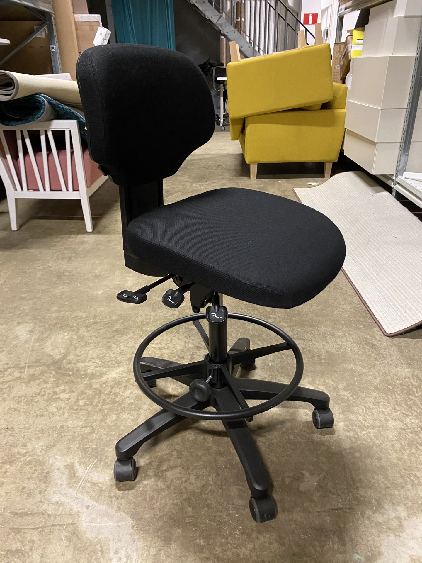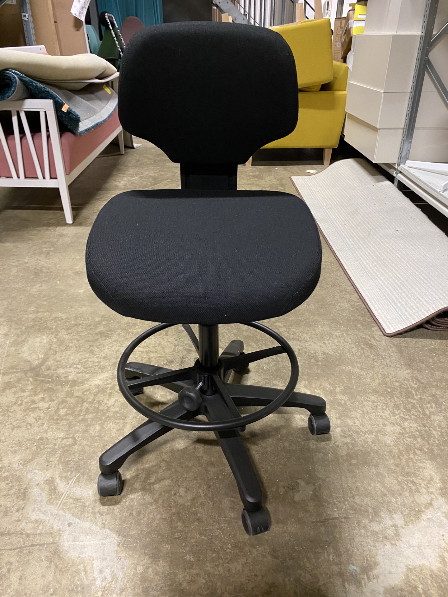 Sæde og ryg i stof (sort). Fodkryds i plast (sort). Højdejusterbar.