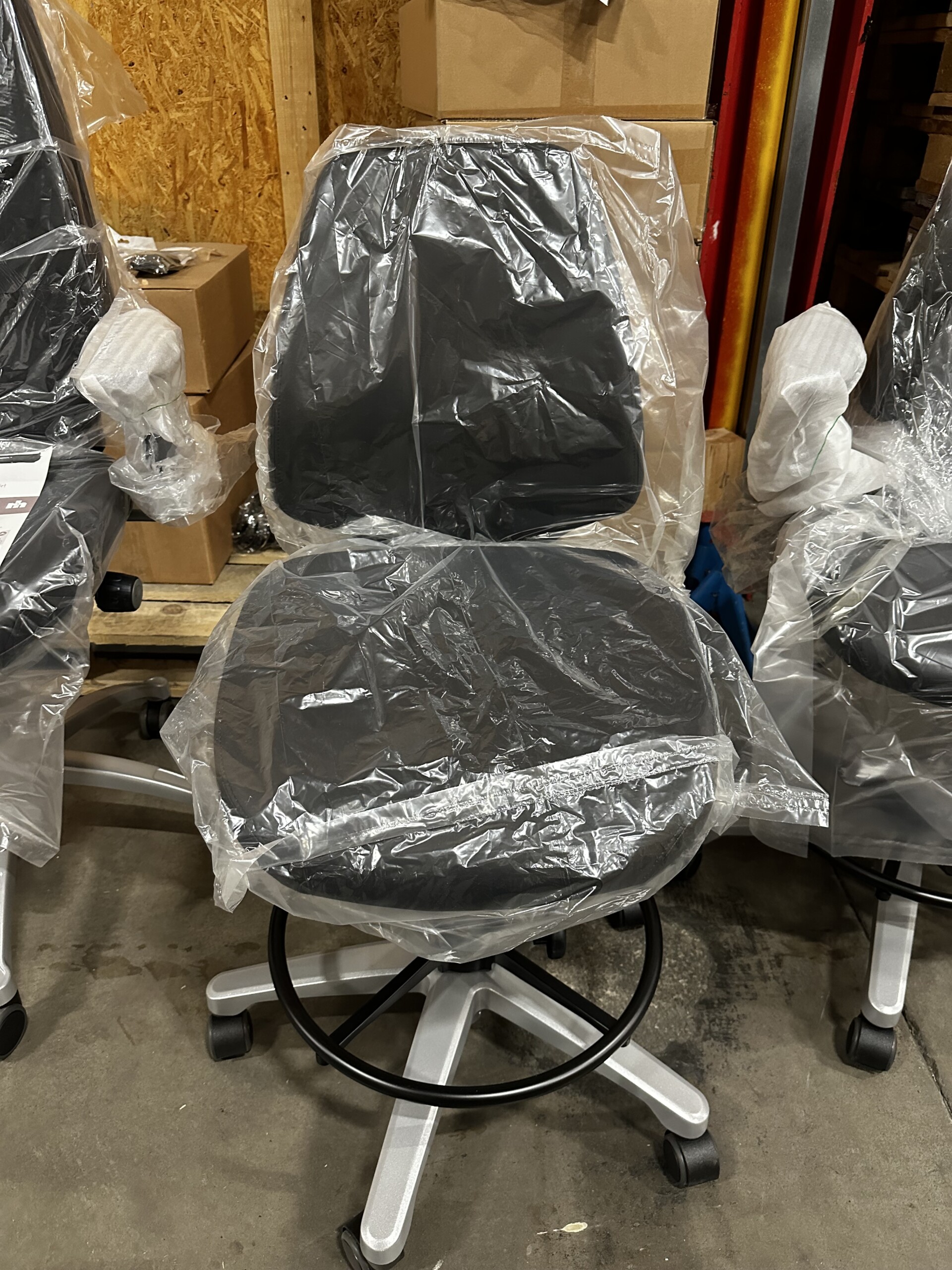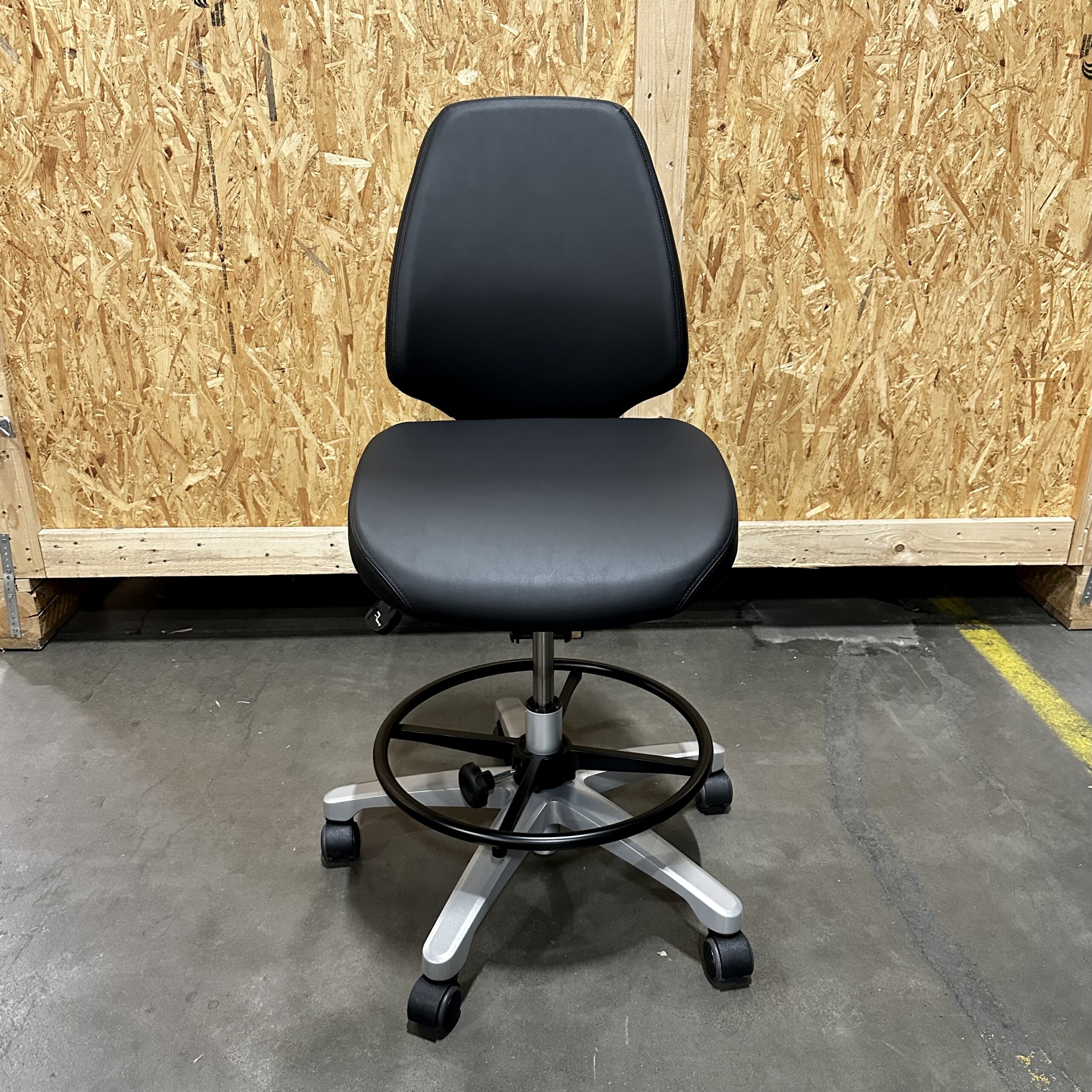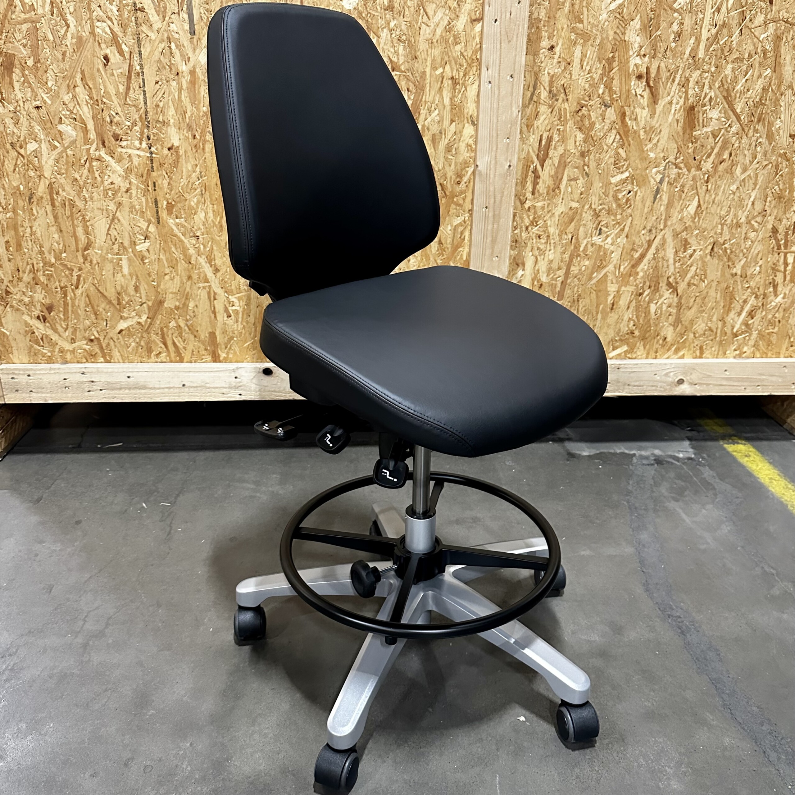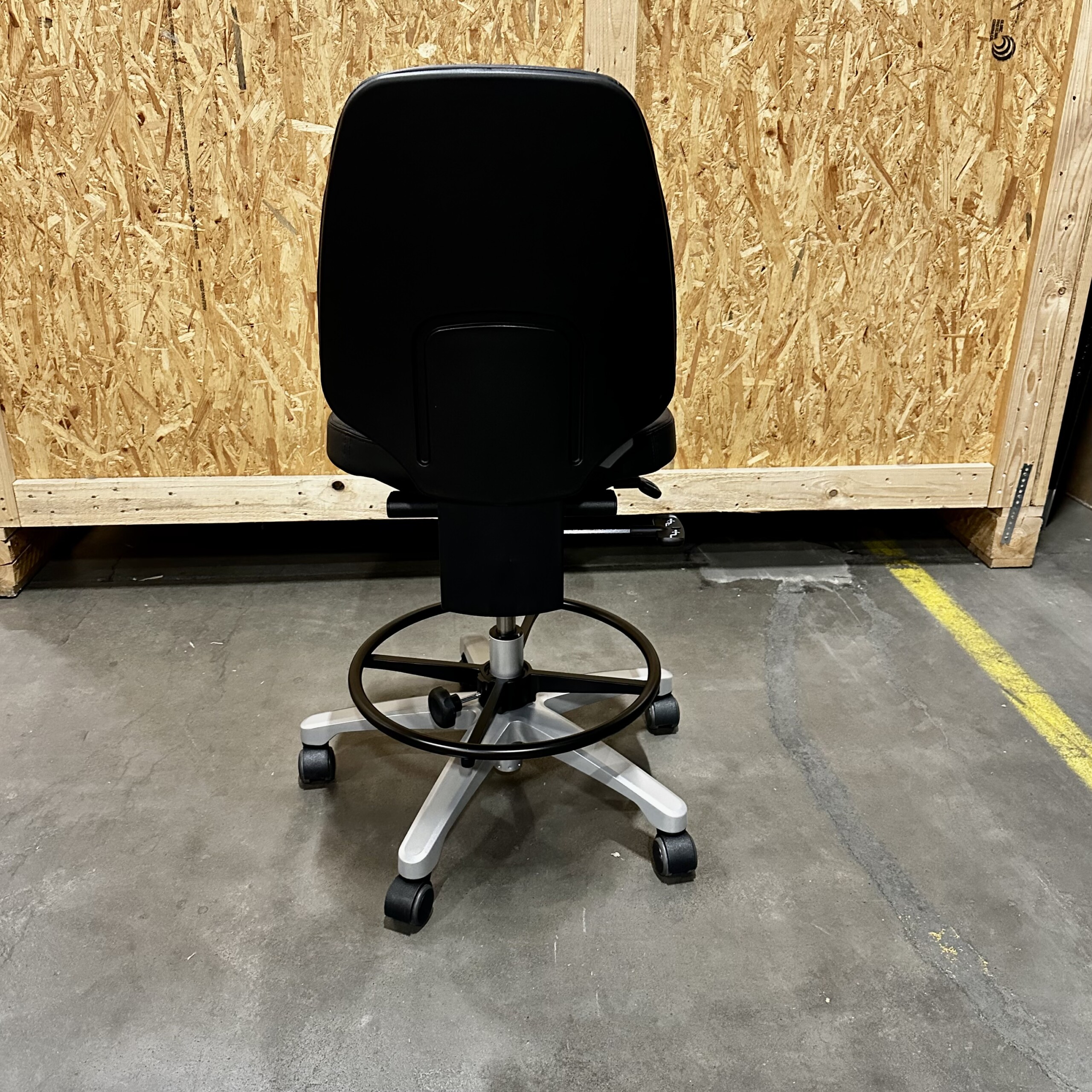 Sæde og ryg i kunstlæder (sort). Fodkryds i metal (sølv). Højdejusterbar.
