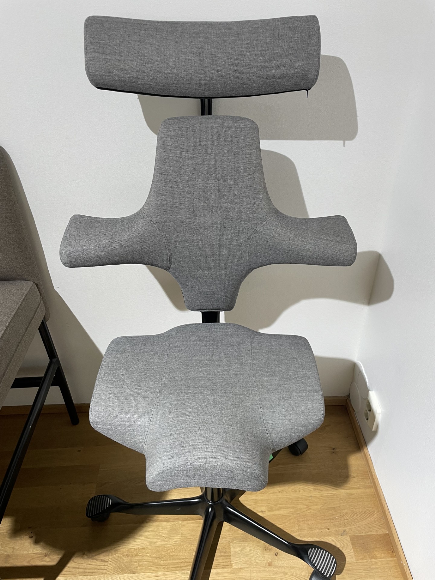 Sæde og ryg i stof (grå). Fodkryds i metal (sort). Højdejusterbar.
