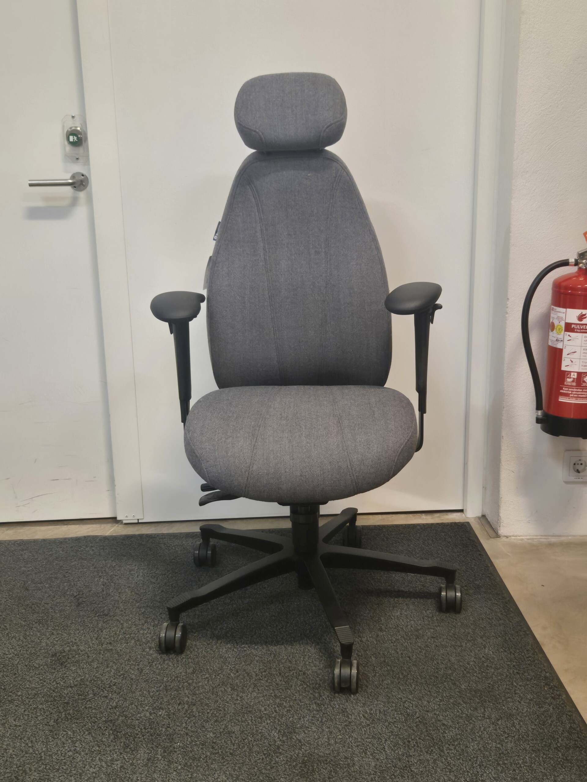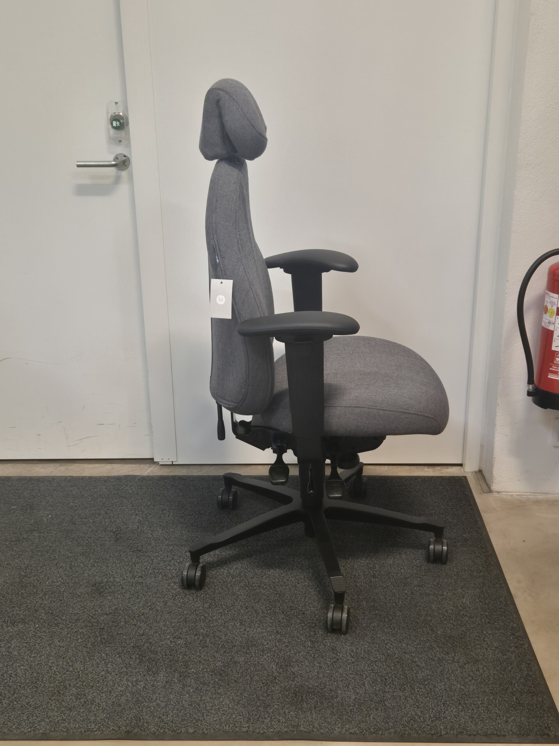Sæde og ryg i stof (grå). Fodkryds i metal (sort). Højdejusterbar.