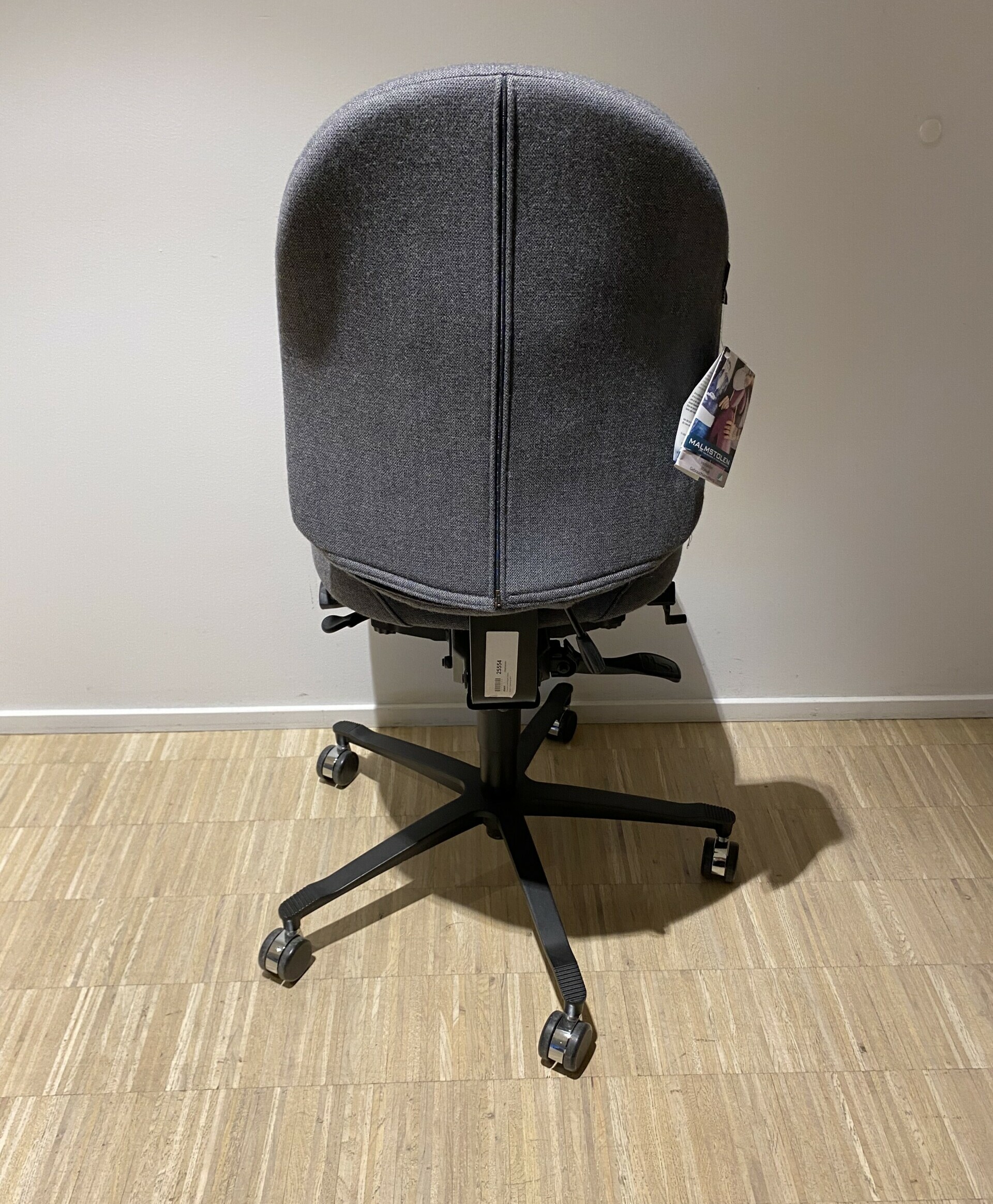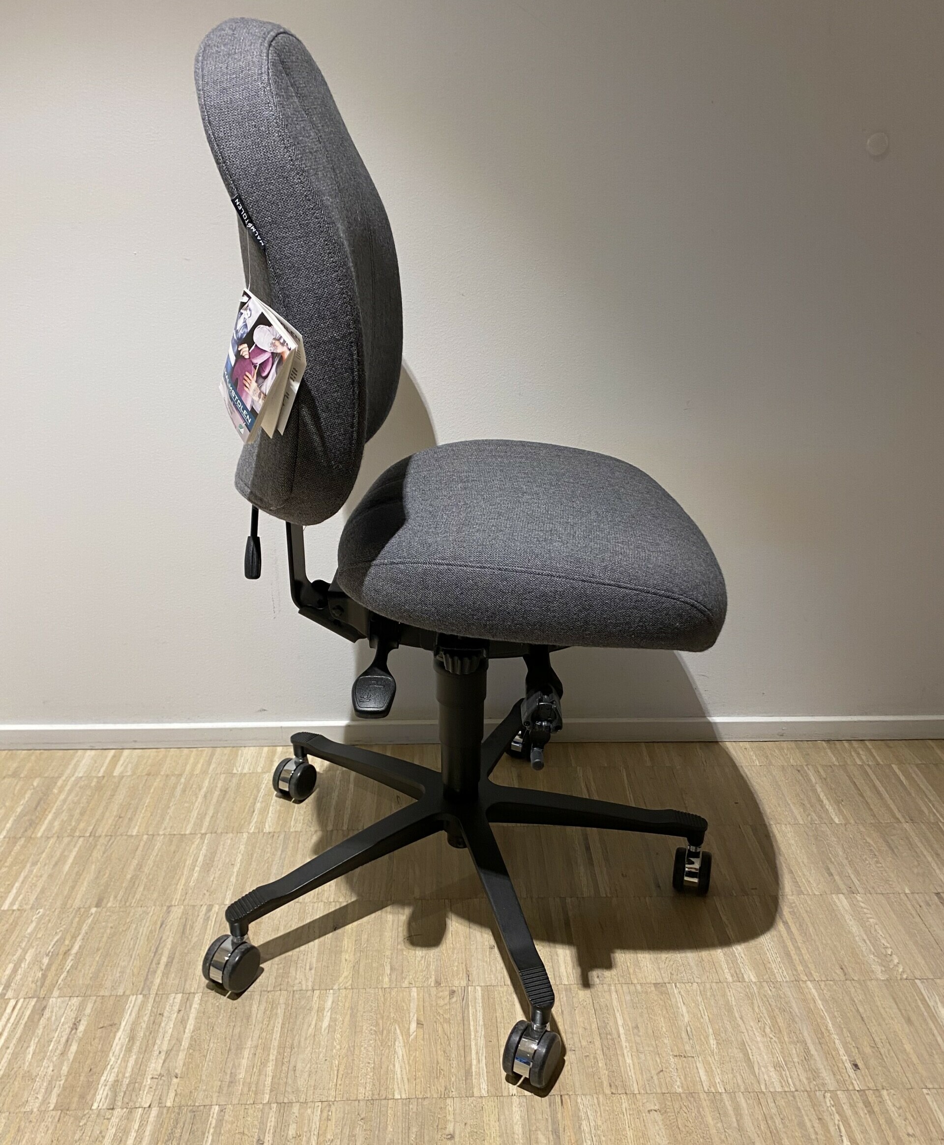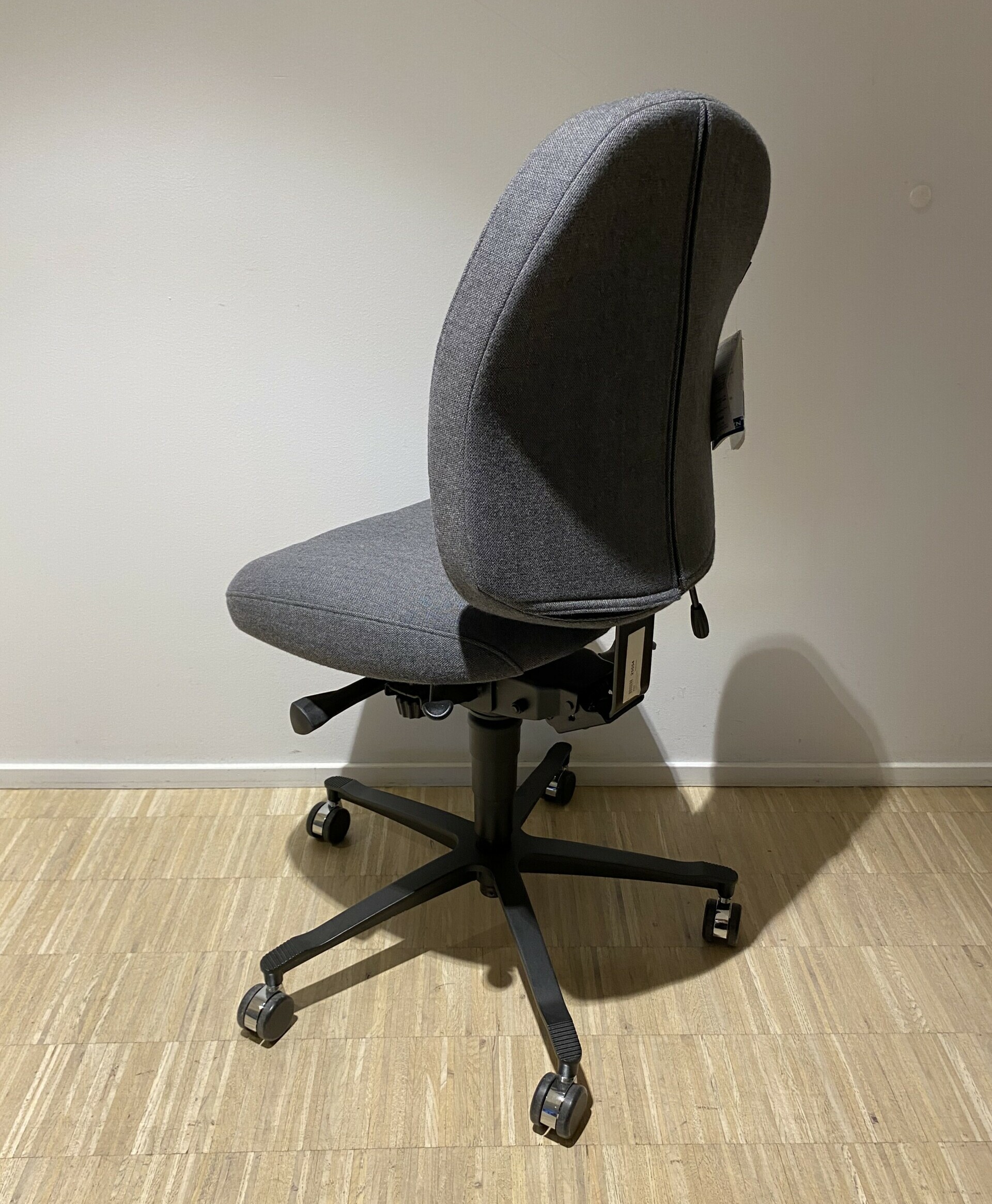 Sæde og ryg i stof (grå). Fodkryds i metal (sort). Højdejusterbar.