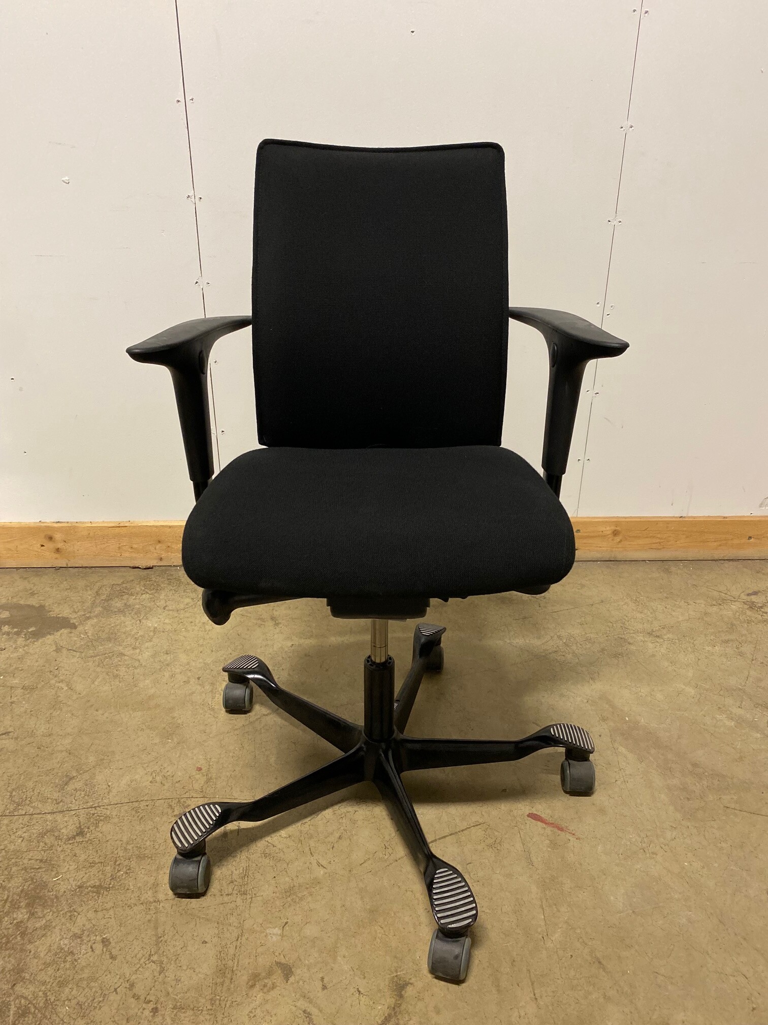 Sæde og ryg i stof (sort). Fodkryds i metal (sort). Højdejusterbar.