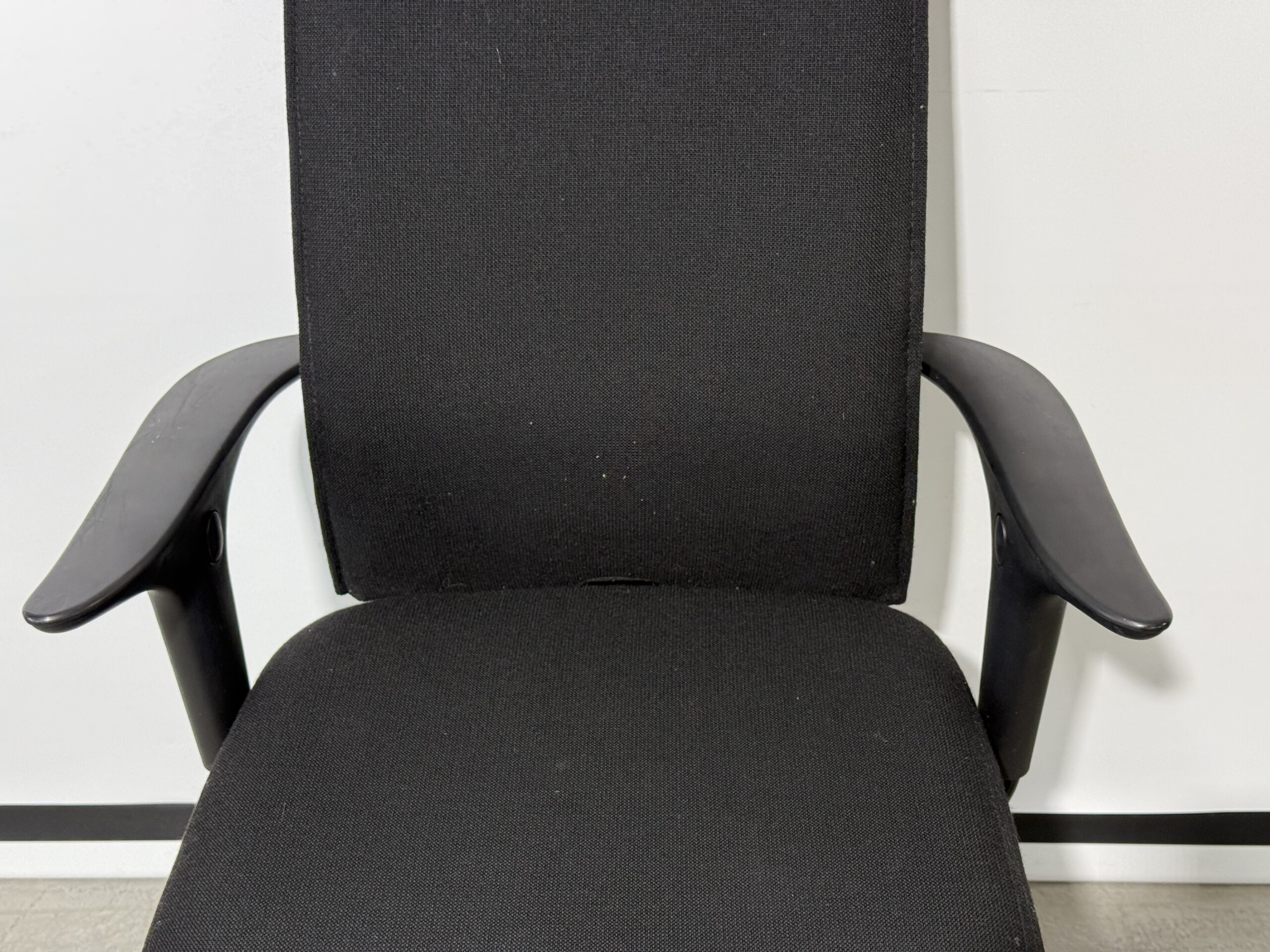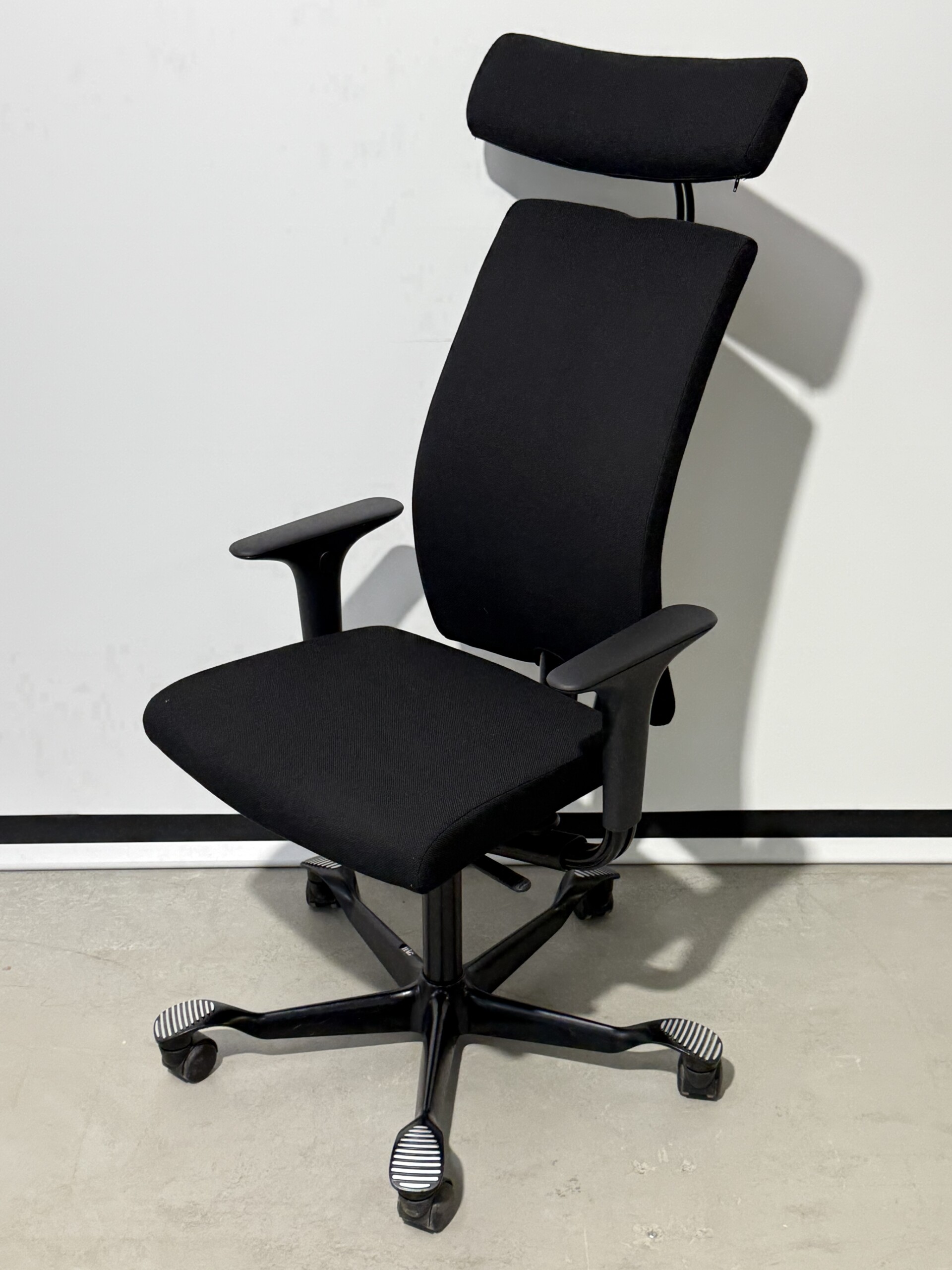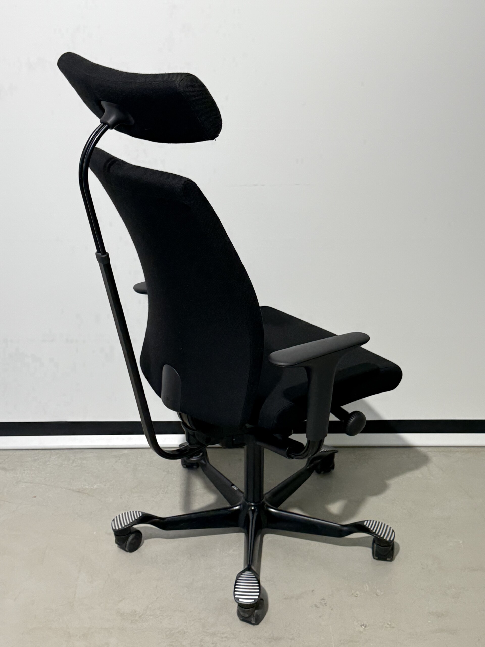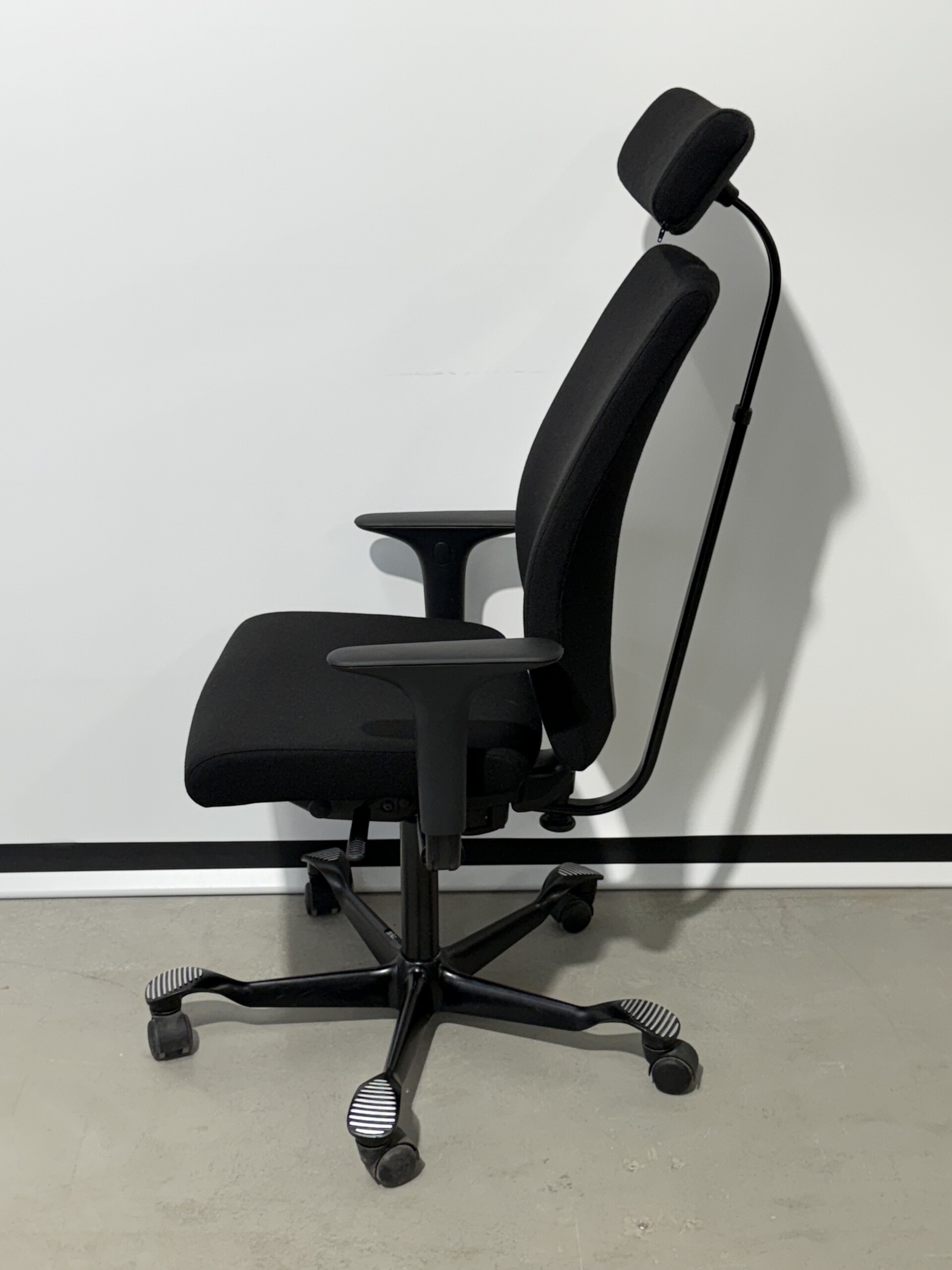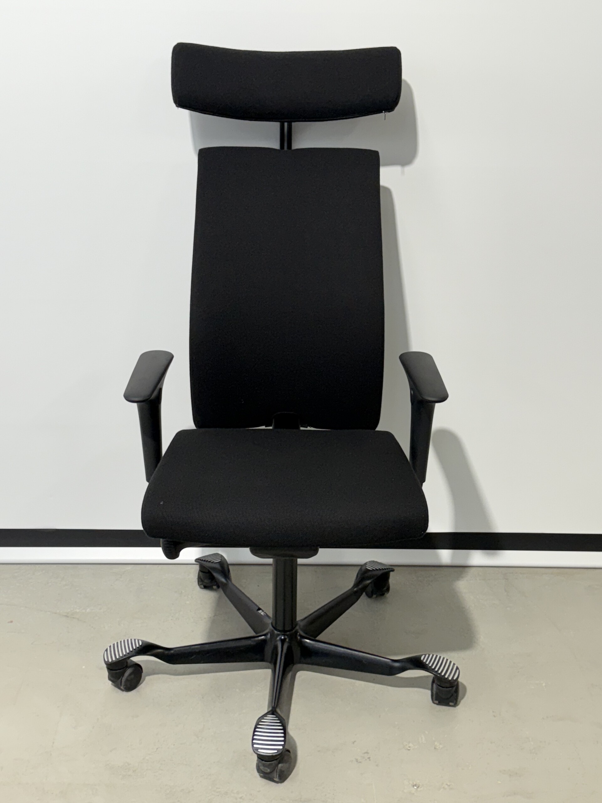 Sæde og ryg i stof (sort). Fodkryds i metal (sort). Højdejusterbar.