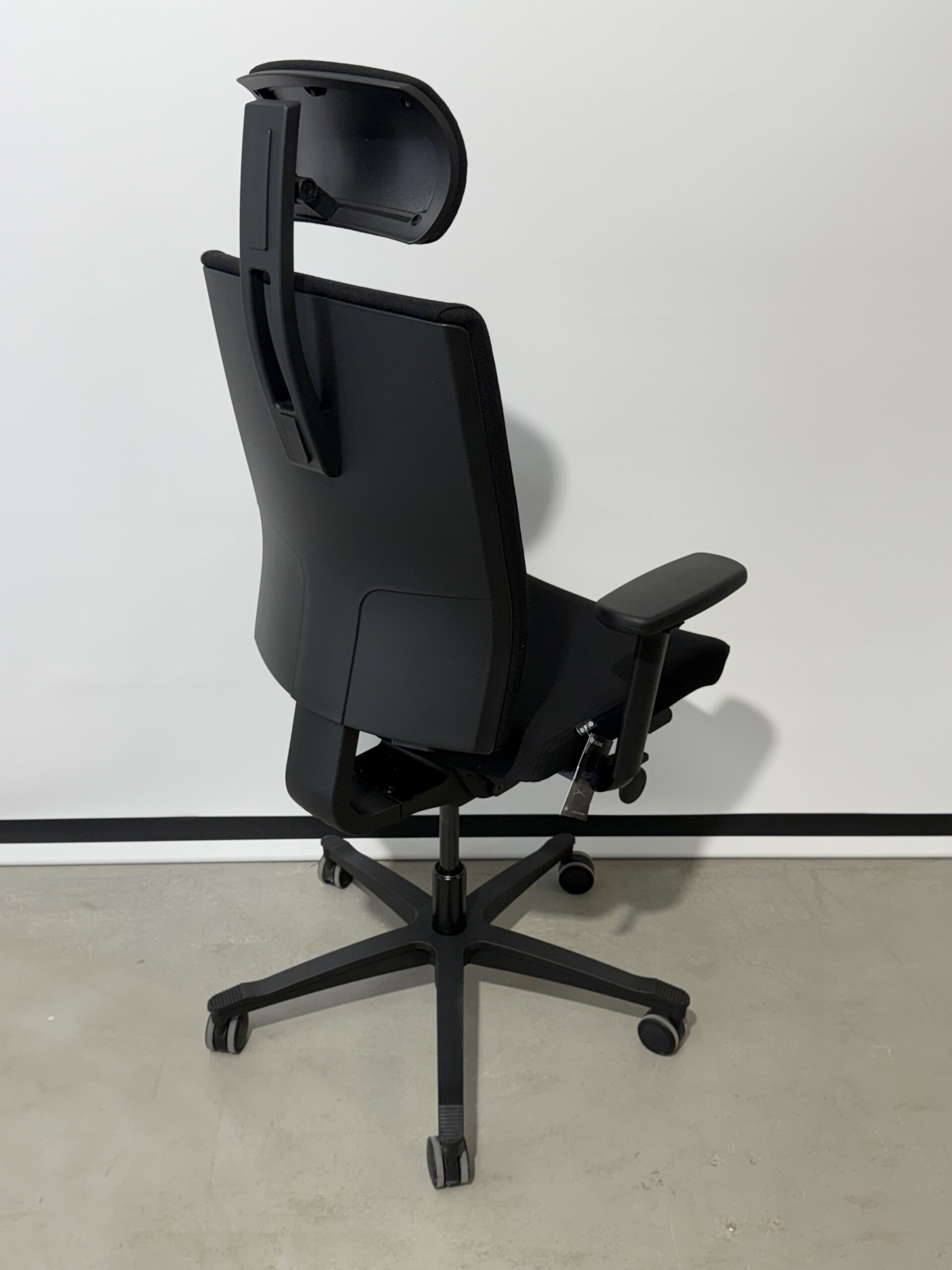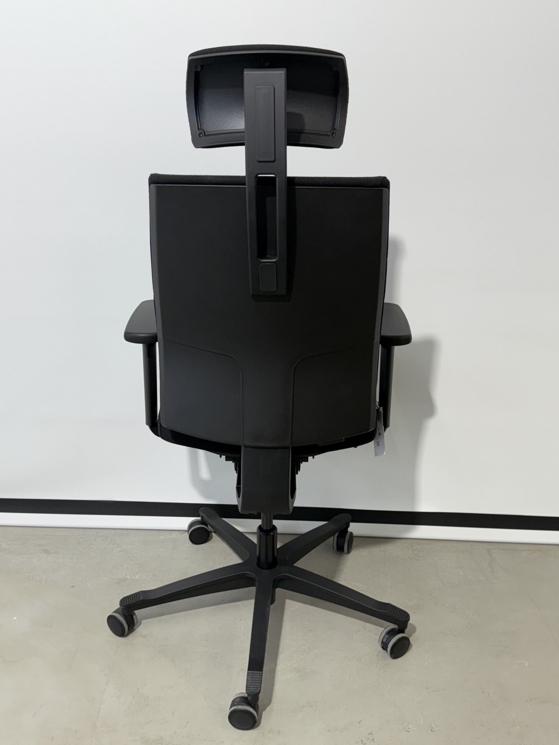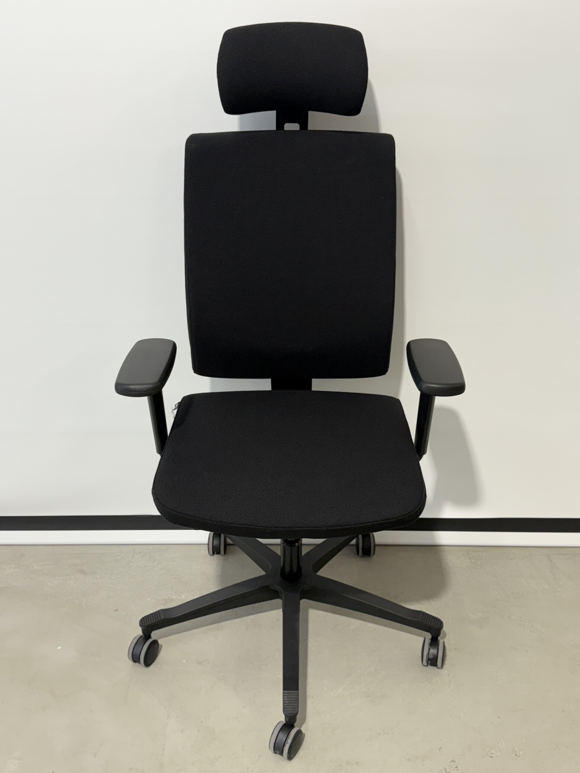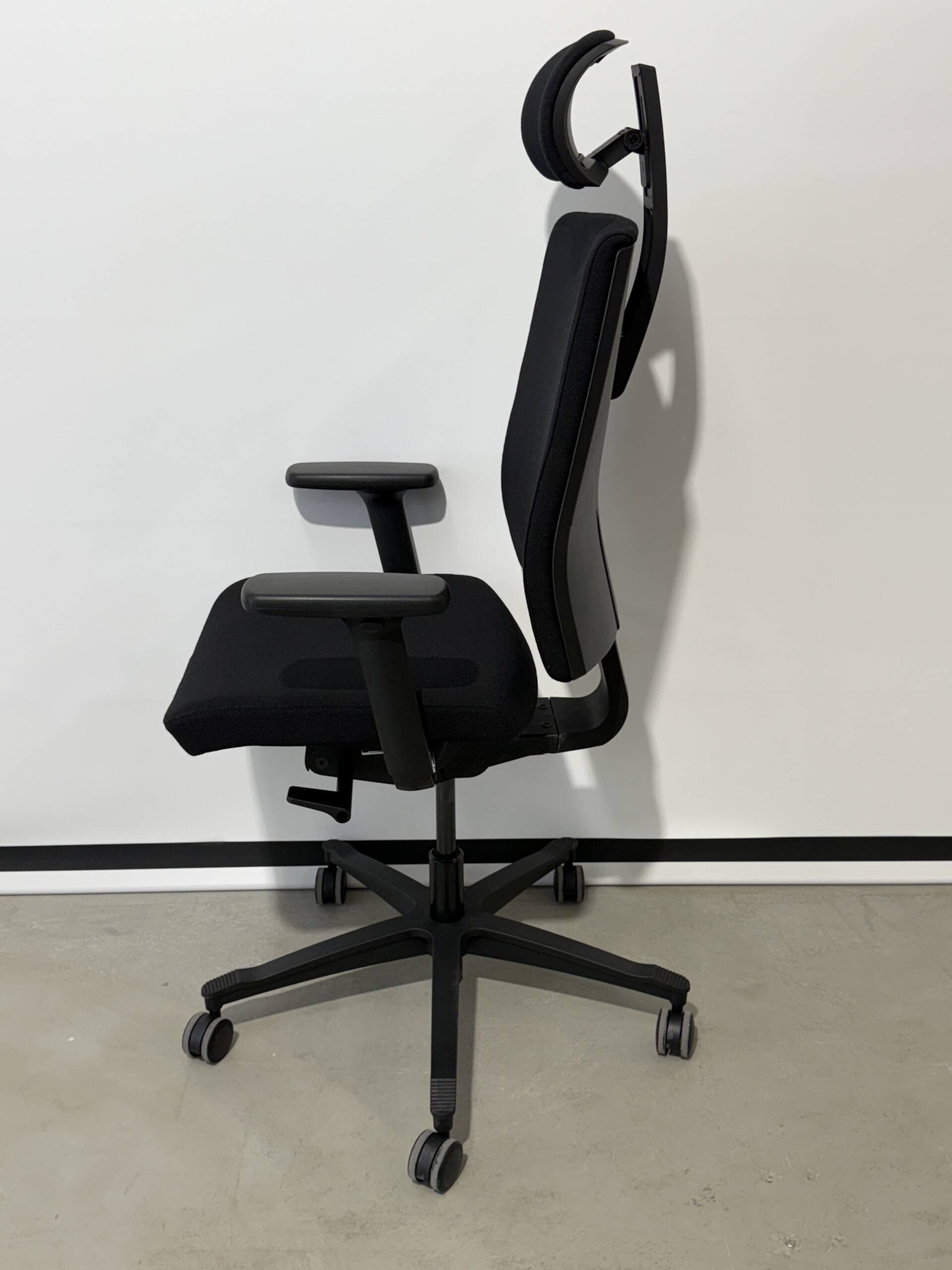 Sæde og ryg i stof (sort). Fodkryds i plast (sort). Højdejusterbar.