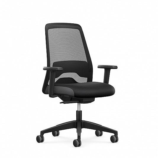 Sæde i stof (sort). Ryg i mesh (sort). Fodkryds i metal (sort). Højdejusterbar.