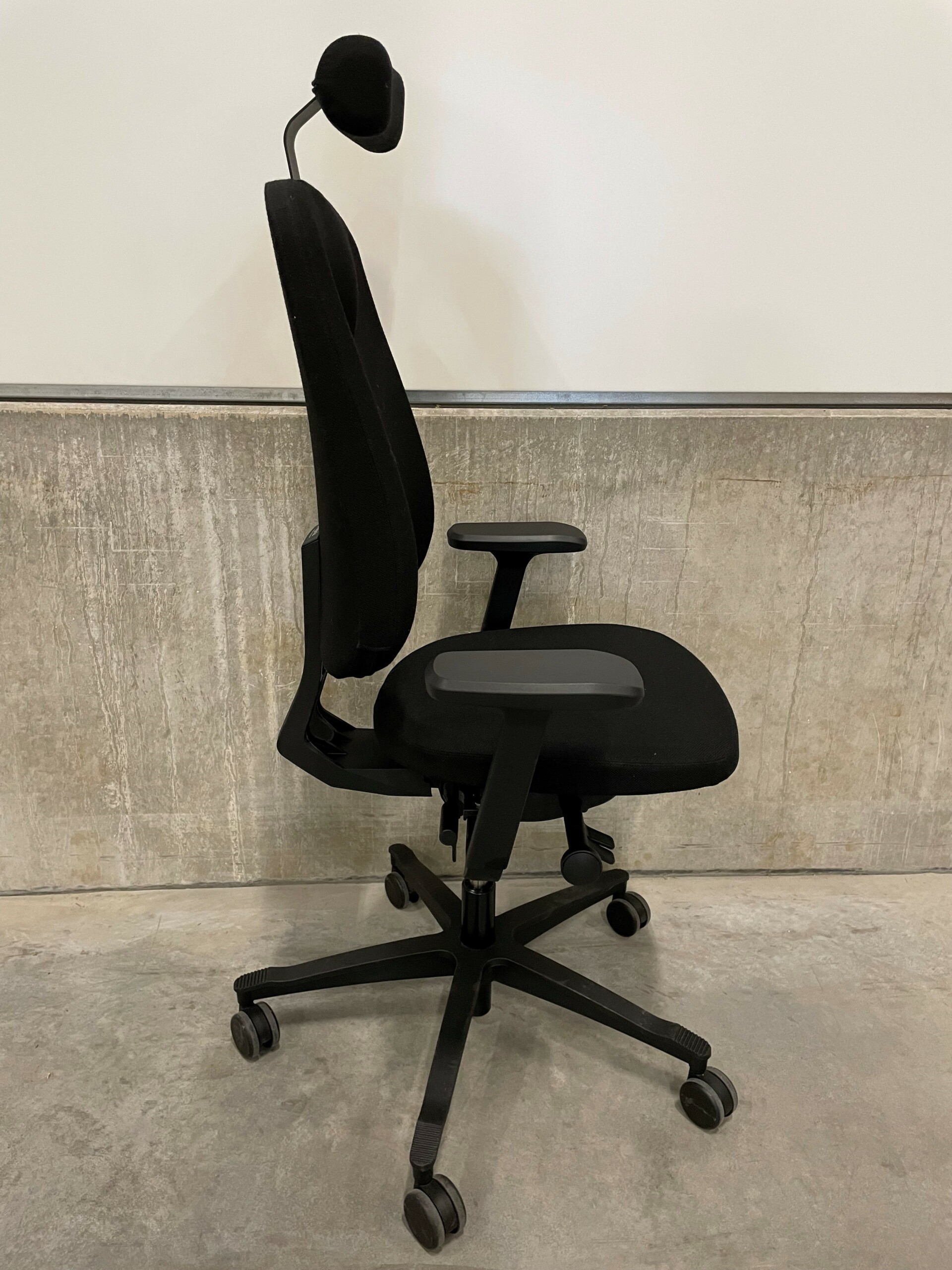 Sæde og ryg i stof (sort). Fodkryds i plast (sort). Højdejusterbar.