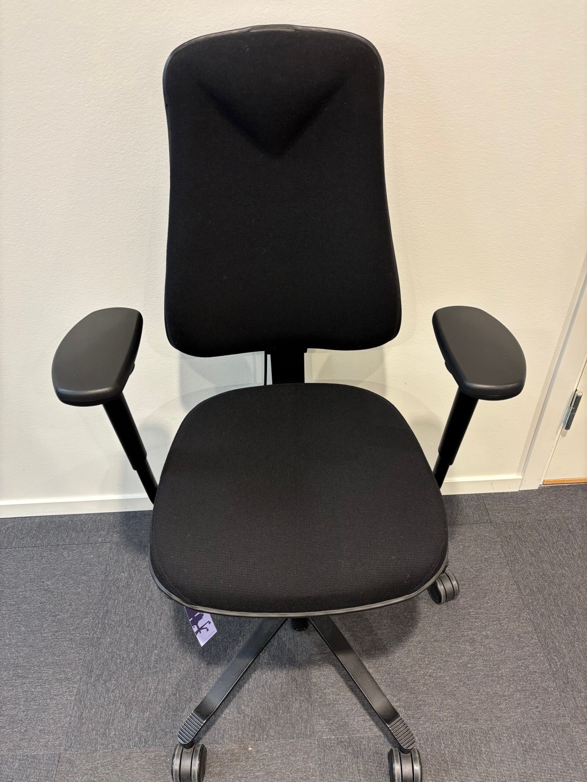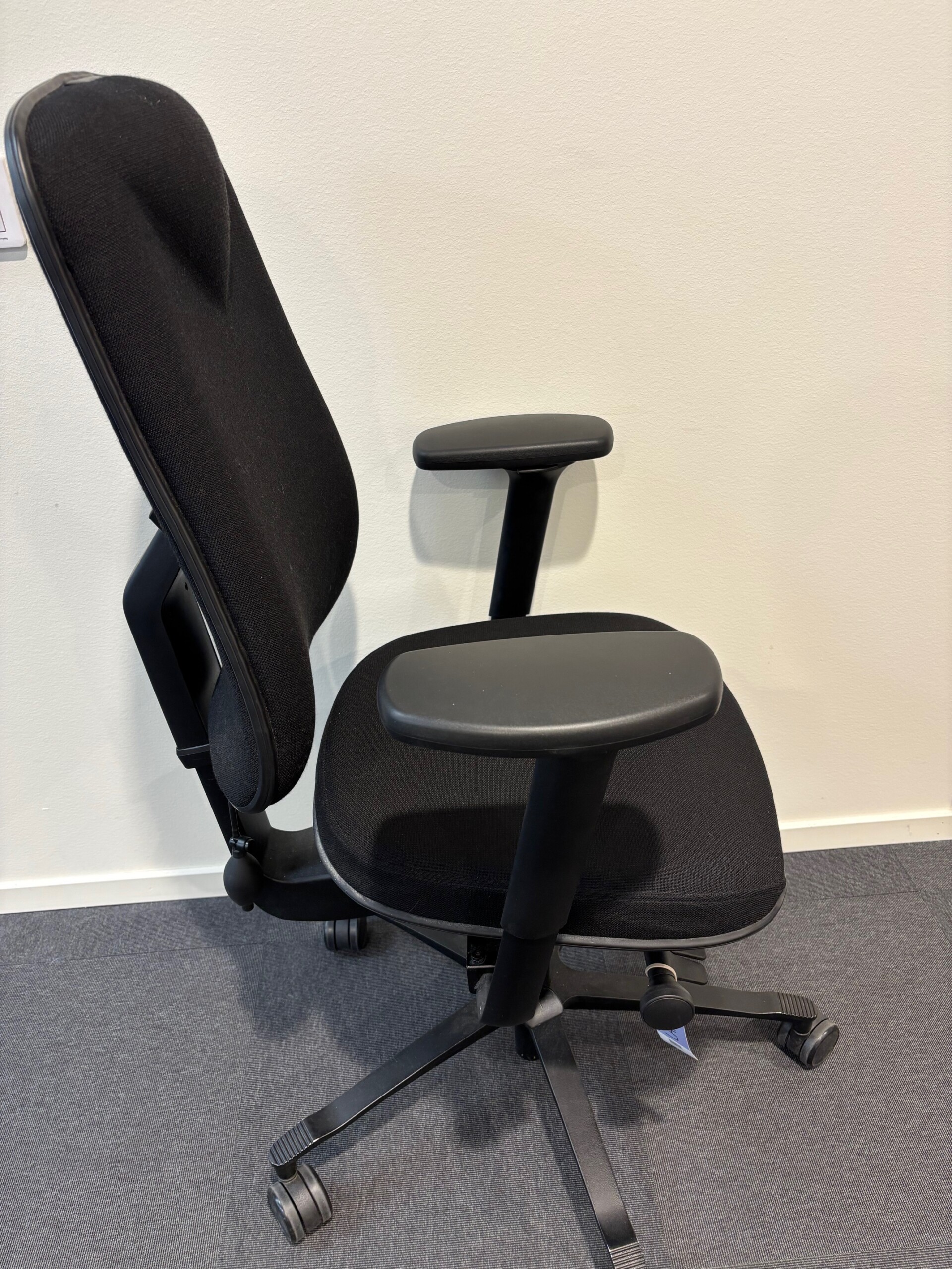Sæde og ryg i stof (sort). Fodkryds i metal (sort). Højdejusterbar.