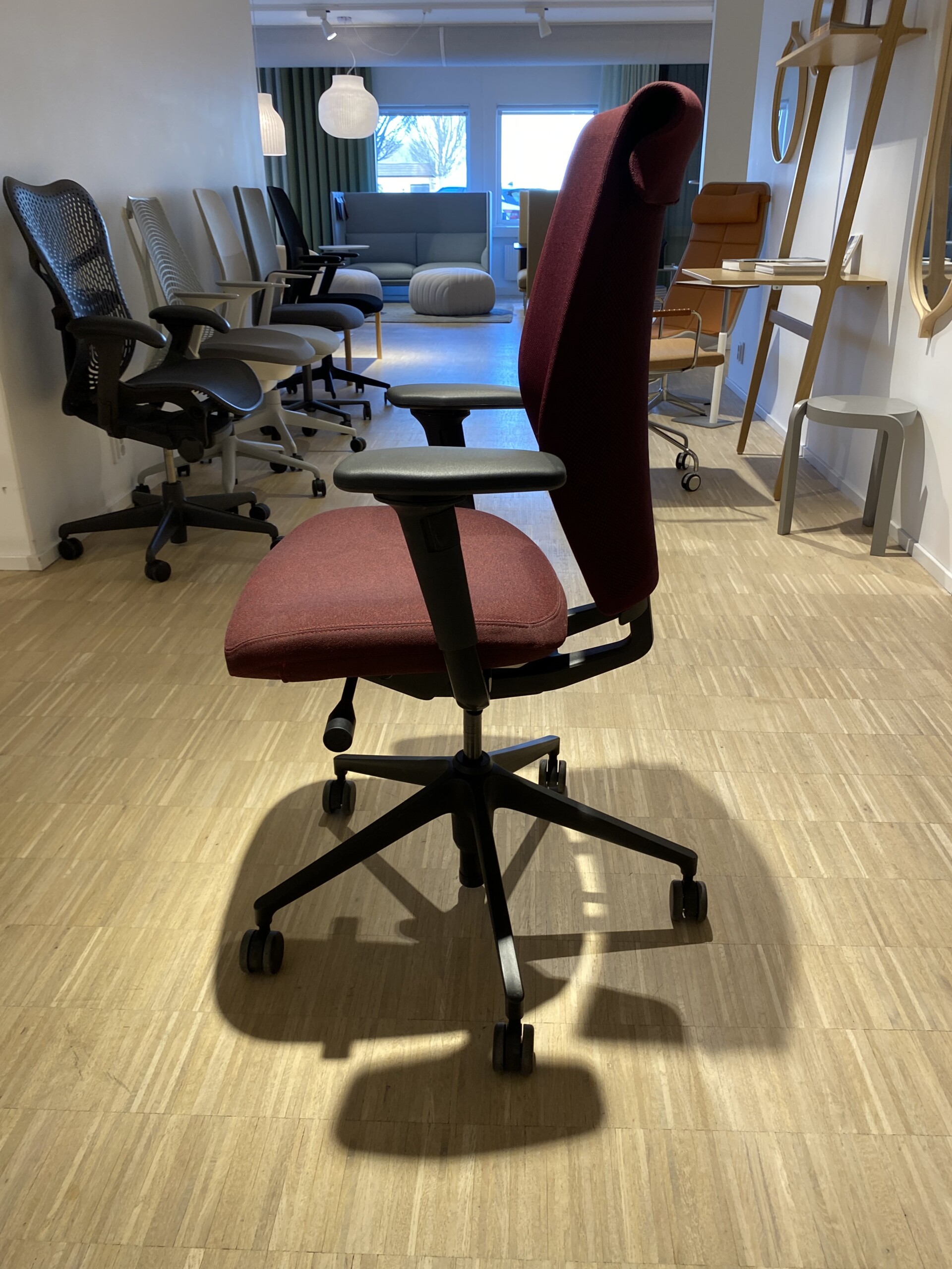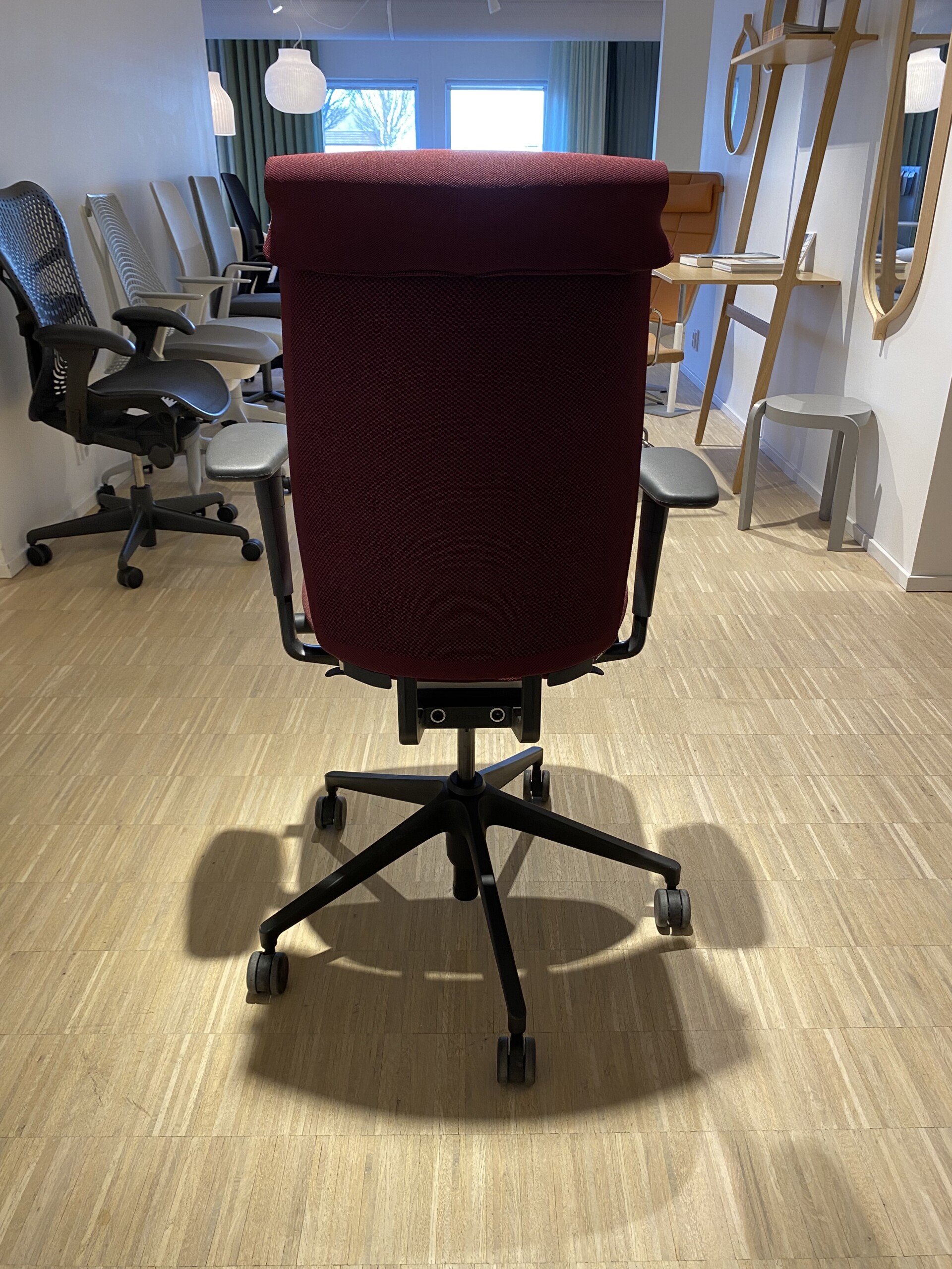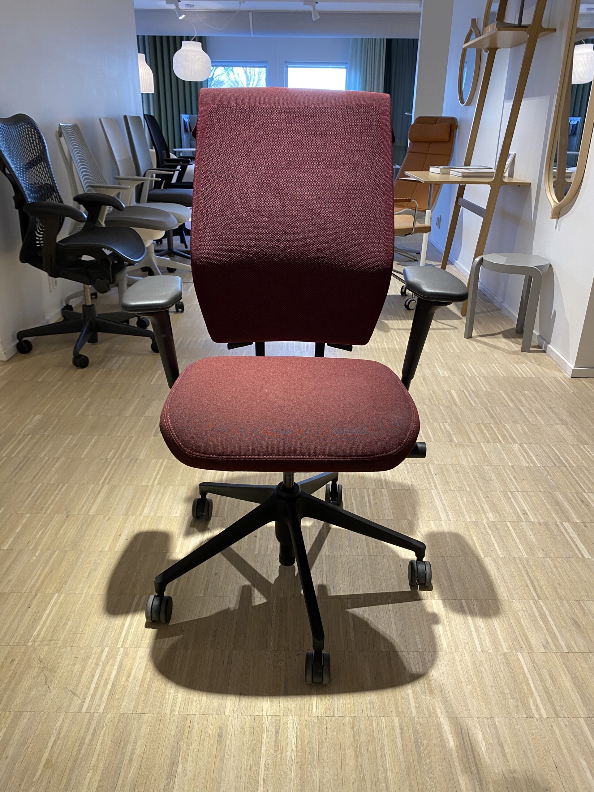 Sæde i stof (rød). Ryg i mesh (rød). Fodkryds i plast (sort). Højdejusterbar.