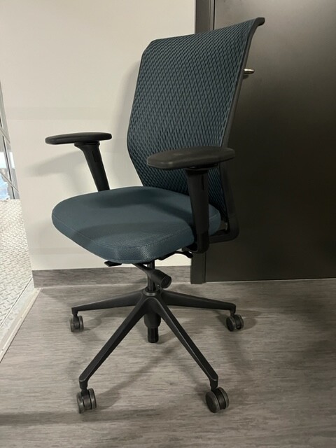 Sæde i stof (blå). Ryg i mesh (blå). Fodkryds i metal (sort). Højdejusterbar.
