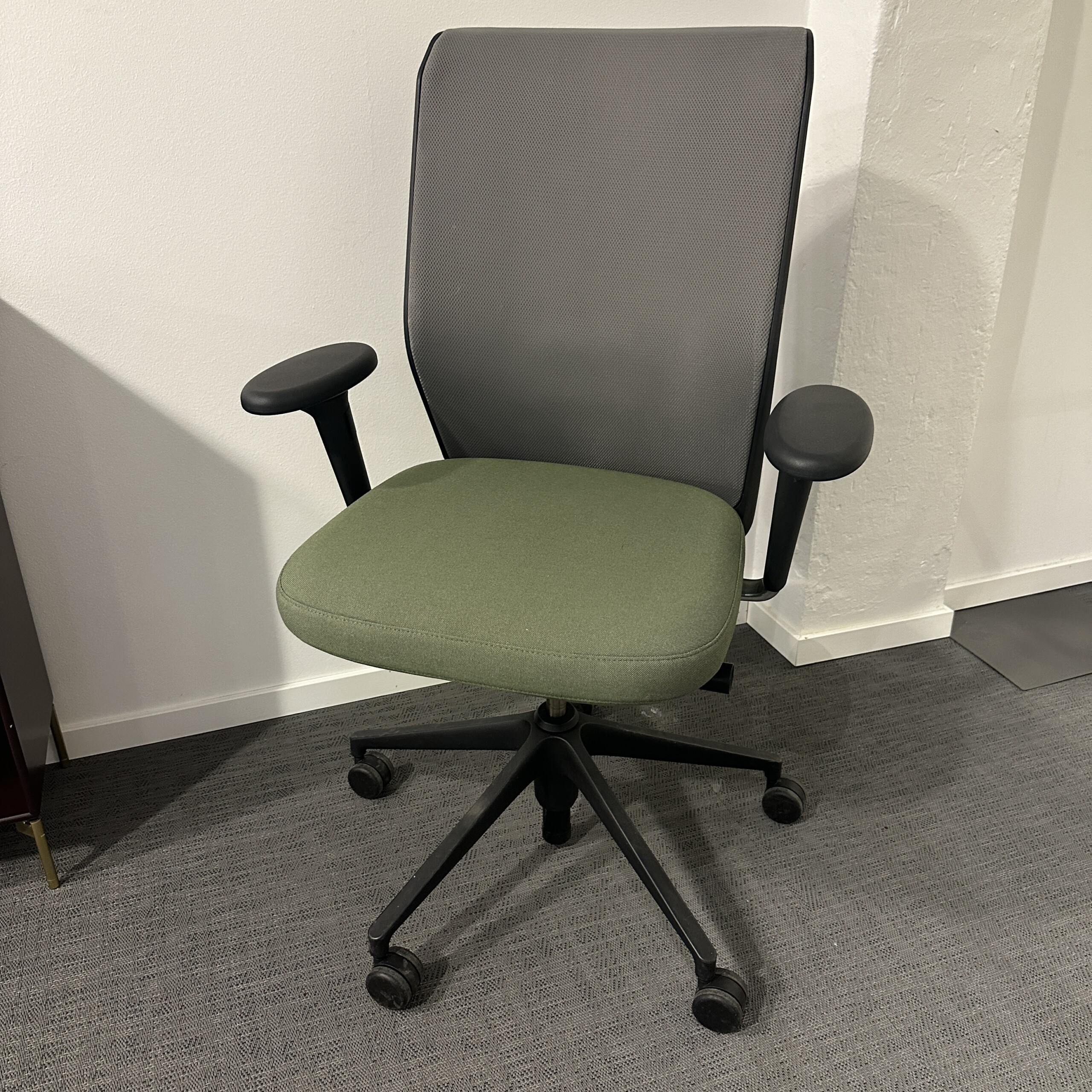 Sæde i stof (grøn). Ryg i stof (grå). Fodkryds i plast (sort). Højdejusterbar.