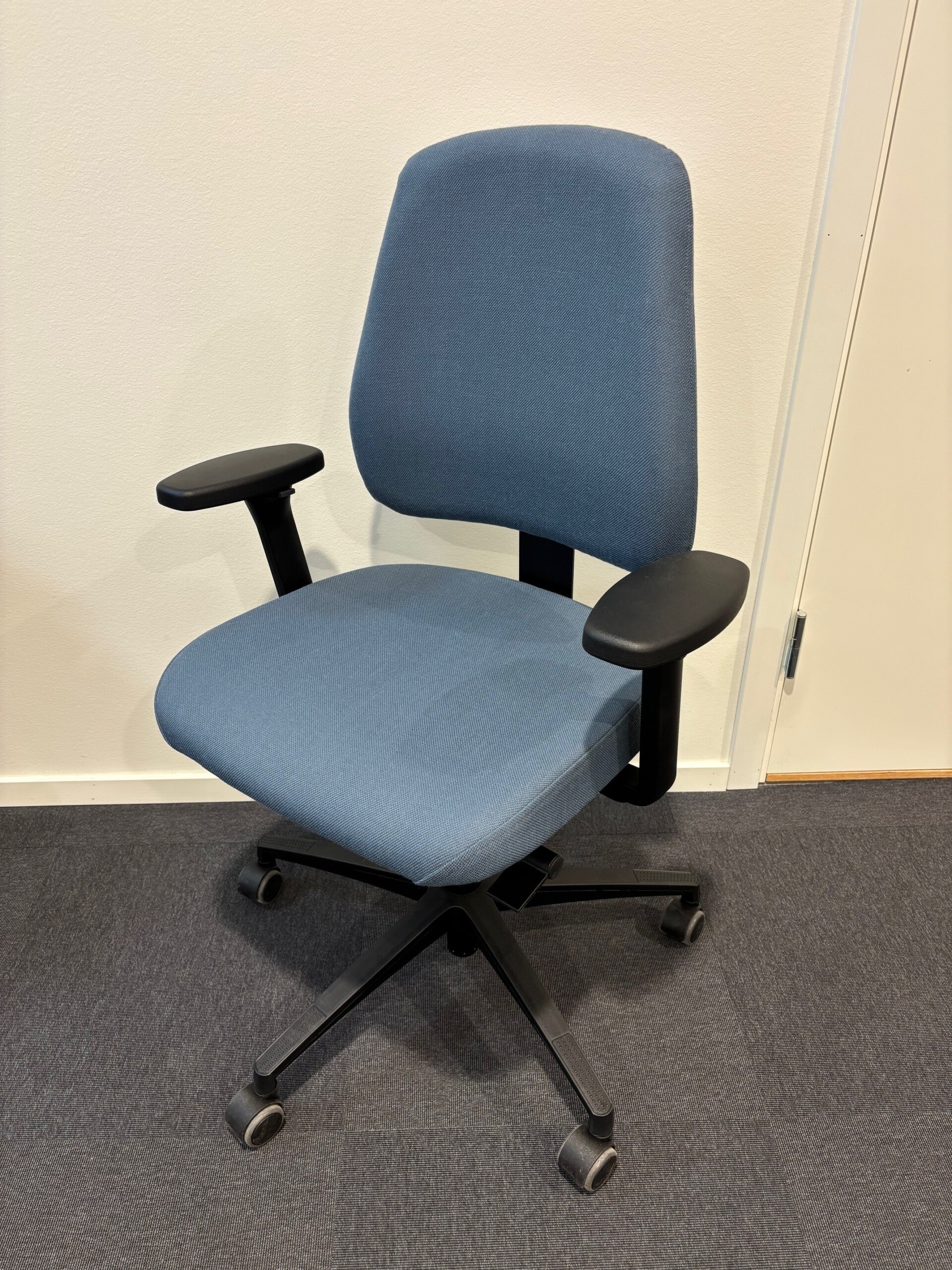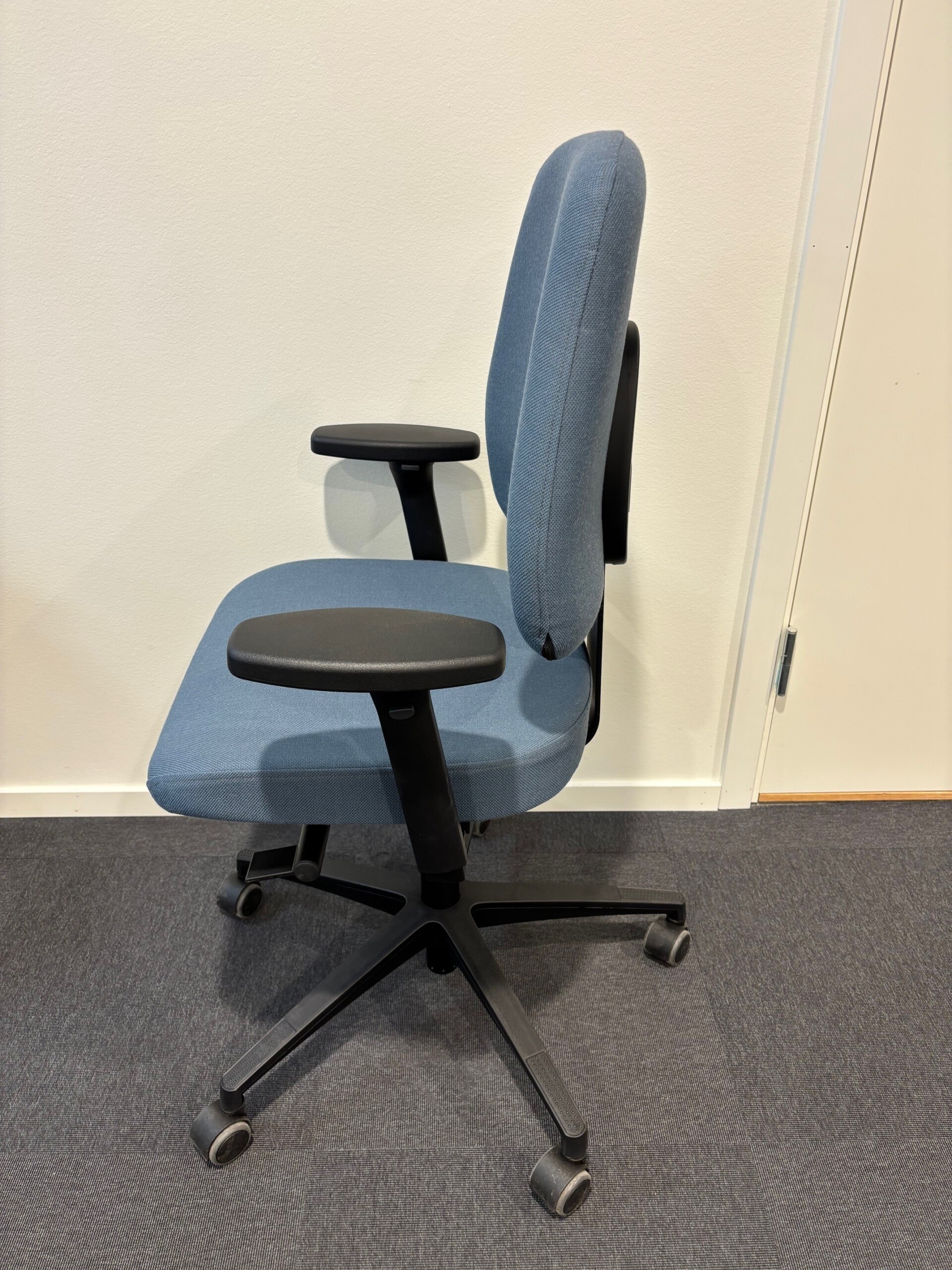 Sæde og ryg i stof (blå). Fodkryds i plast (sort). Højdejusterbar.