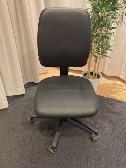 Sæde og ryg i kunstlæder (sort). Fodkryds i plast (sort). Højdejusterbar.