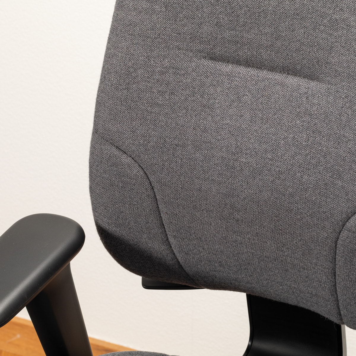 Sæde og ryg i stof (grå). Fodkryds i metal (sort). Højdejusterbar.