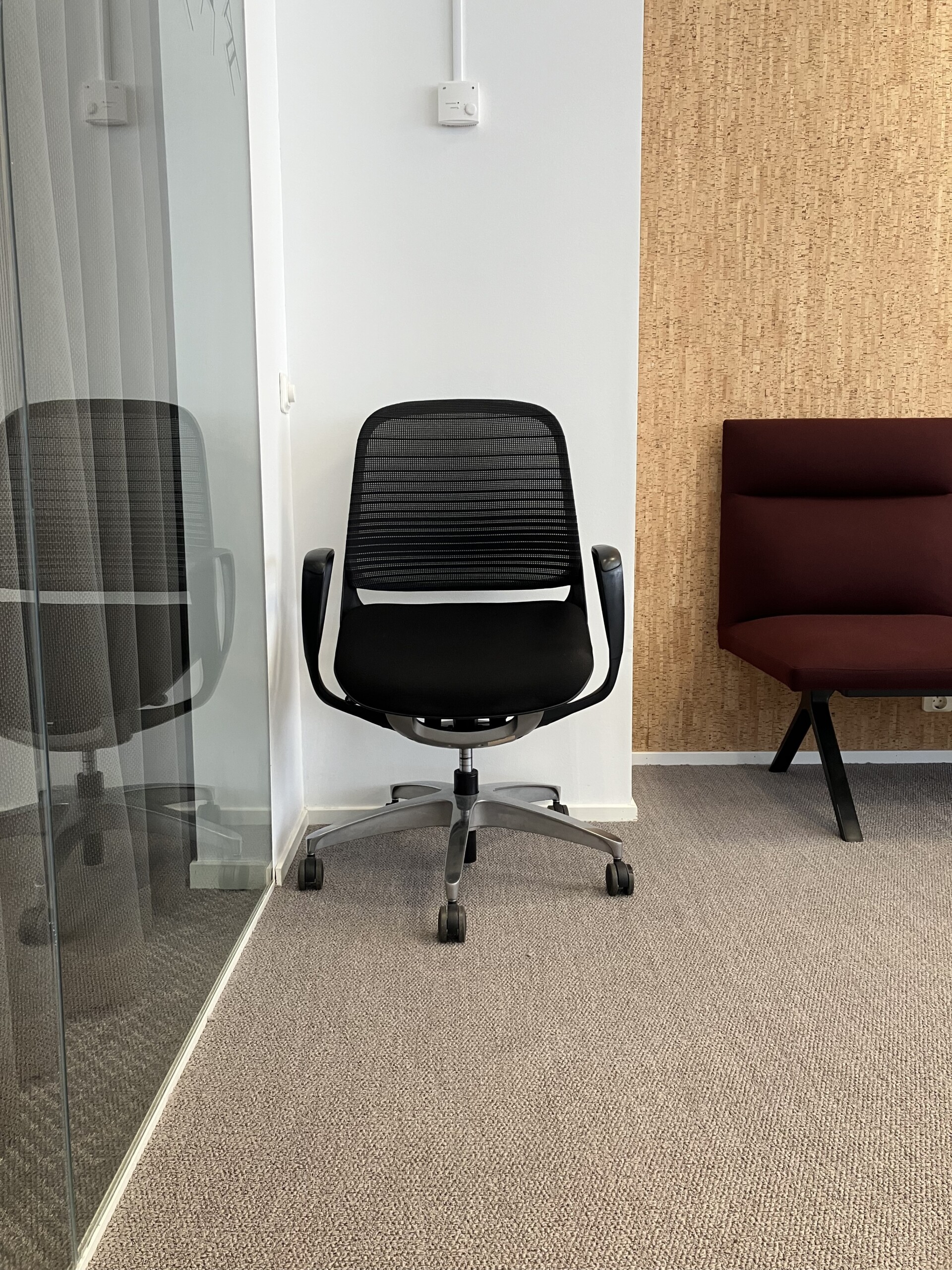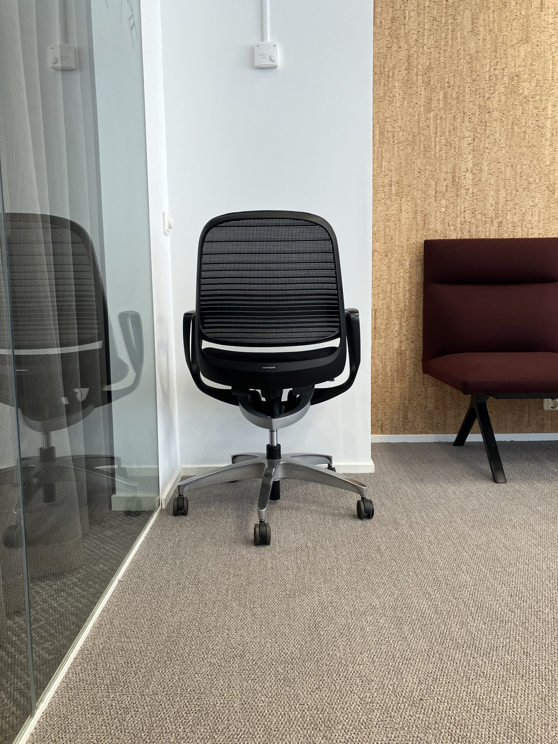 Sæde i stof (sort). Ryg i mesh (sort). Fodkryds i metal (sølv). Højdejusterbar.