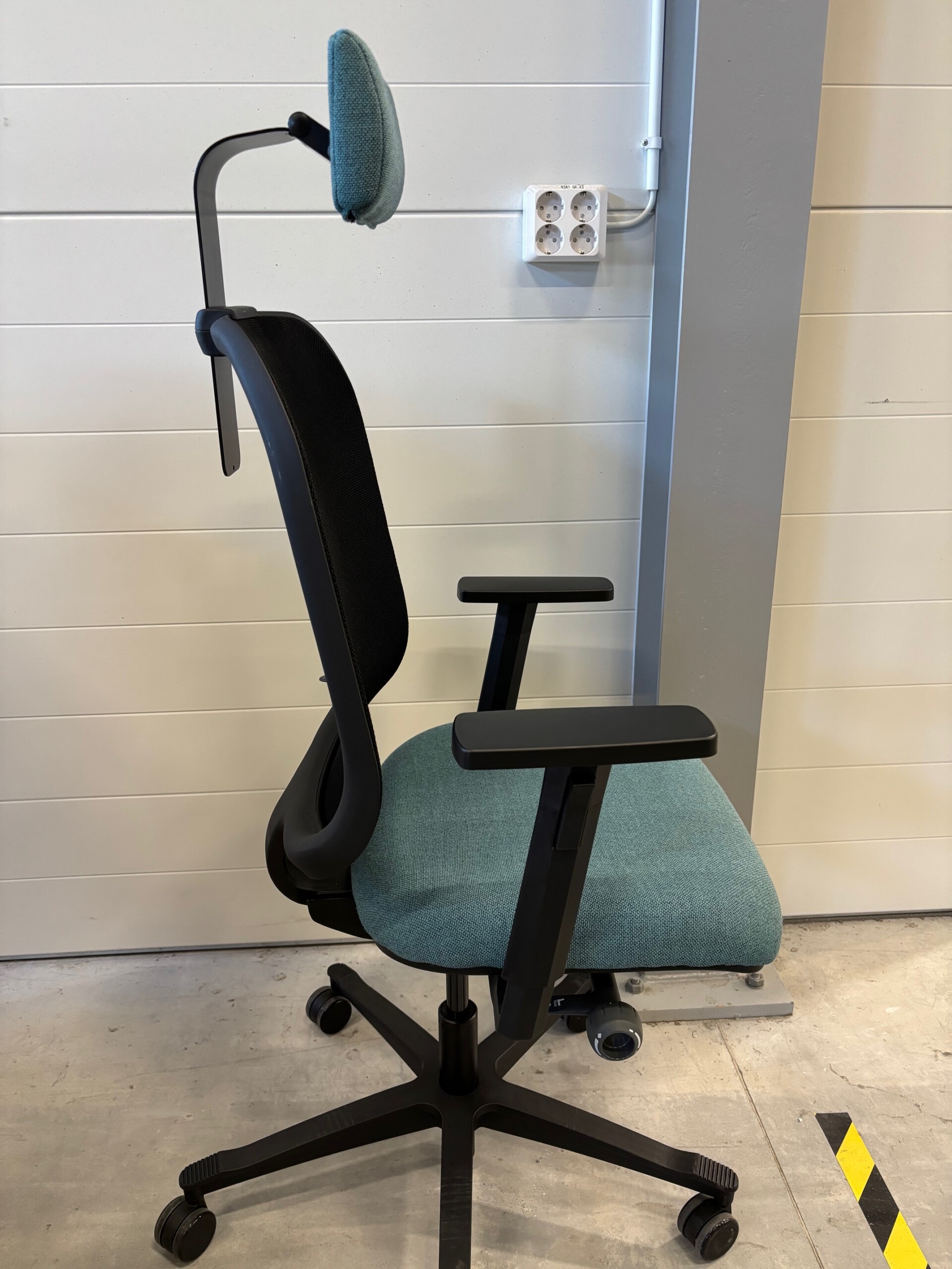 Sæde i stof (turkis). Ryg i mesh (sort). Fodkryds i plast (sort). Højdejusterbar.