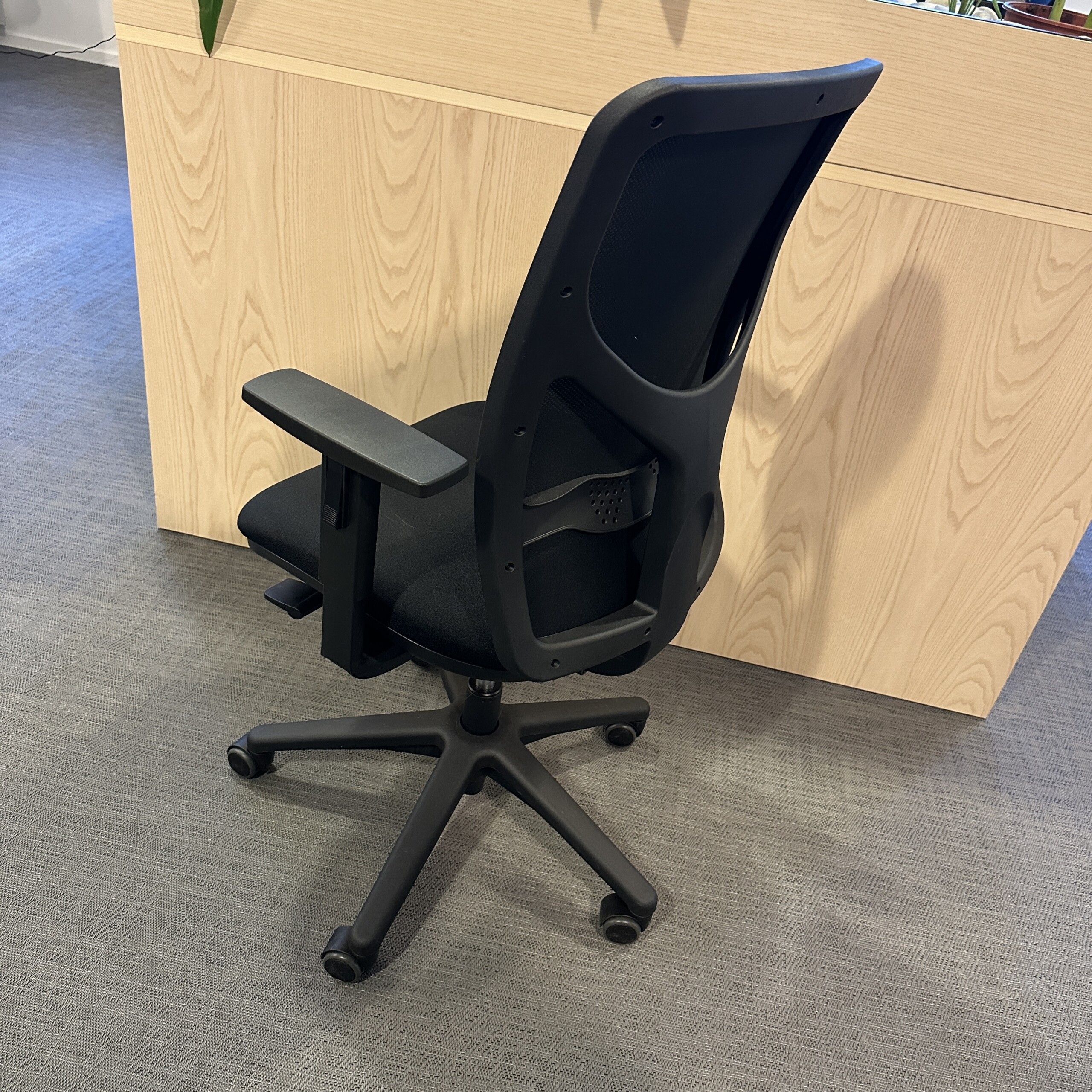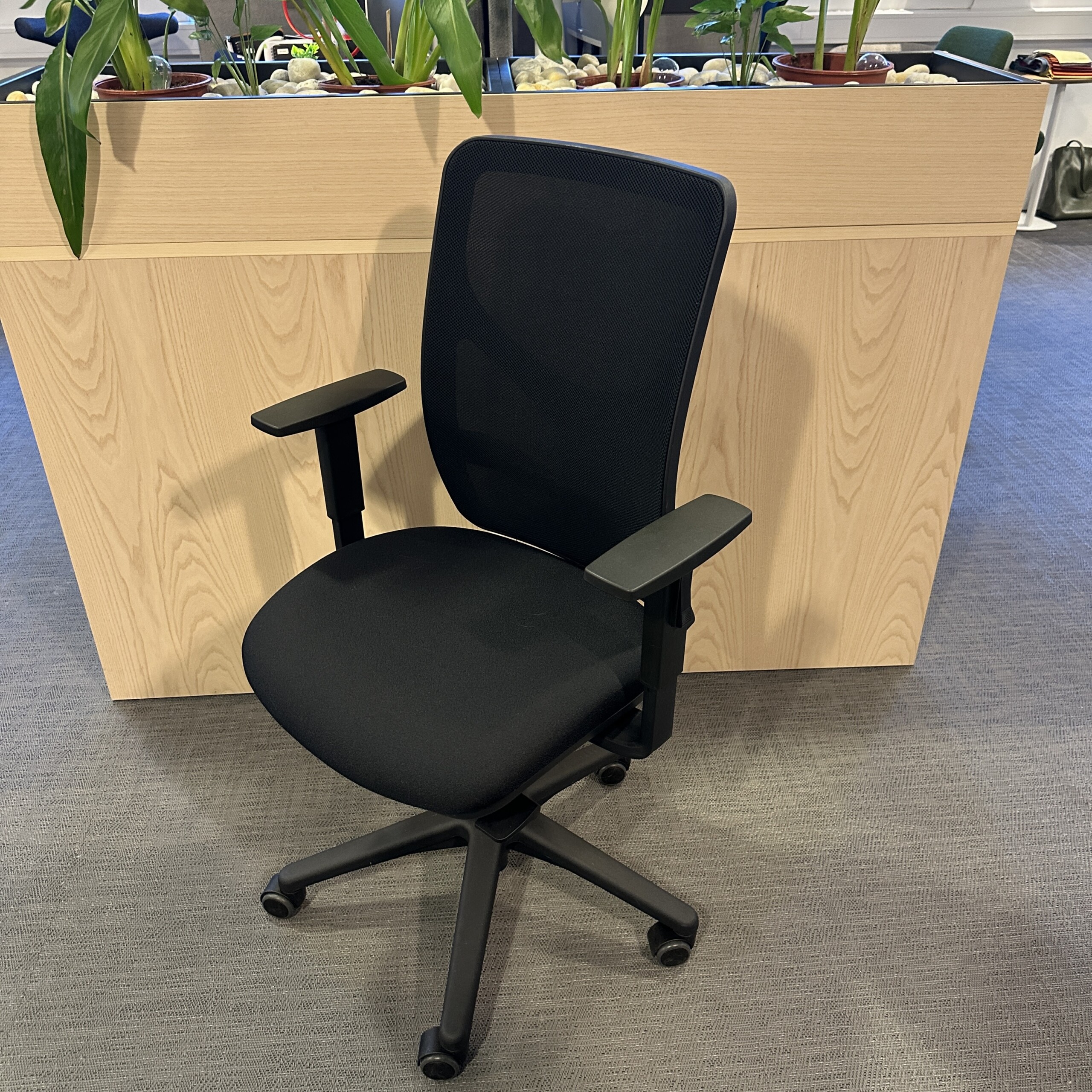 Sæde i stof (sort). Ryg i mesh (sort). Fodkryds i plast (sort). Højdejusterbar.