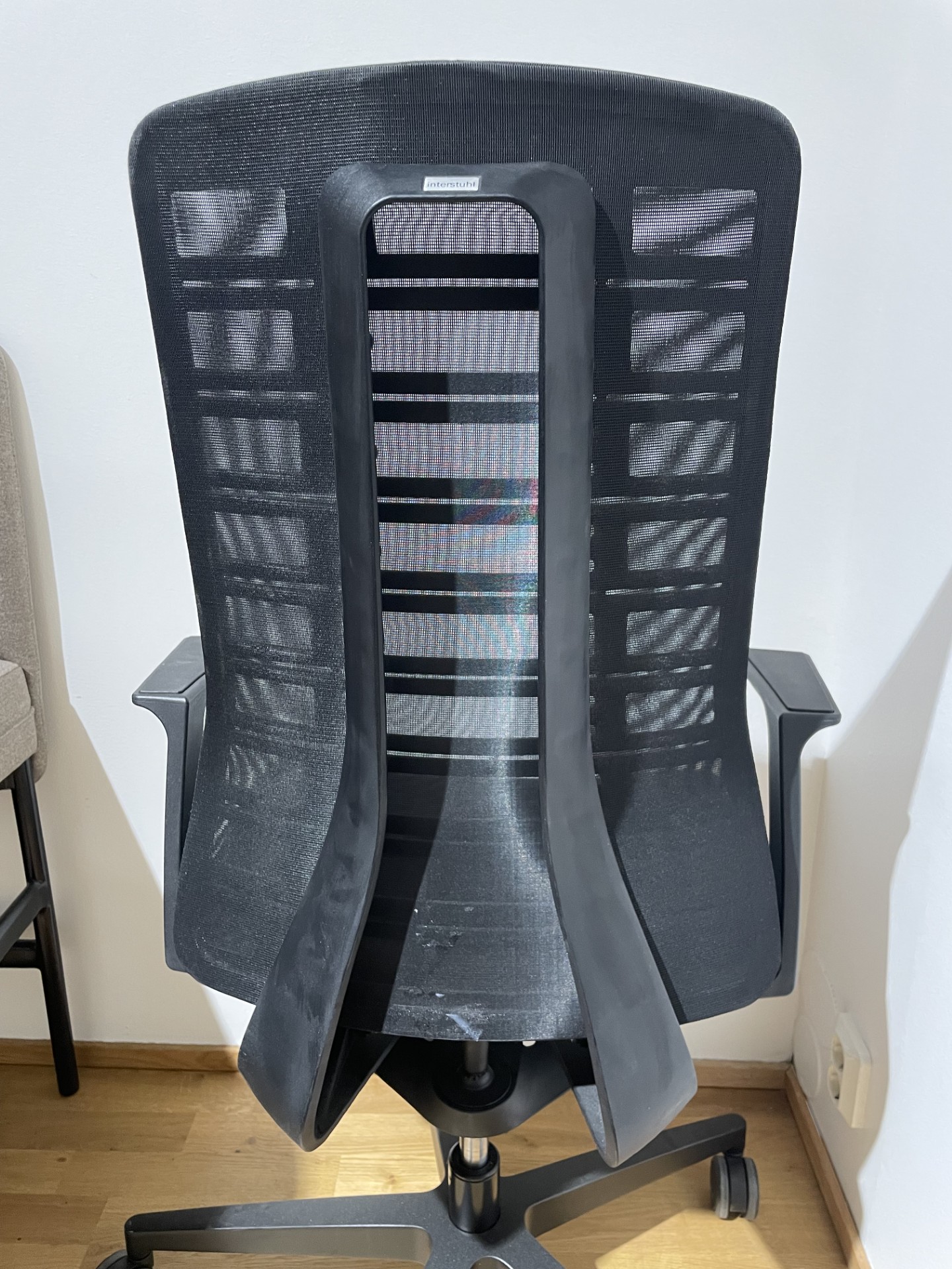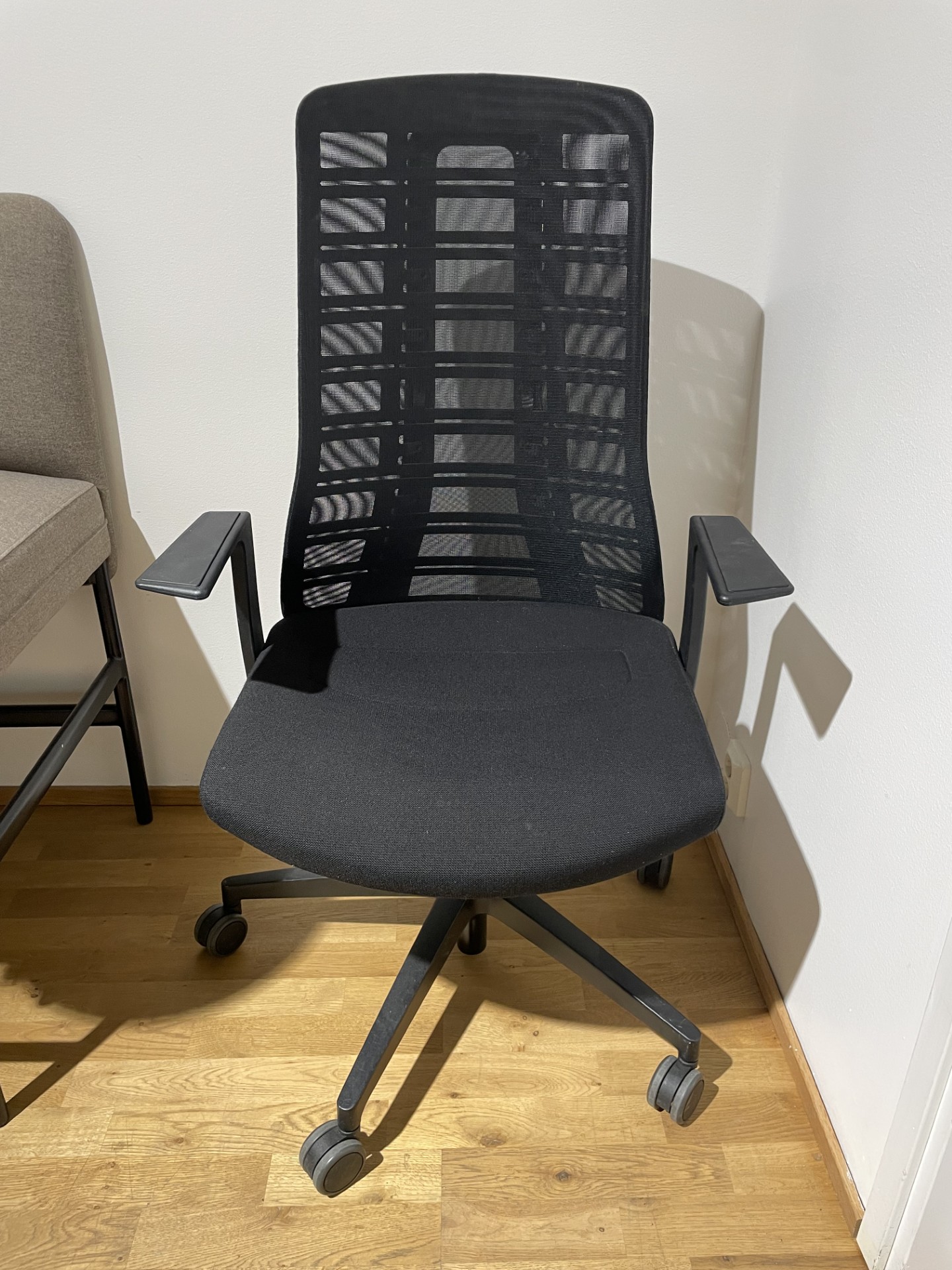Sæde i stof (sort). Ryg i mesh (sort). Fodkryds i metal (sort).