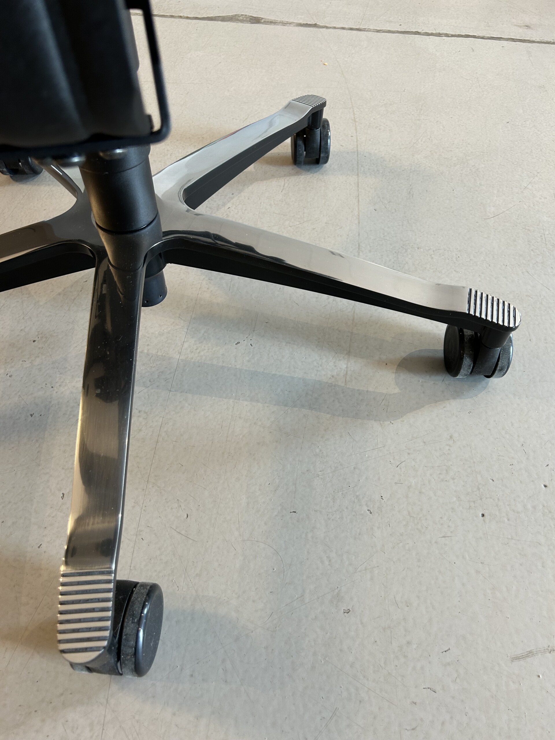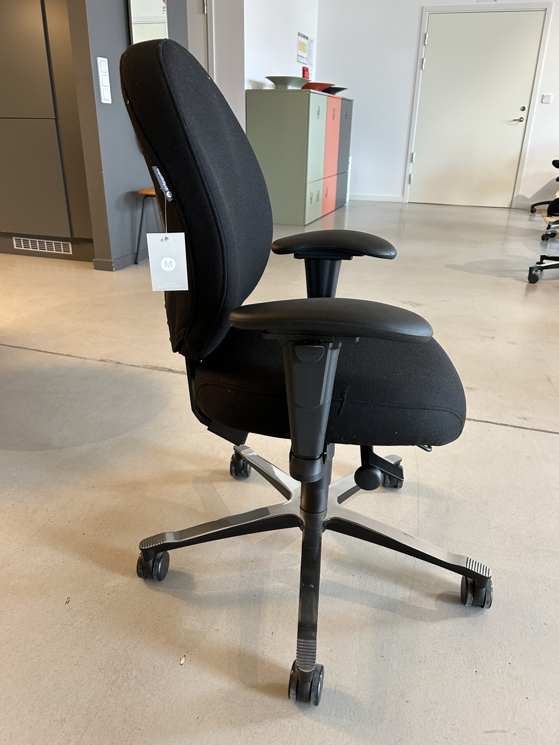 Sæde og ryg i stof (sort). Fodkryds i metal (aluminium). Højdejusterbar.