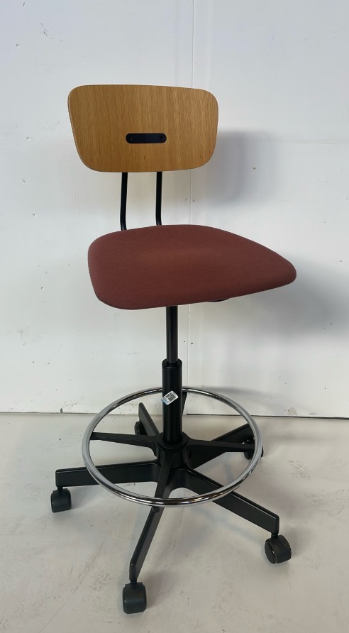 Sæde i stof (brun). Ryg i træ (eg). Fodkryds i metal (sort). Højdejusterbar.