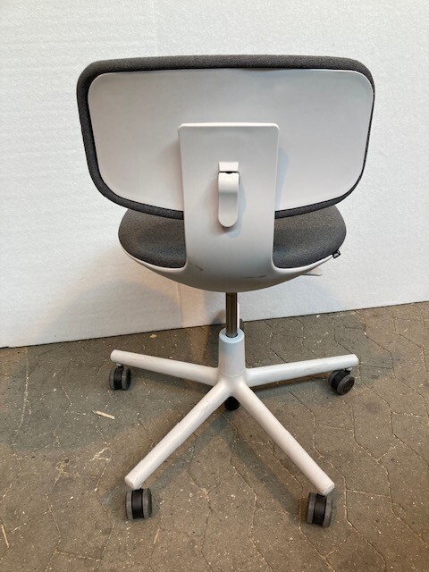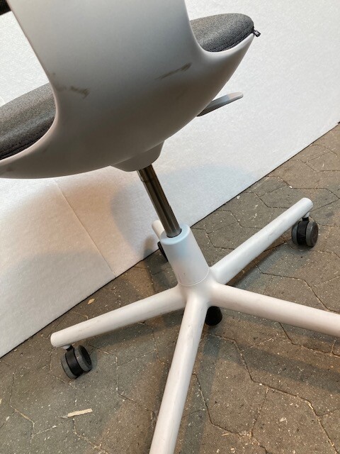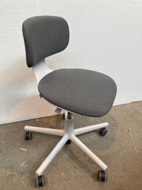 Sæde og ryg i stof (grå). Fodkryds i plast (hvid). Højdejusterbar.