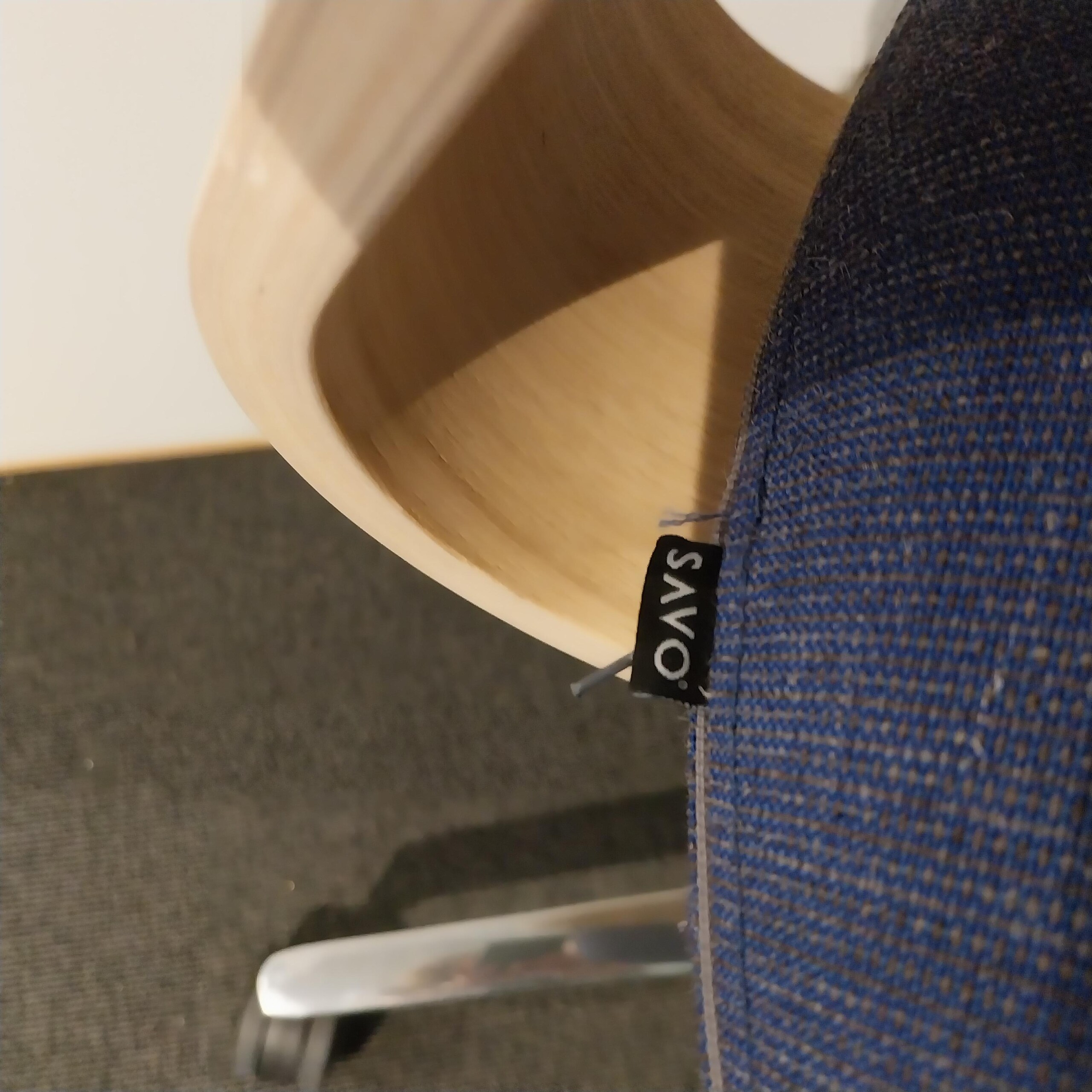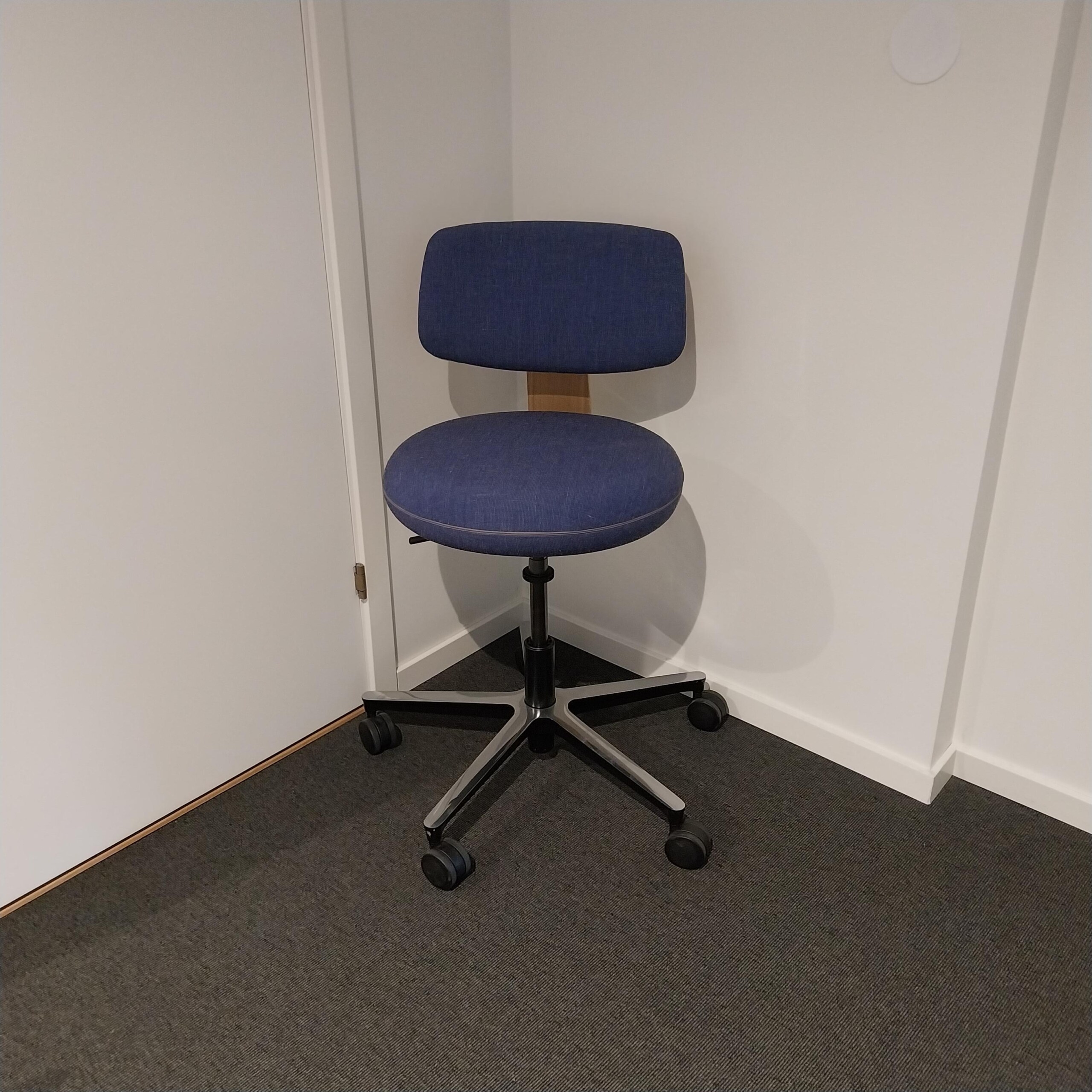 Sæde og ryg i stof (blå). Fodkryds i metal (aluminium). Højdejusterbar.