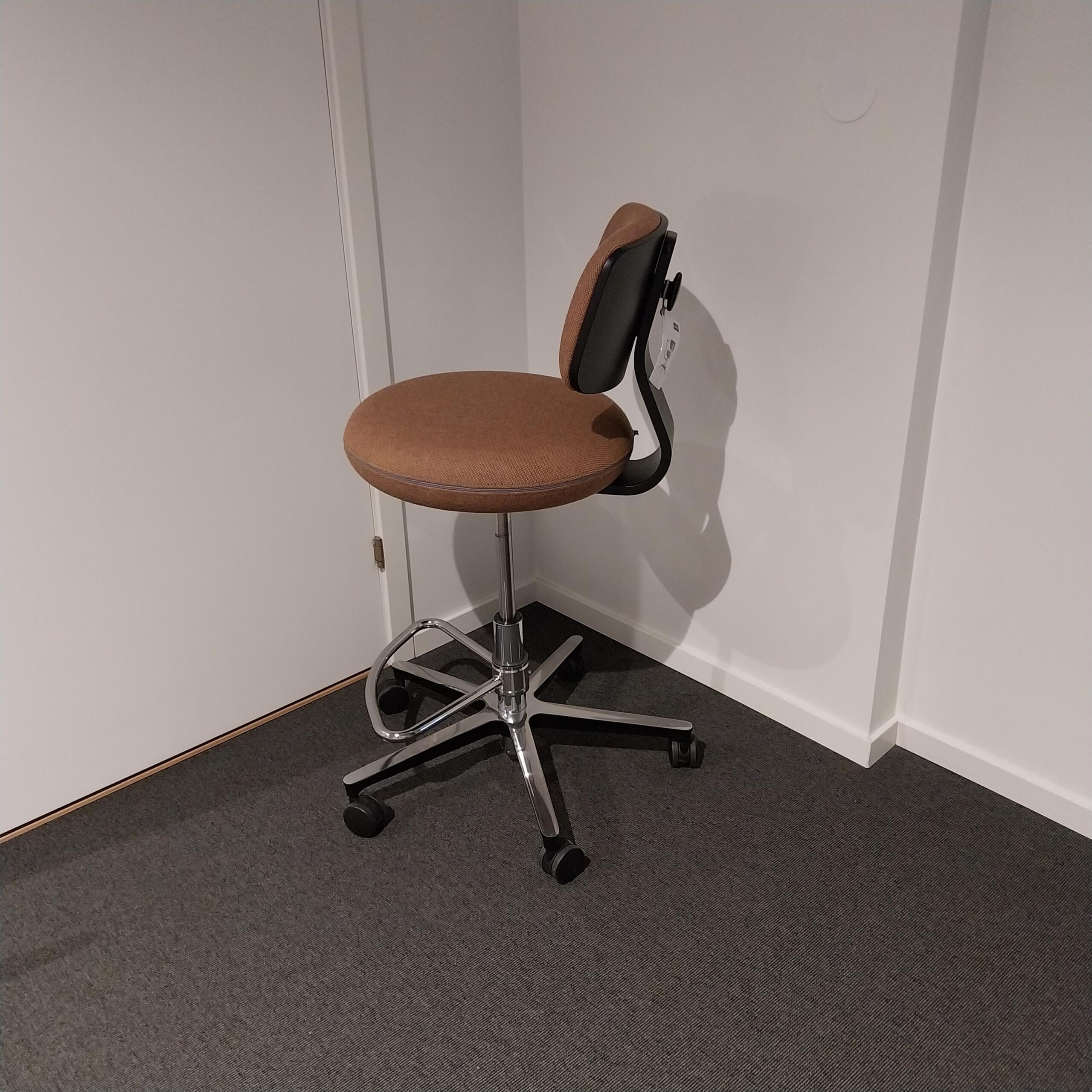 Sæde og ryg i stof (brun). Fodkryds i metal (krom). Højdejusterbar.