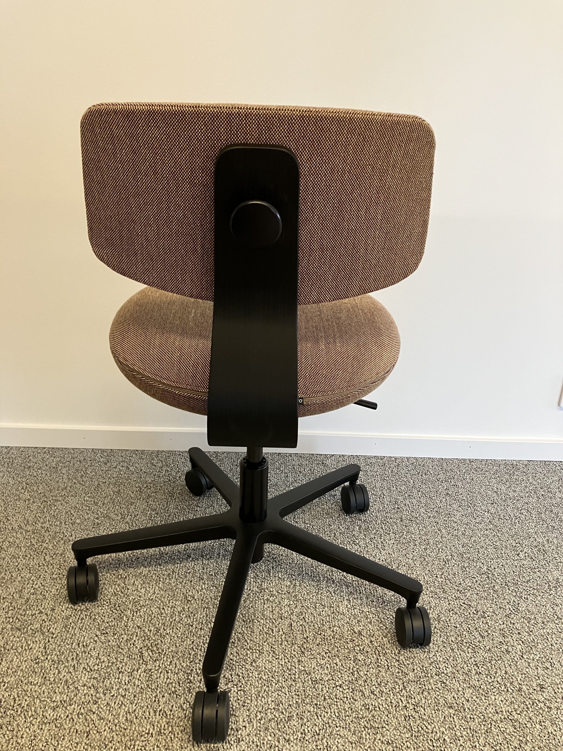 Sæde og ryg i stof. Fodkryds i metal (sort). Højdejusterbar.