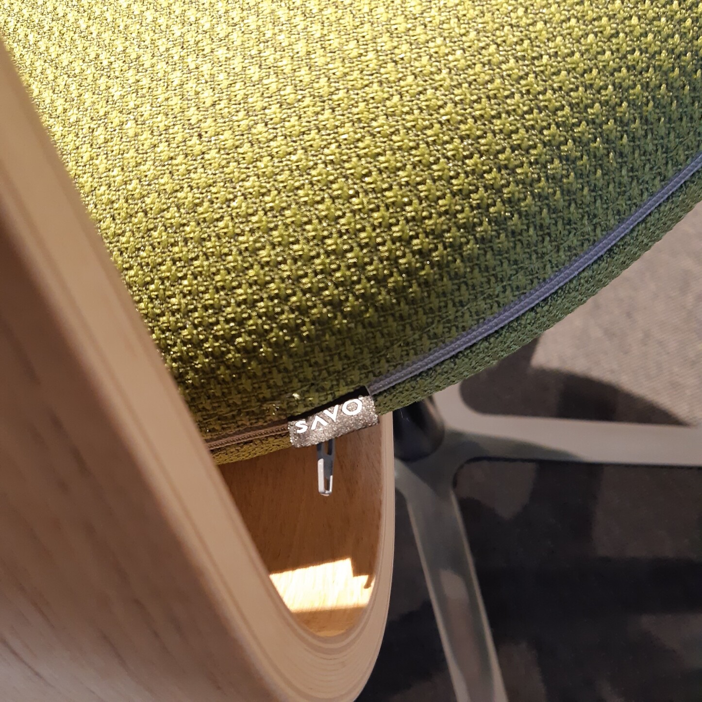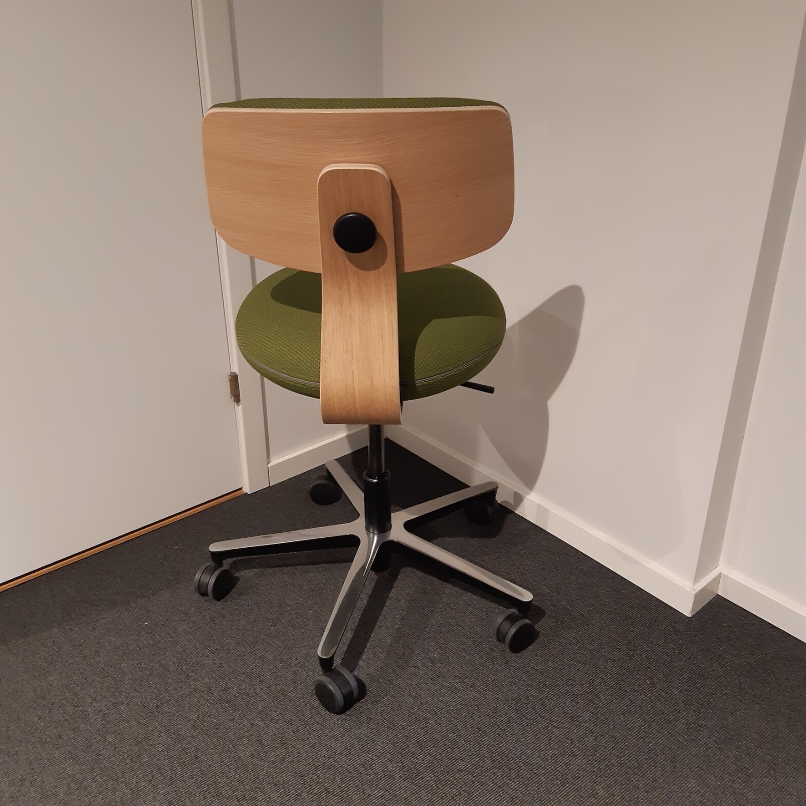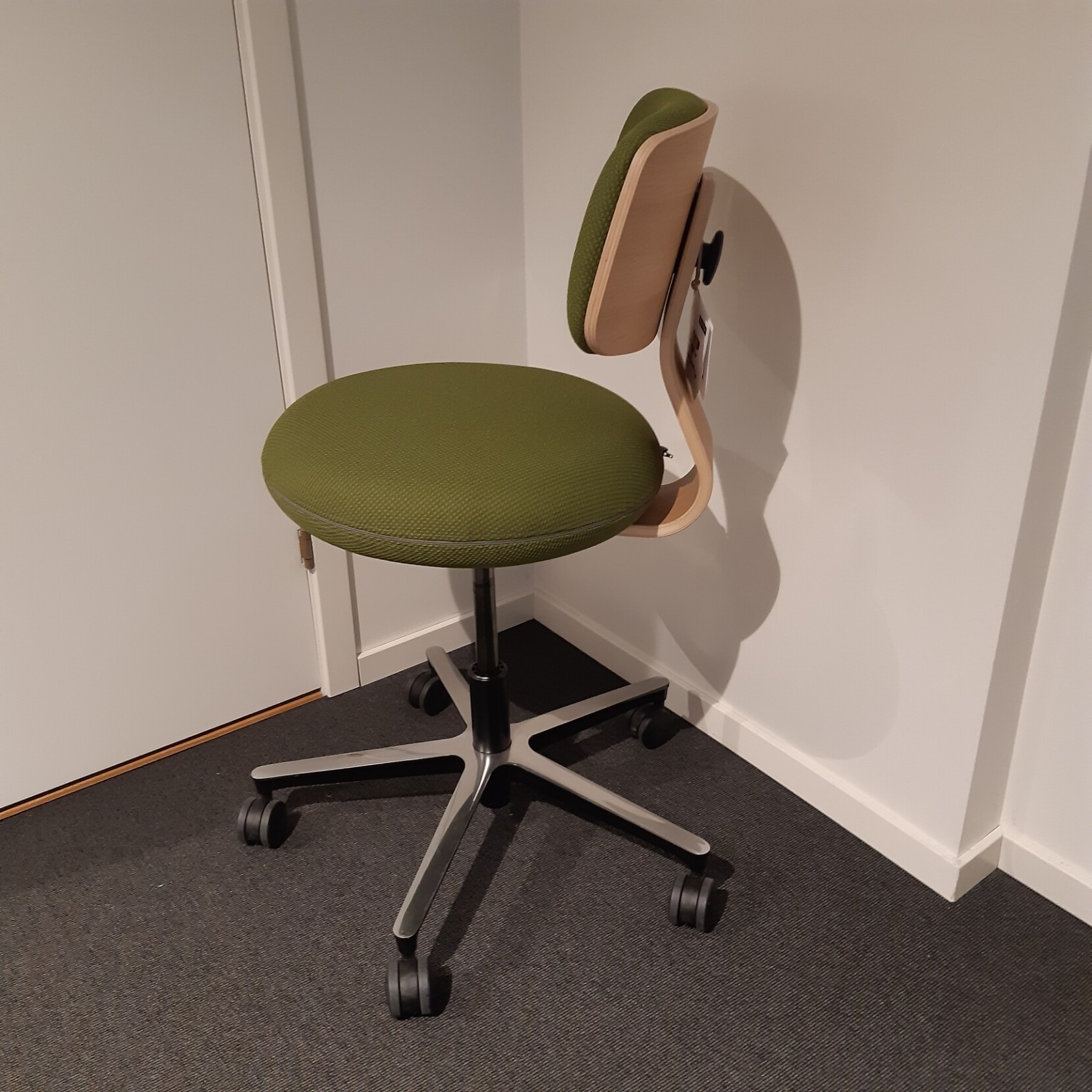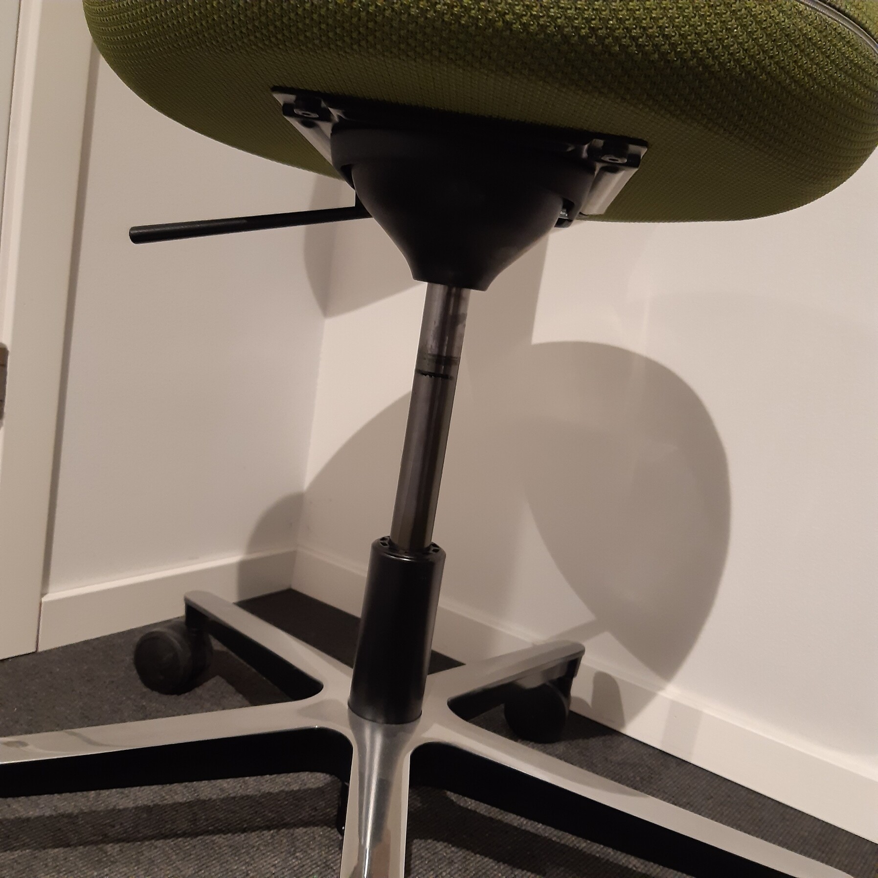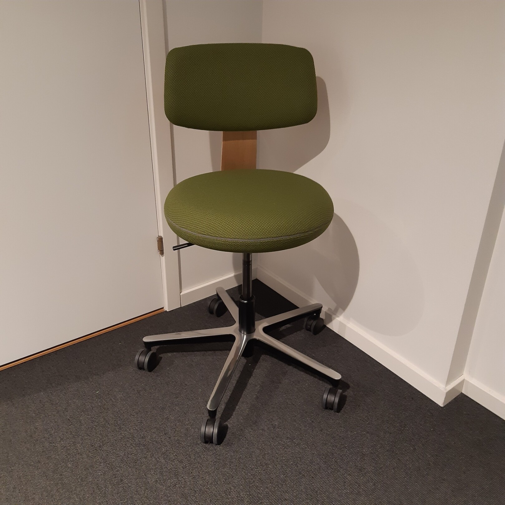 Sæde og ryg i stof (grøn). Fodkryds i metal (aluminium). Højdejusterbar.