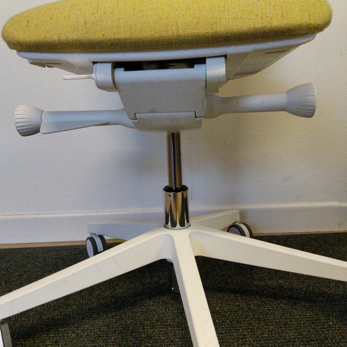 Sæde i stof (gul). Ryg i mesh (gul). Fodkryds i plast (hvid). Højdejusterbar.