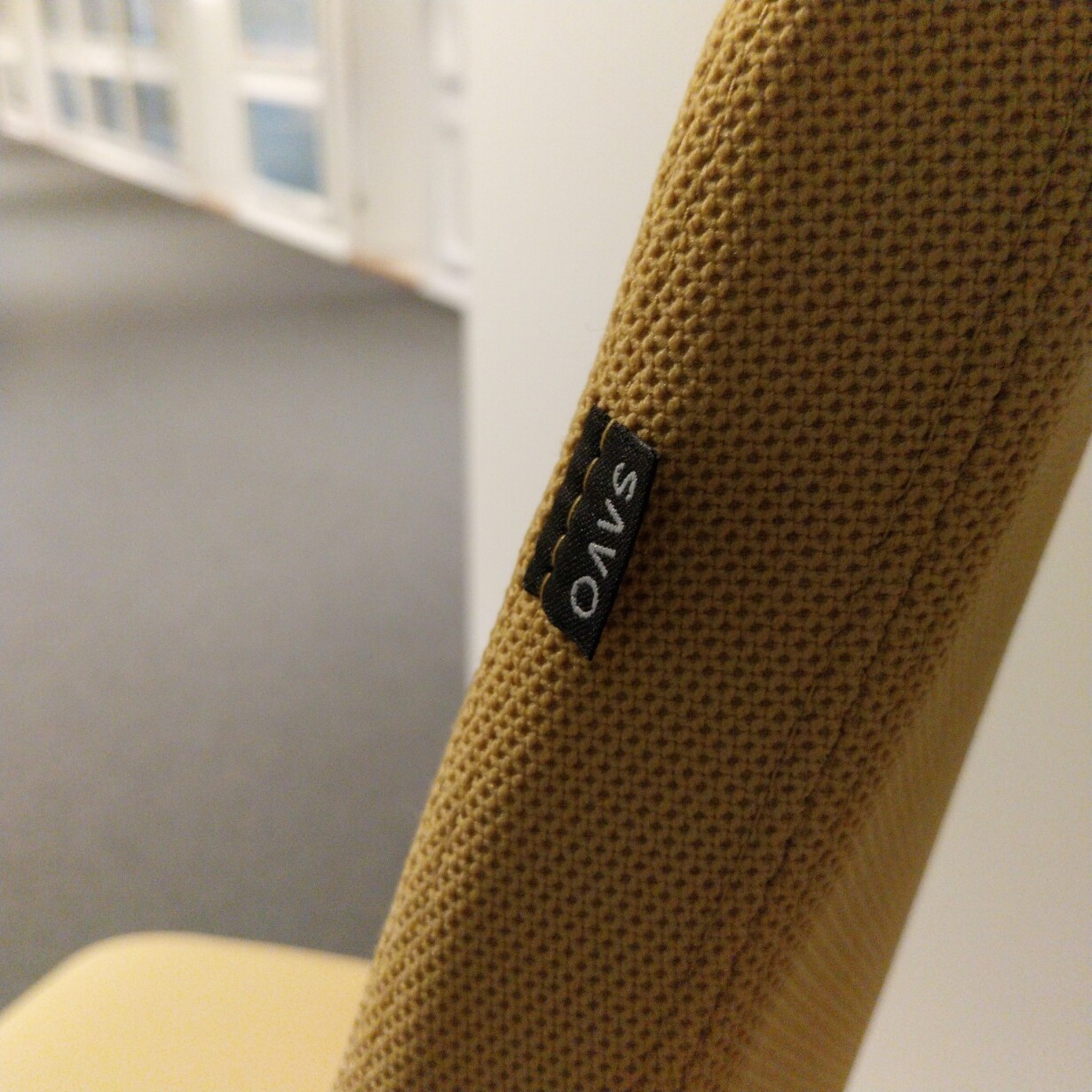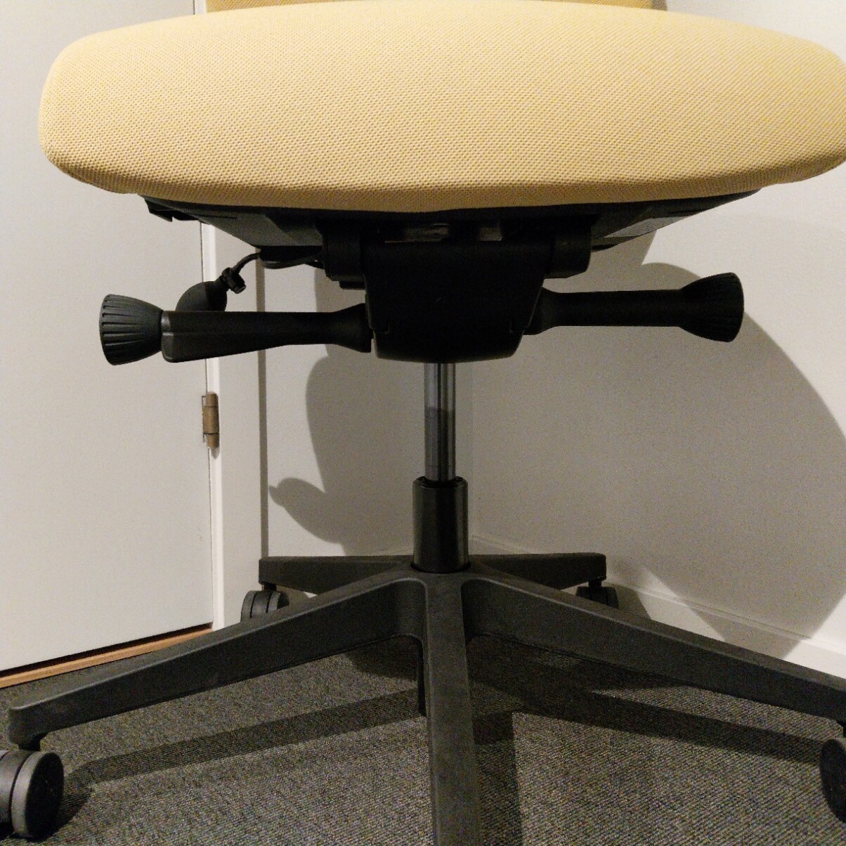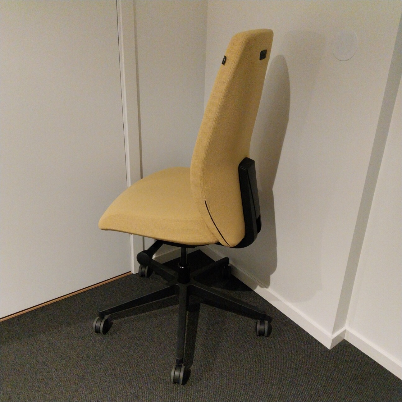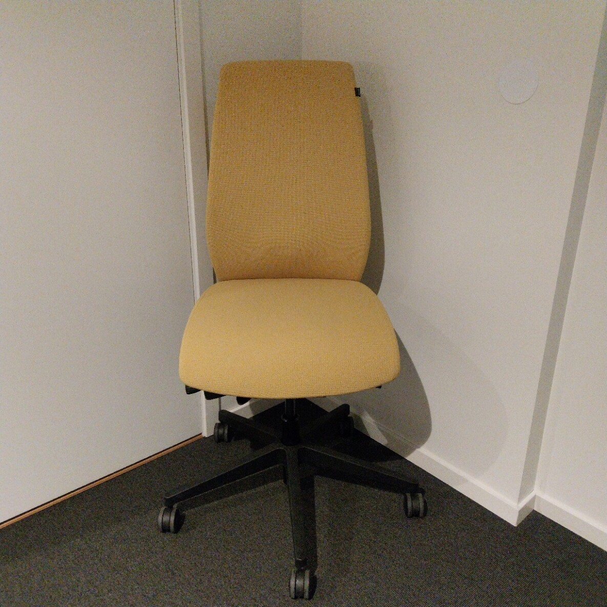 Sæde og ryg i stof (gul). Fodkryds i plast (sort). Højdejusterbar.