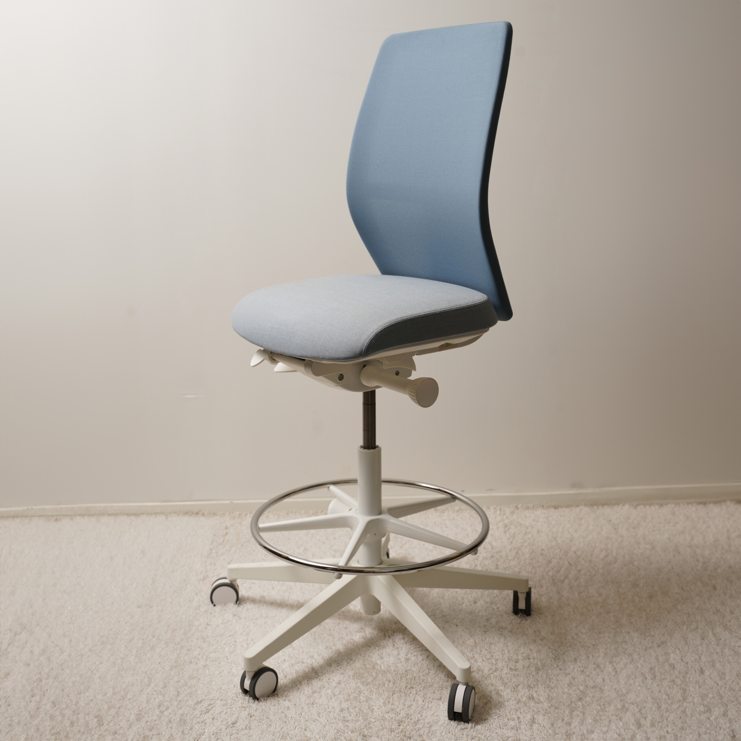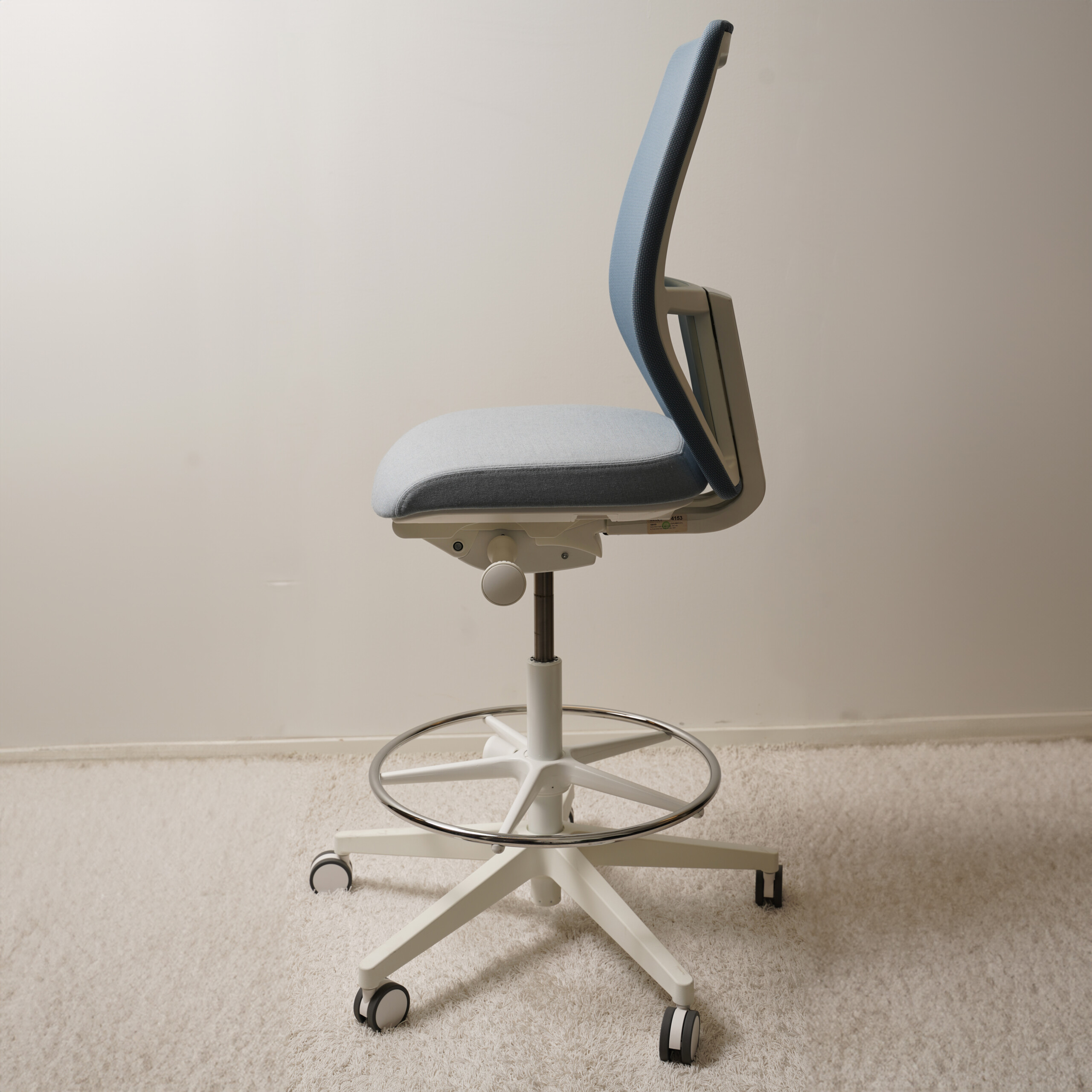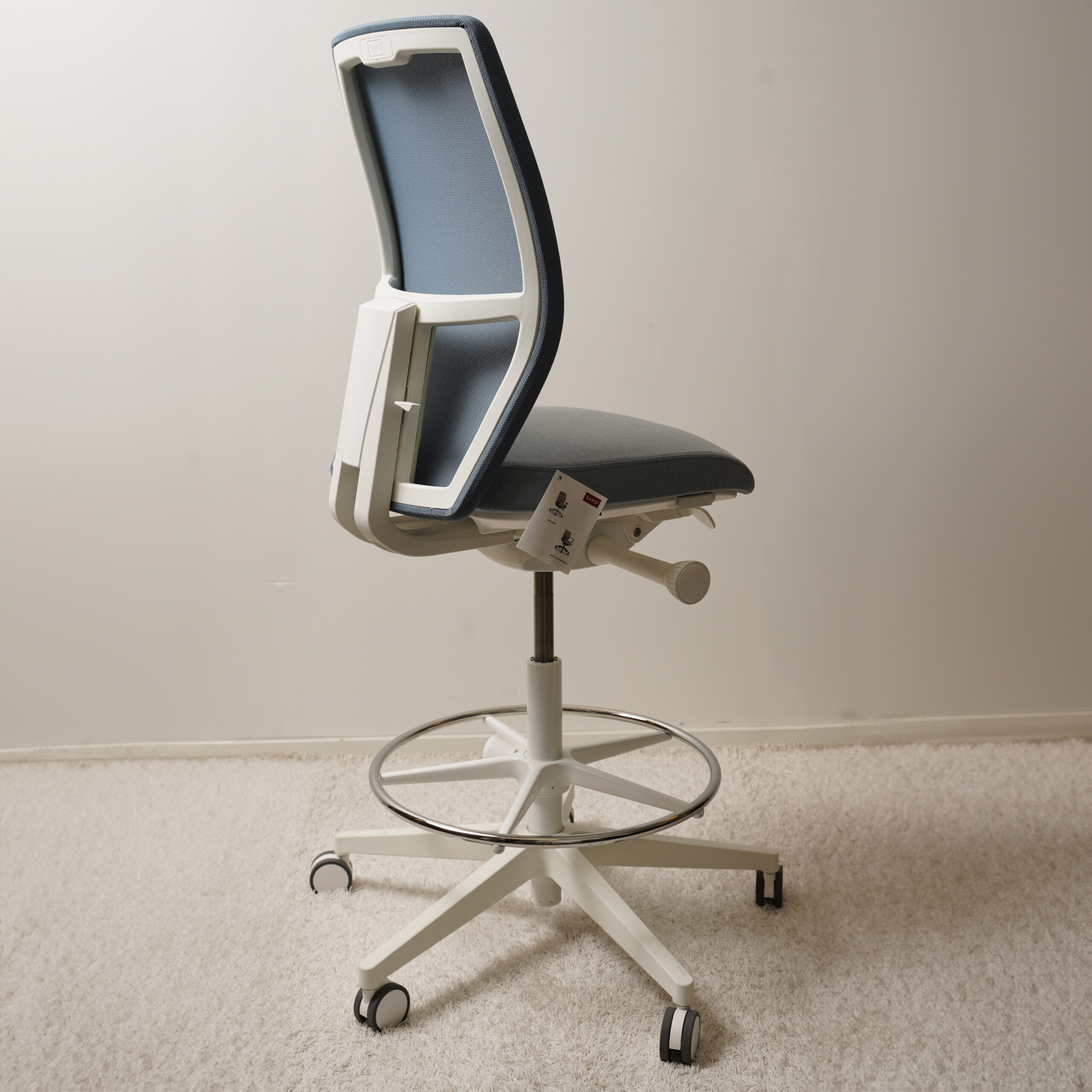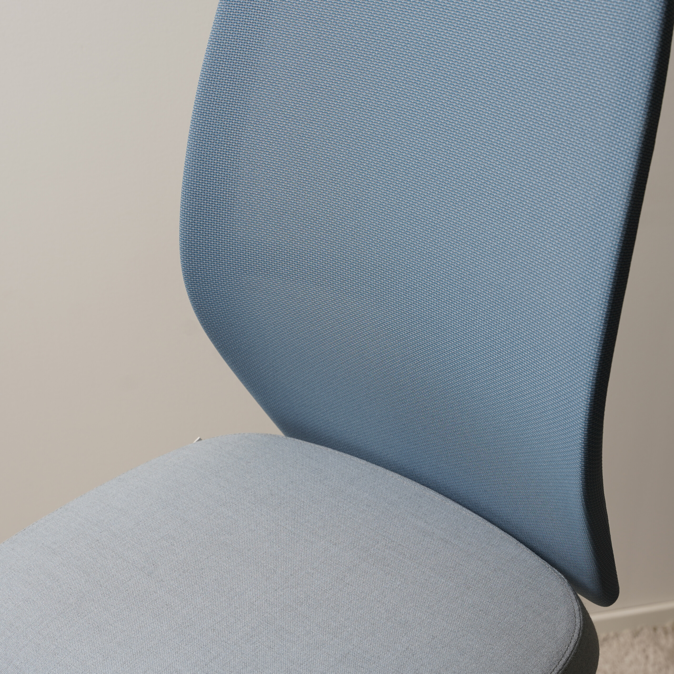 Sæde i stof (blå). Ryg i mesh (blå). Fodkryds i metal (hvid). Højdejusterbar.