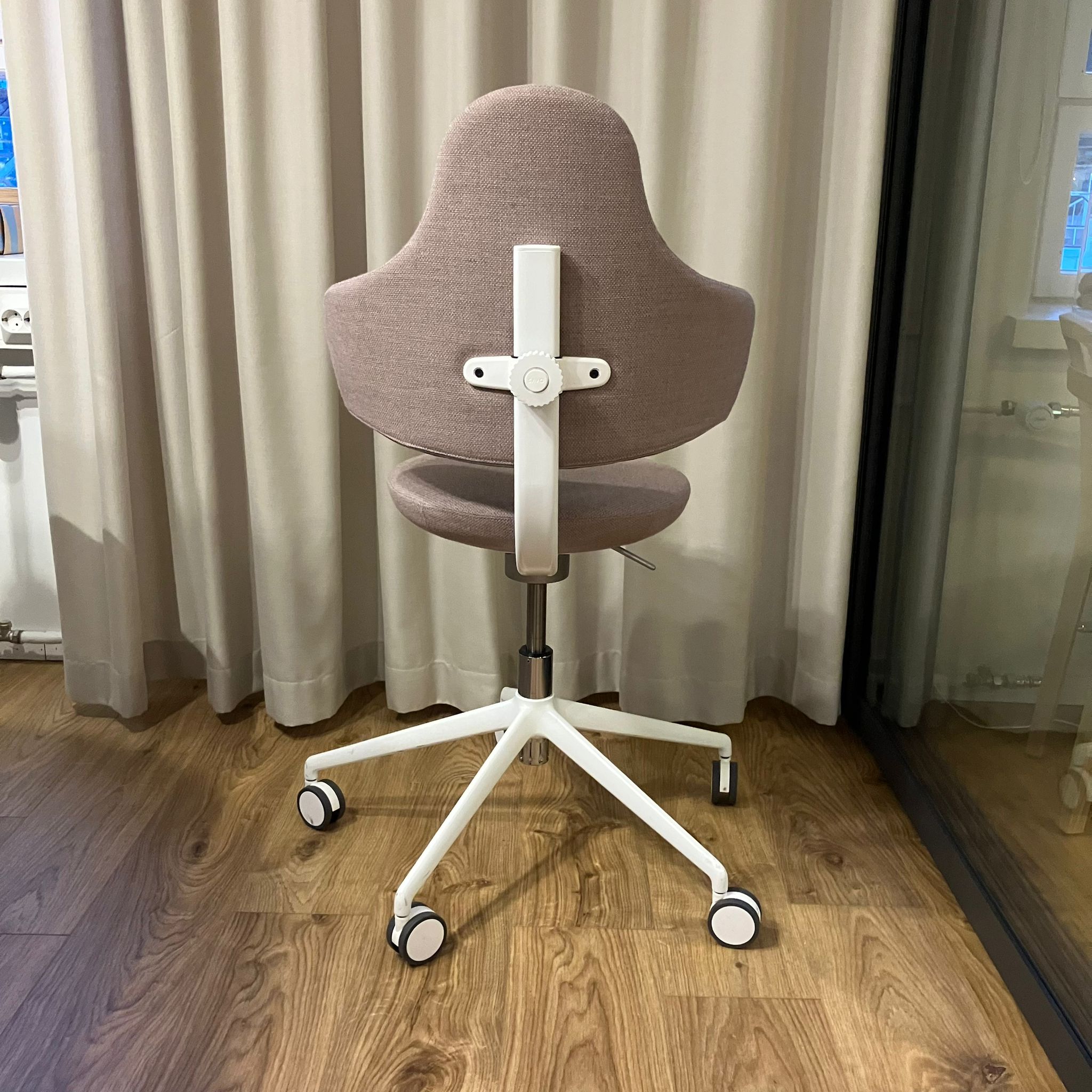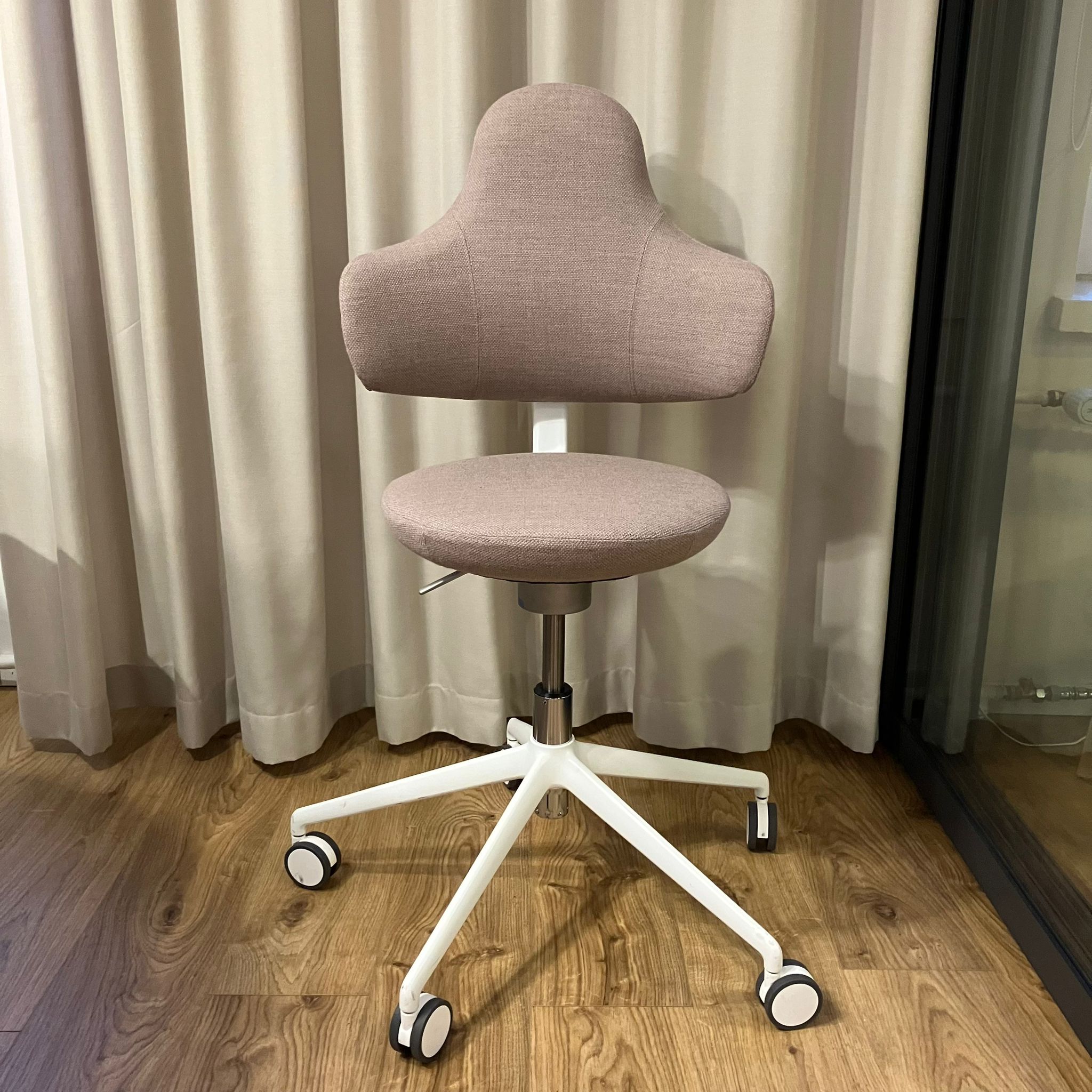 Sæde og ryg i stof (lyserød). Fodkryds i metal (hvid). Højdejusterbar.