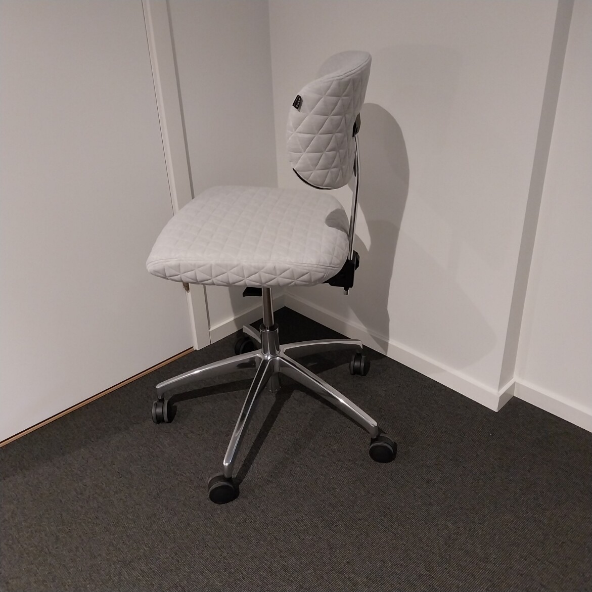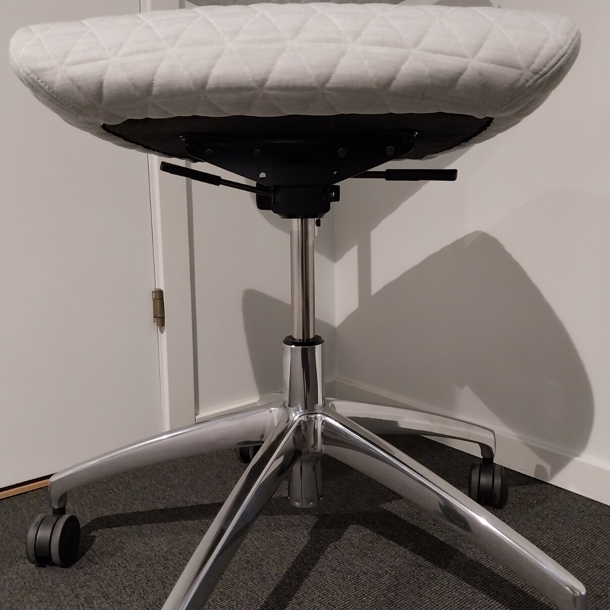 Sæde og ryg i stof (beige). Fodkryds i metal (aluminium). Højdejusterbar.