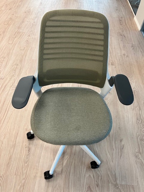 Sæde i stof (grøn). Ryg i mesh (grøn). Fodkryds i metal (beige). Højdejusterbar.