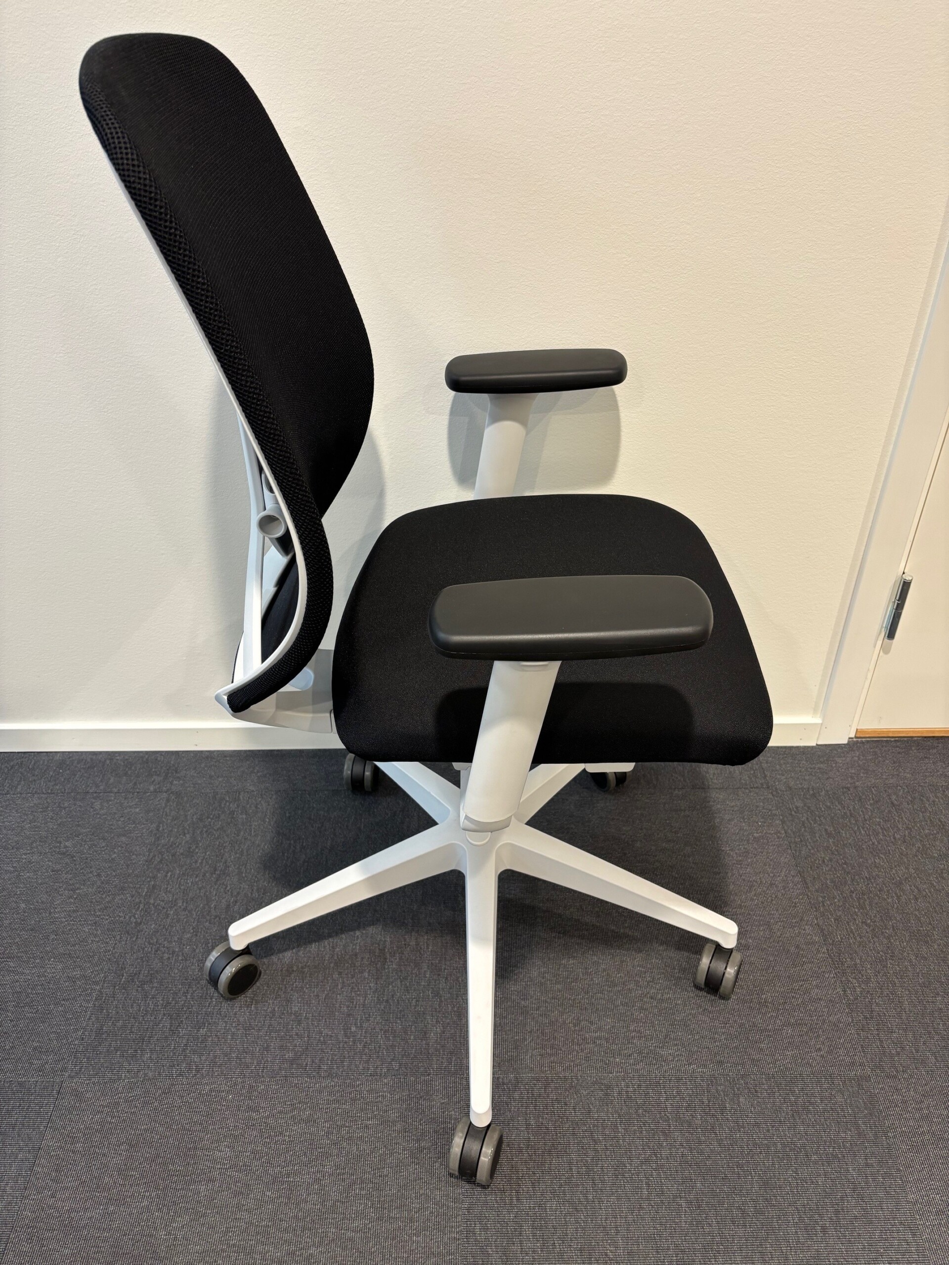 Sæde i stof (sort). Ryg i mesh (sort). Fodkryds i plast (hvid). Højdejusterbar.