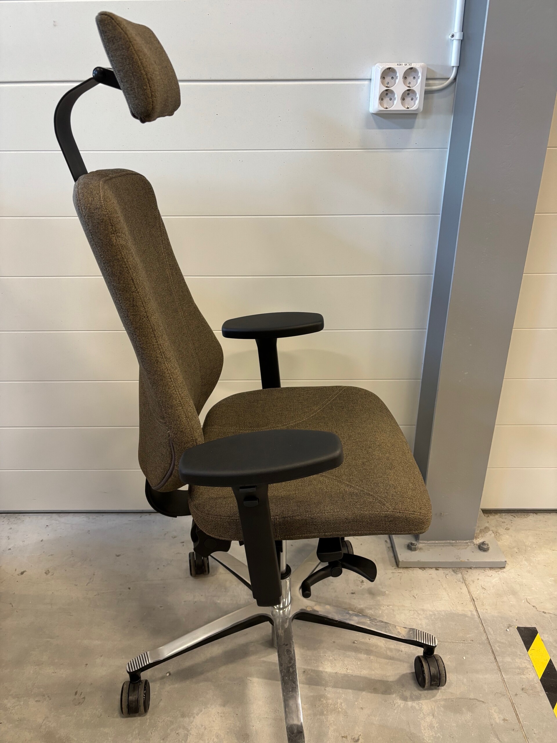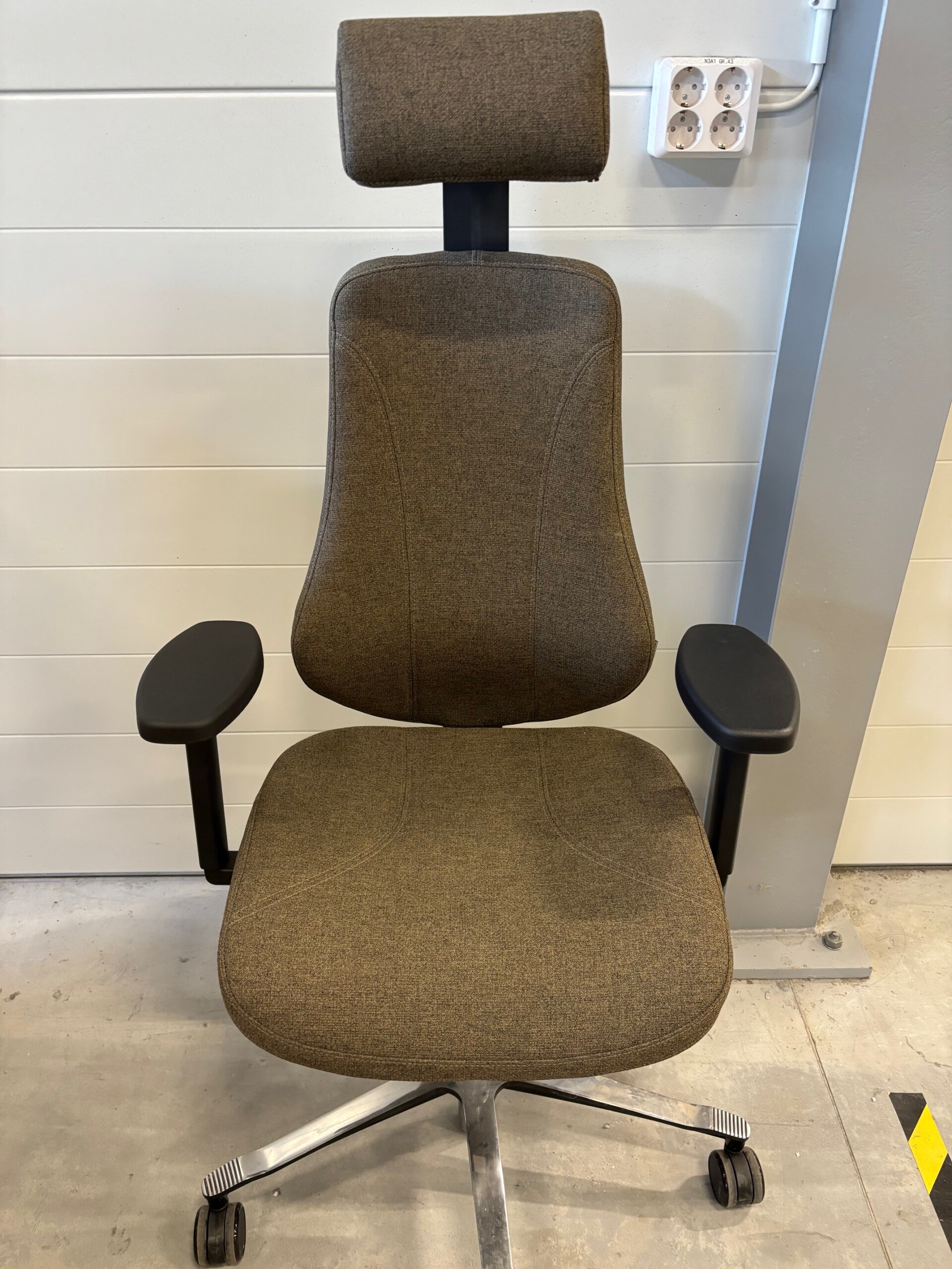 Sæde og ryg i stof (brun). Fodkryds i metal (aluminium). Højdejusterbar.