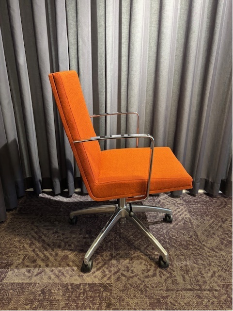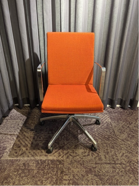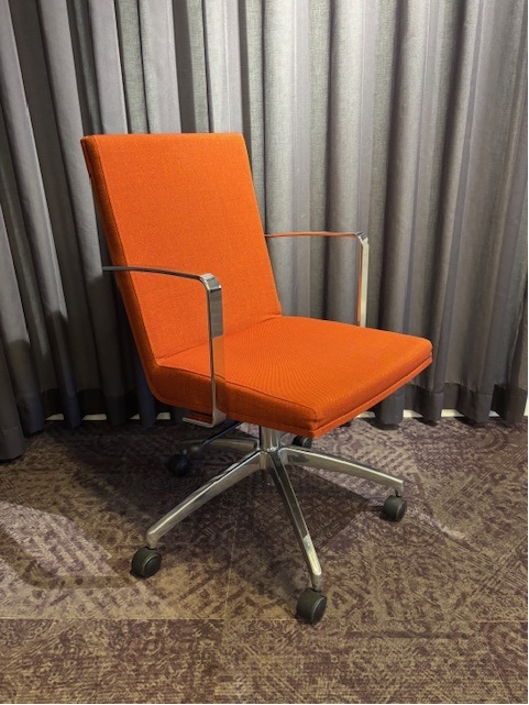 Sæde og ryg i stof (orange). Fodkryds i metal (rustfri). Højdejusterbar.