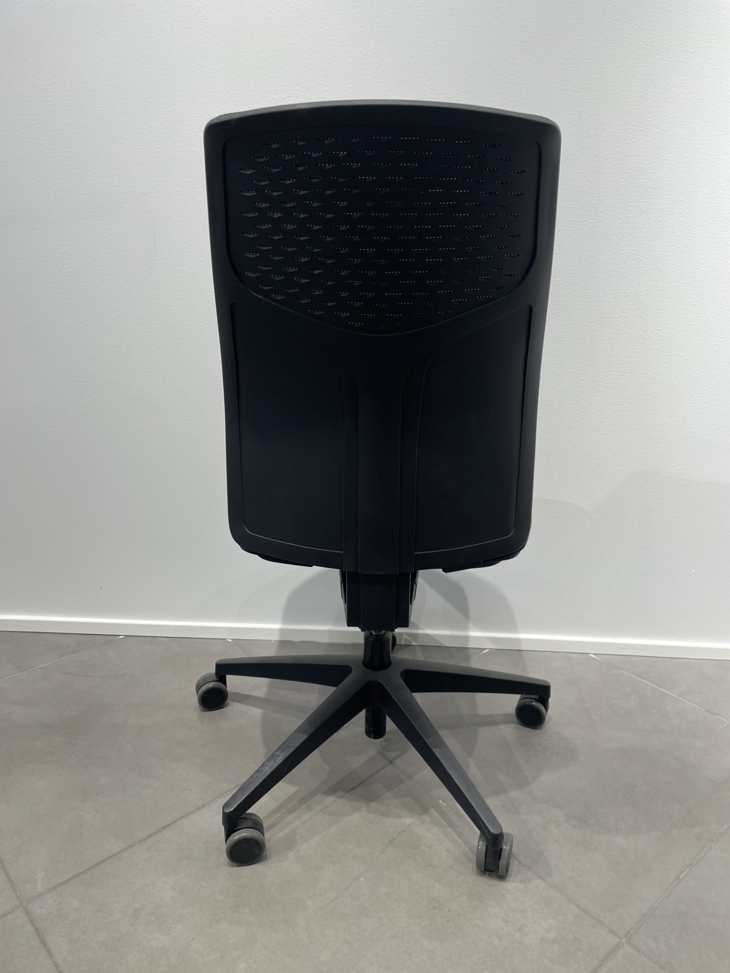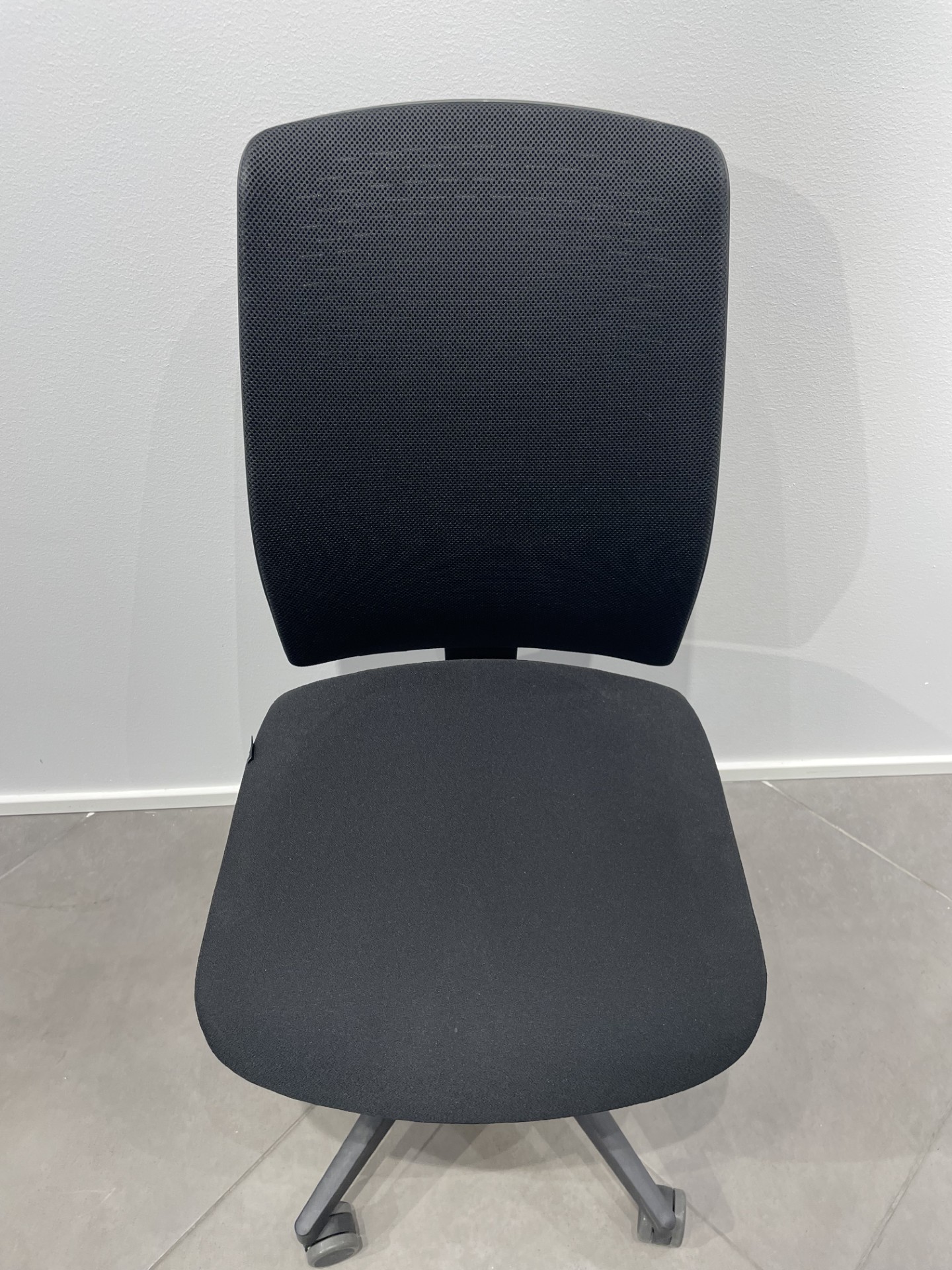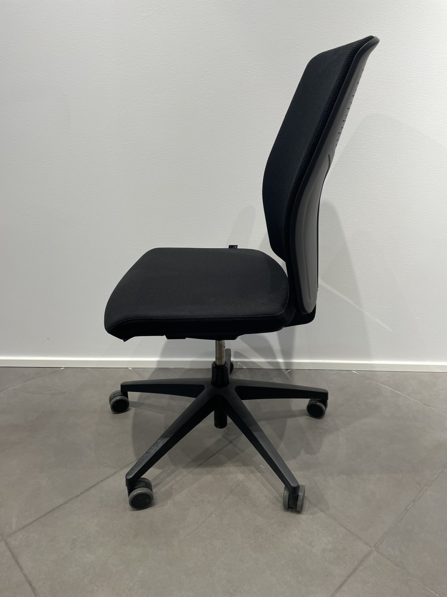 Sæde i stof (sort). Ryg i mesh (sort). Fodkryds i metal (sort). Højdejusterbar.
