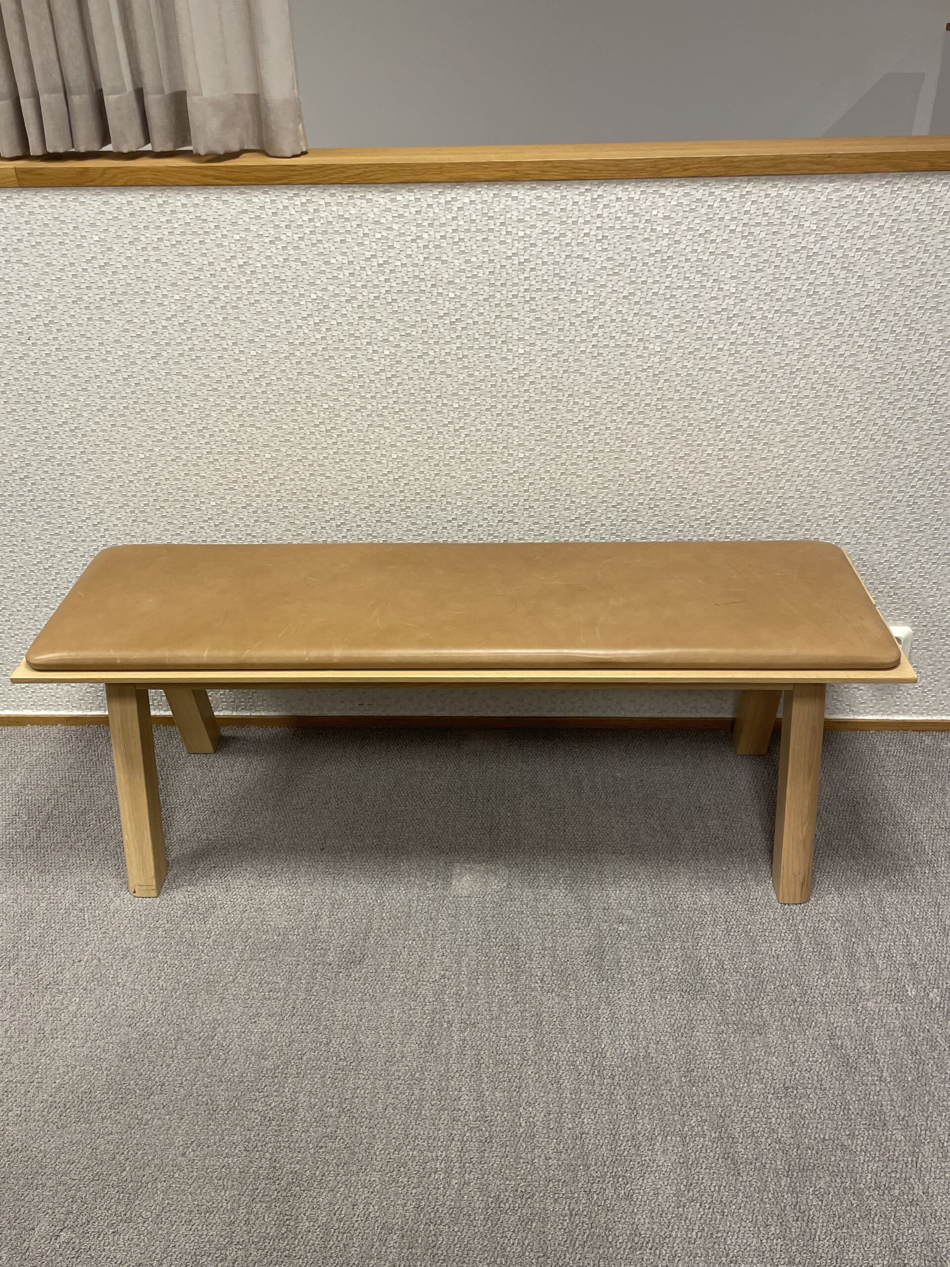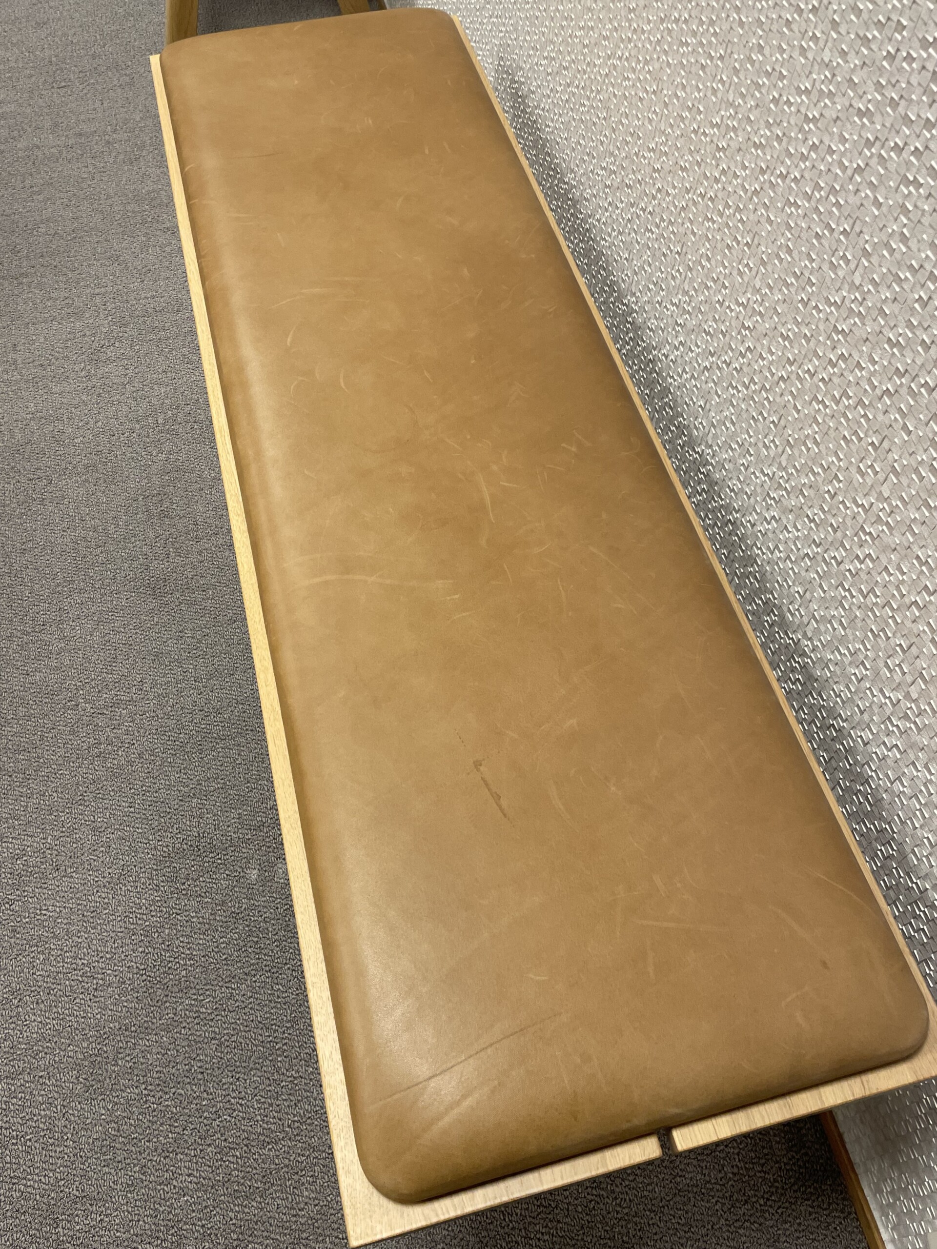 Sæde i læder (brun). 4-bensstel i træ (eg).