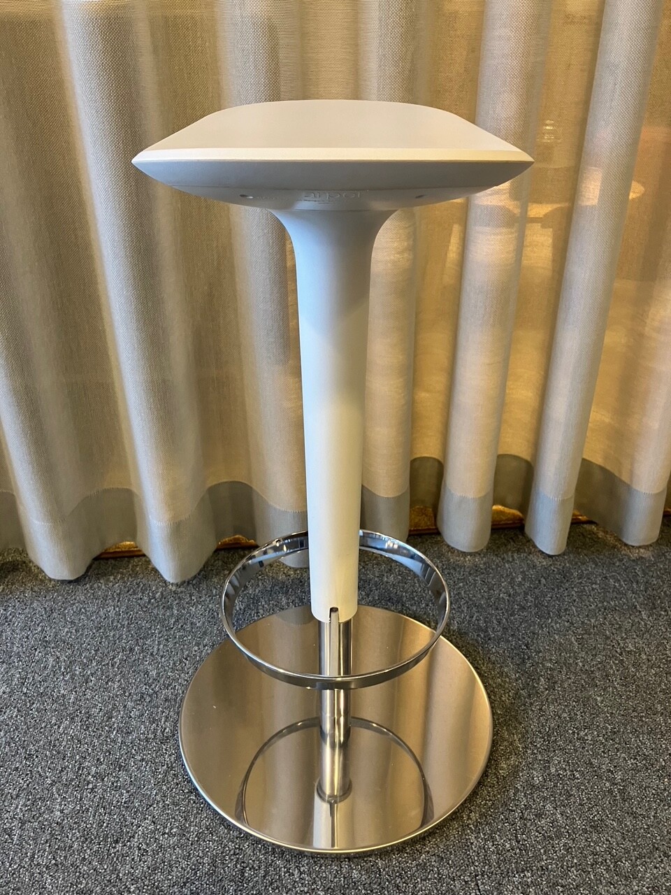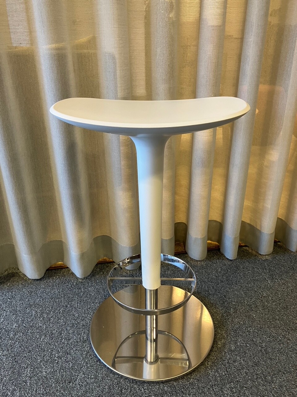 Sæde i plast (hvid). Søjlefod i metal (krom).