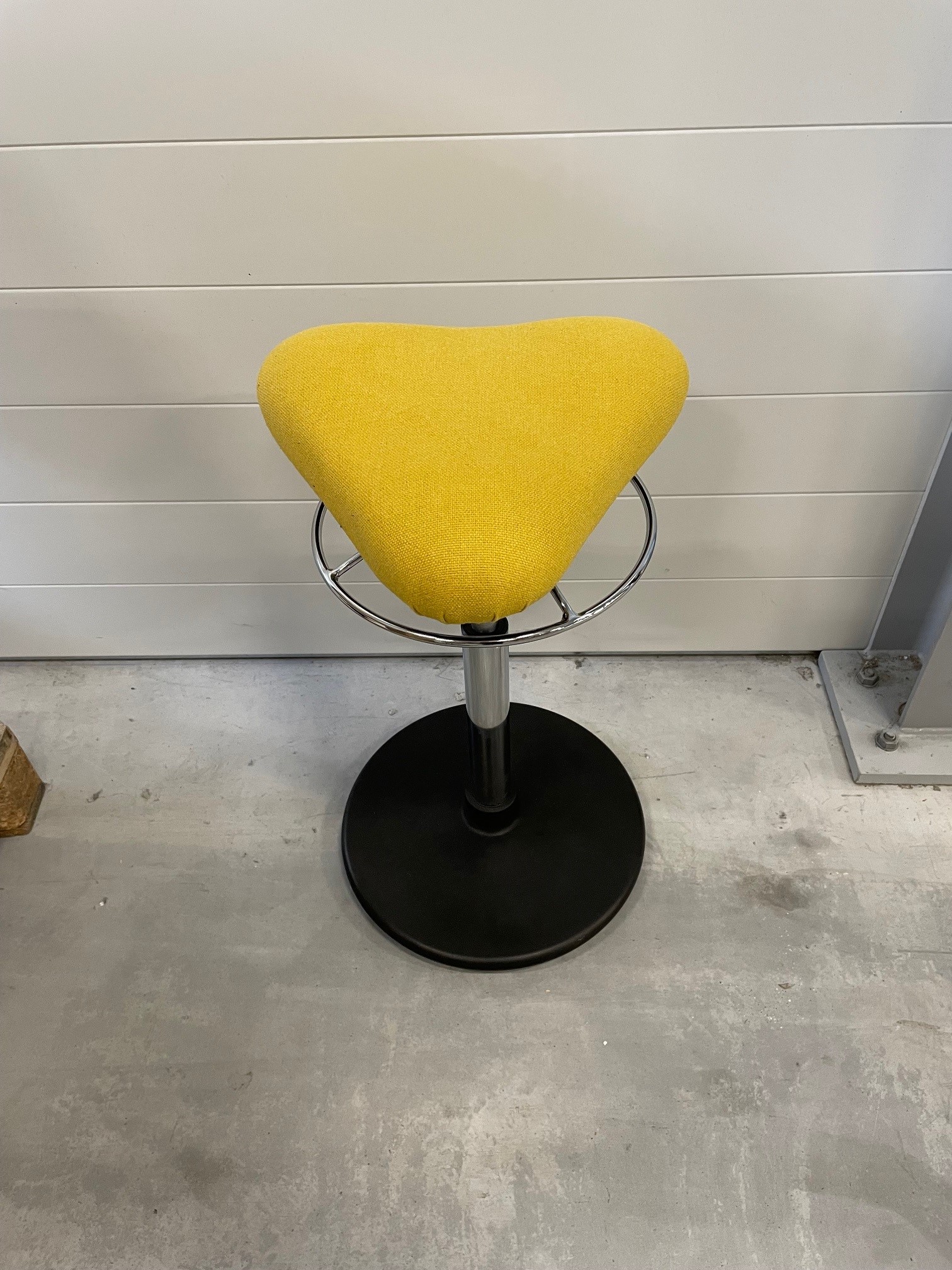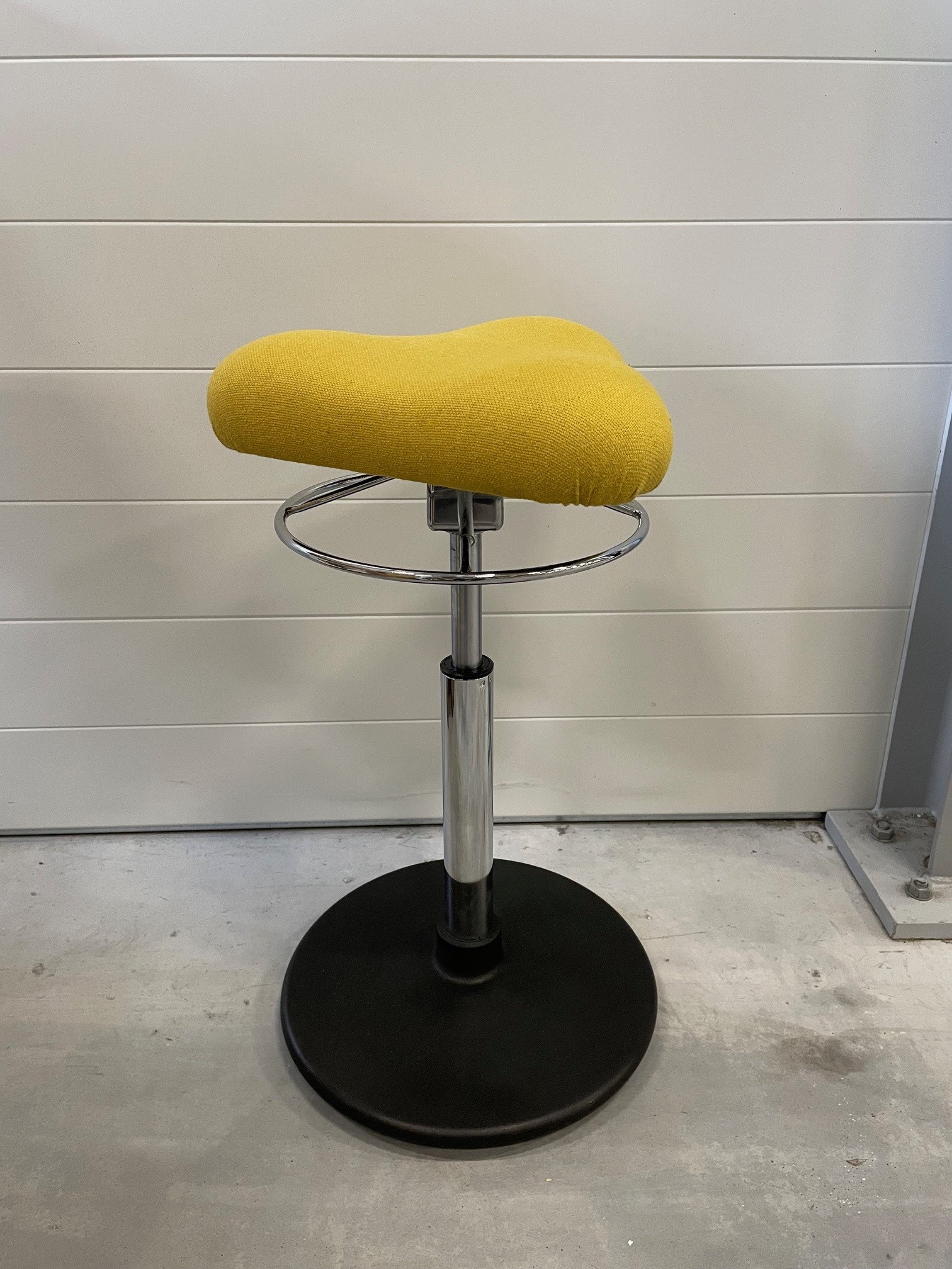 Sæde i stof (gul). Søjlefod i metal (aluminium).